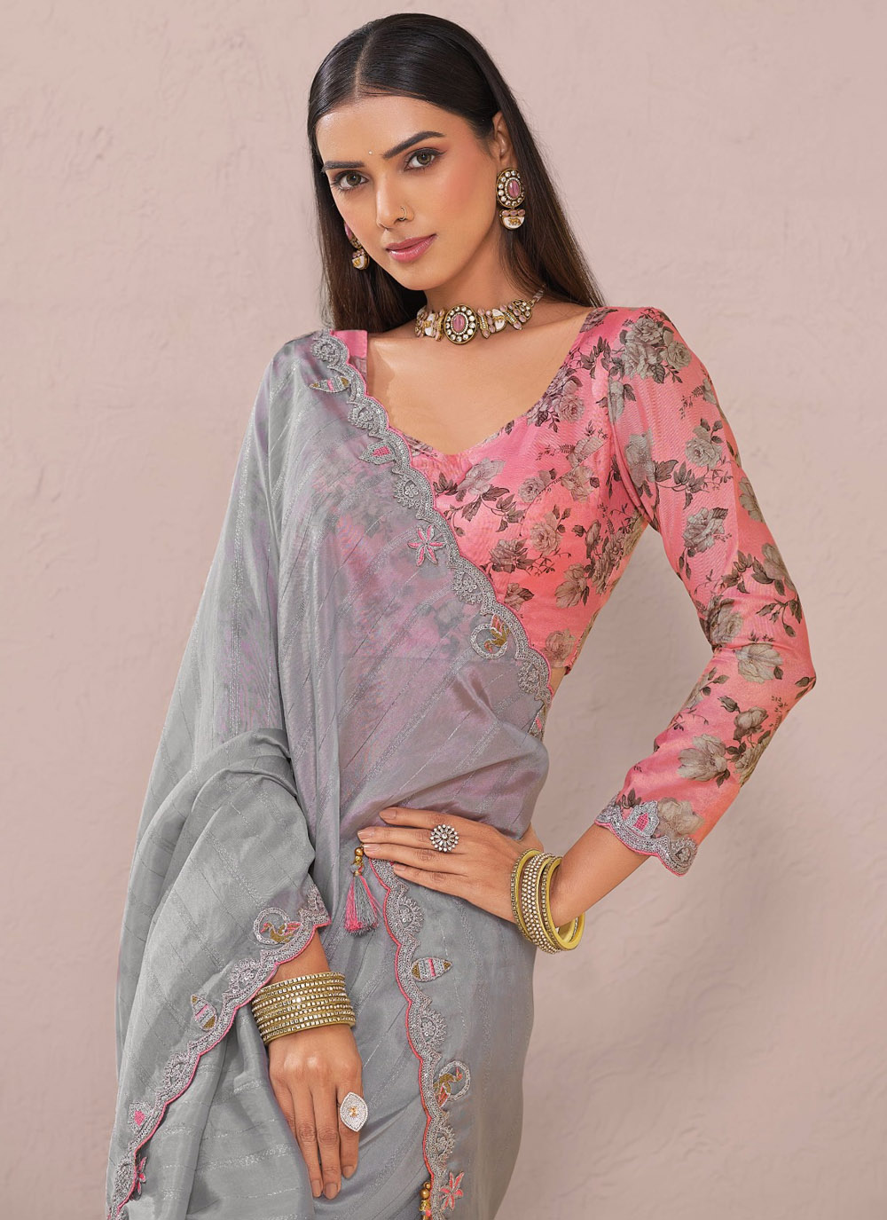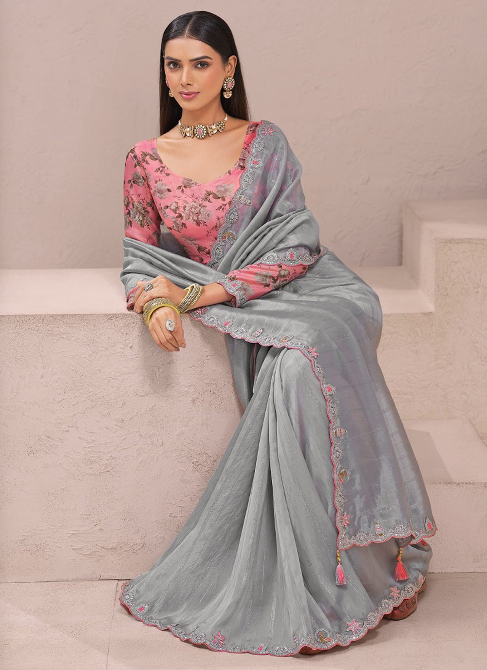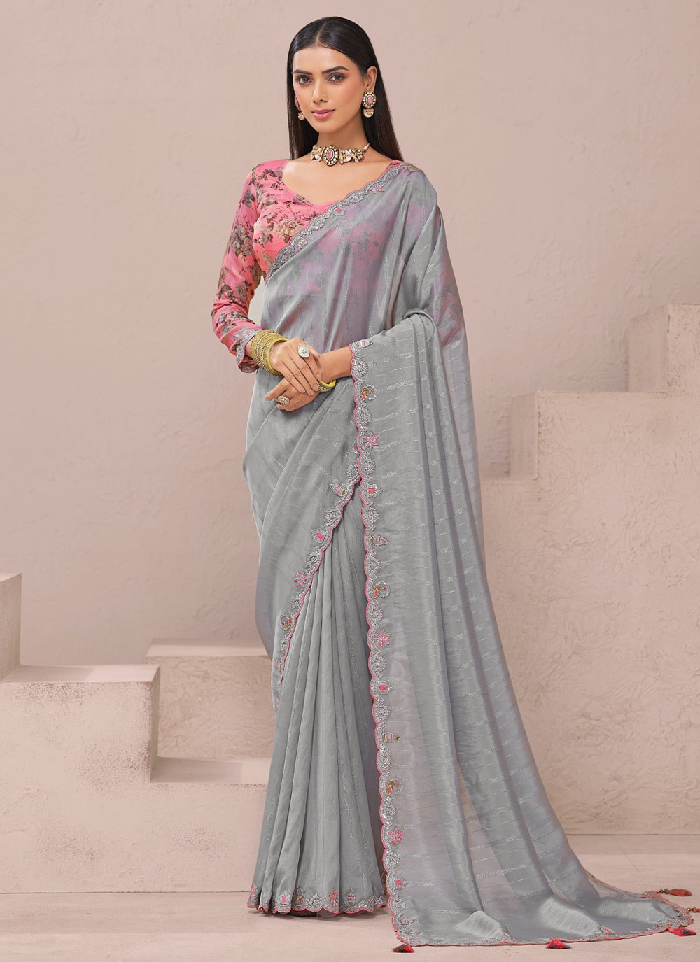 This grey contemporary saree in premium fancy fabric is designed for the modern woman. Accentuated with intricate cut work and a finely embroidered border, it offers a refined, graceful look—ideal for reception parties or functions. Comes with matching blouse.