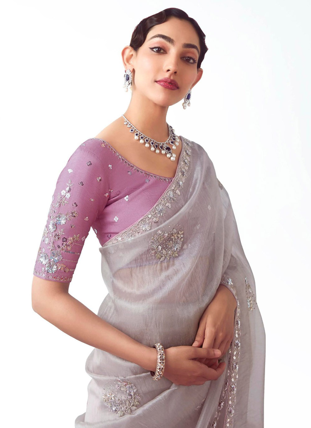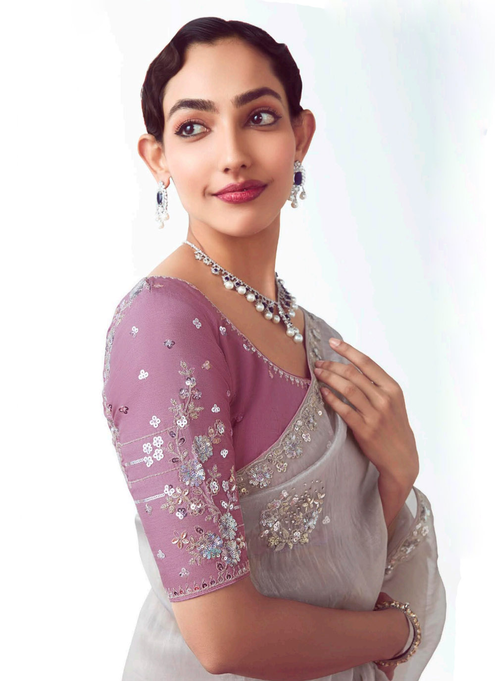 Elegance takes center stage with this Grey Designer Saree, meticulously crafted in premium fancy fabric. Lavishly adorned with shimmering sequins and fine zari embroidery. it’s the perfect choice for wedding receptions and festive soirées. Comes with matching blouse.