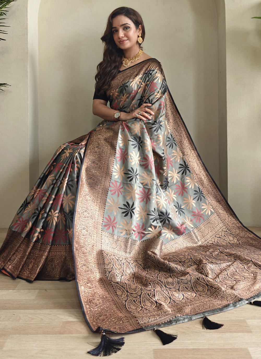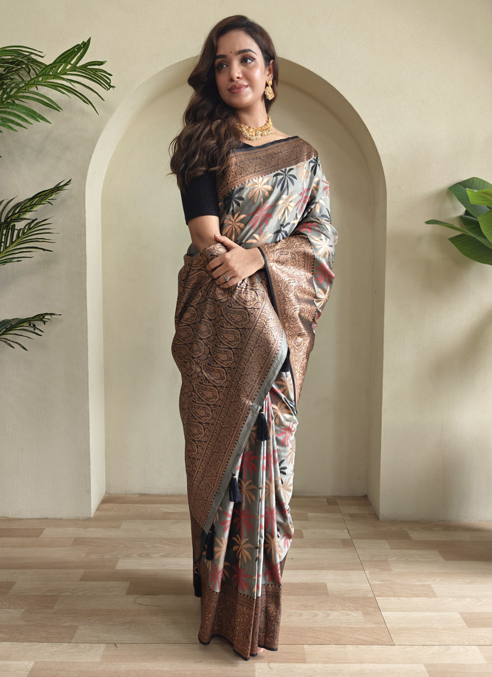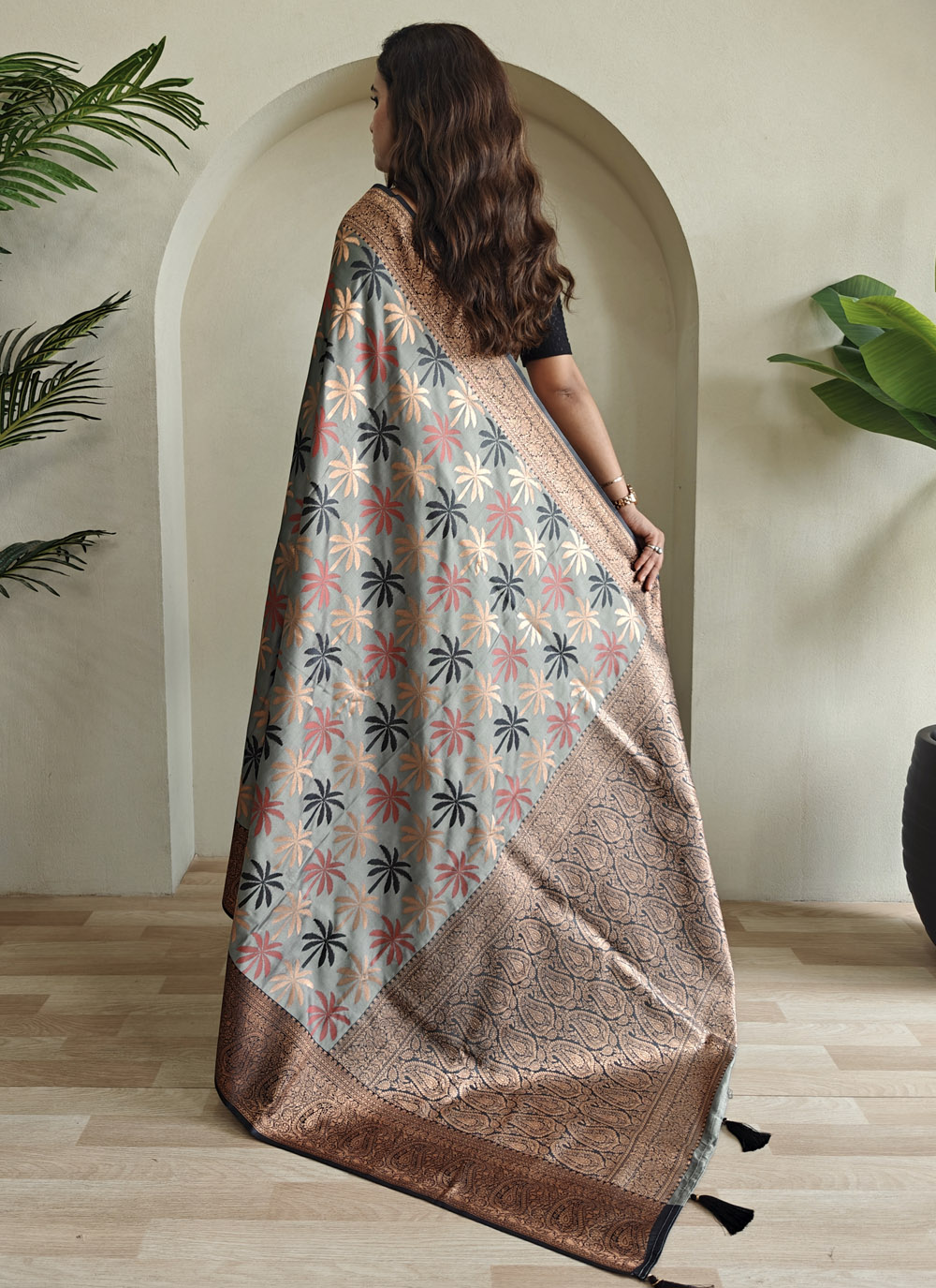 Elevate your ethnic collection with this elegant grey silk saree, highlighted by detailed jacquard work across the drape. Its understated sheen and classic design make it a versatile choice for formal events and traditional gatherings. Comes with matching blouse.