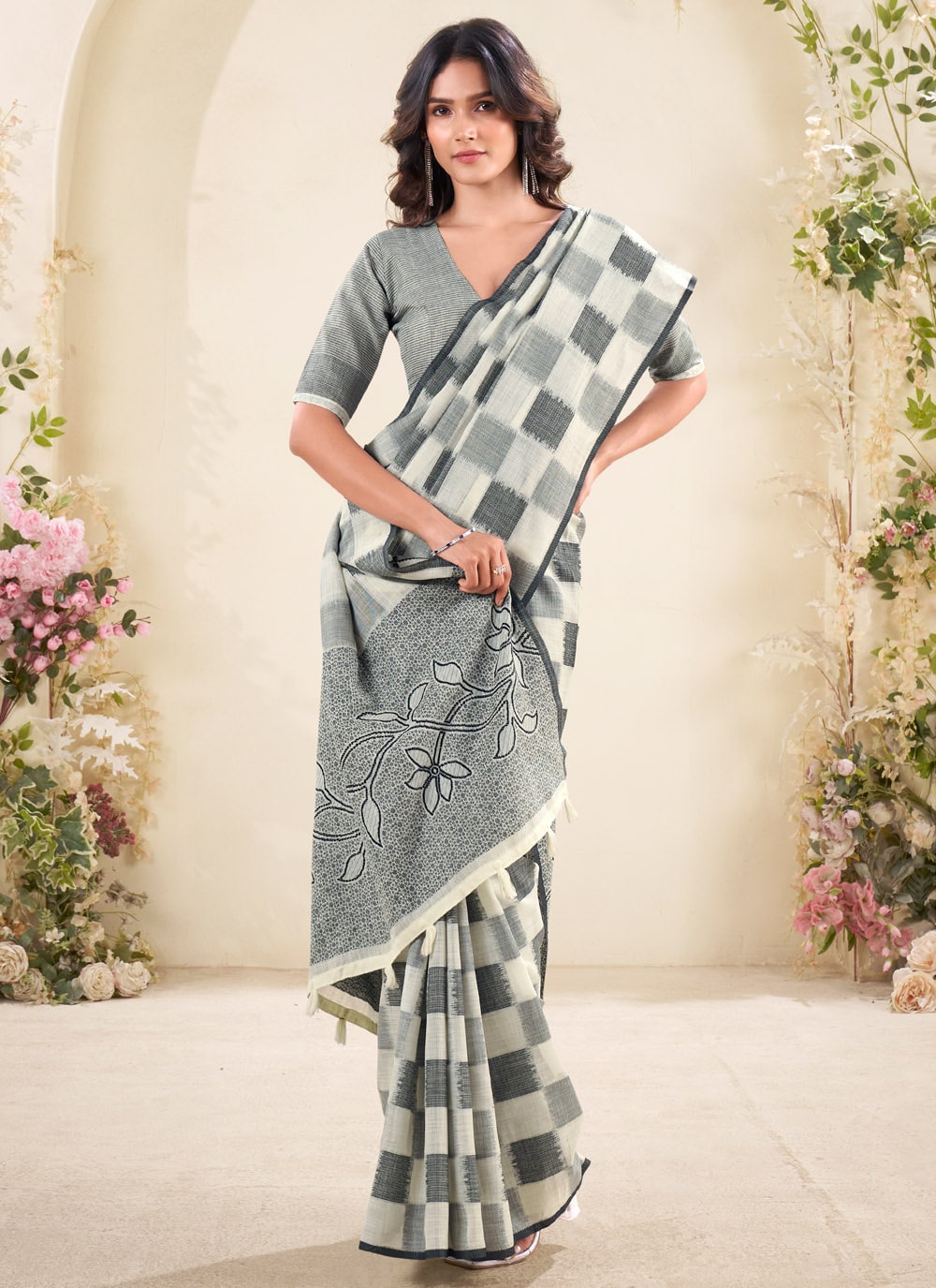 Add understated grace to your wardrobe with this Designer Grey Linen Silk Saree, featuring timeless check patterns woven into the fabric. A lightweight yet classy choice. Comes with matching blouse.