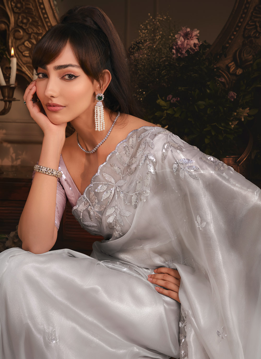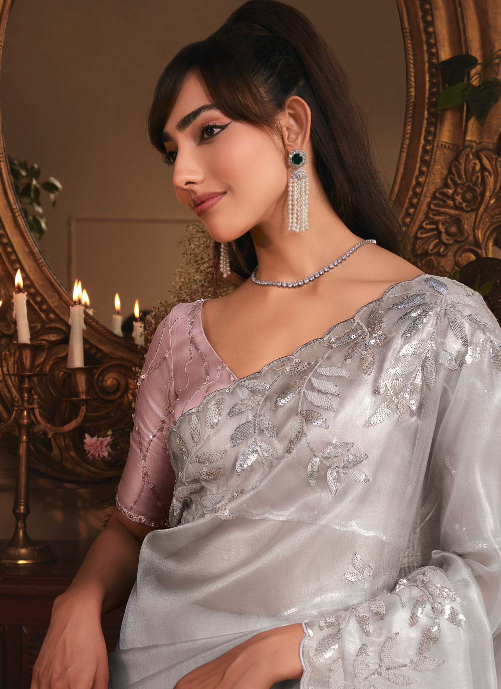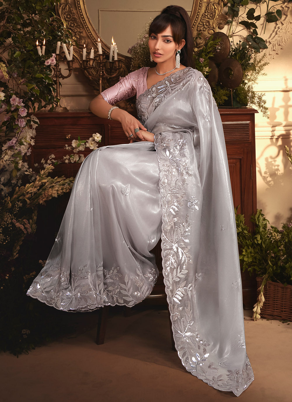 Designed for a modern appeal, this Grey Organza Saree features embroidered sequins and cut work finish on the border. Lightweight and stylish, it is a great choice for parties, engagement events and receptions. Comes with matching blouse.