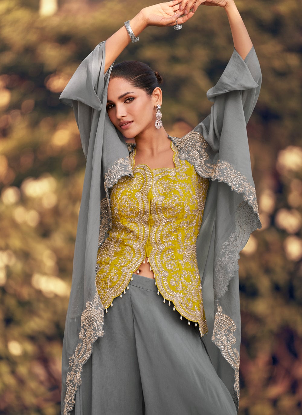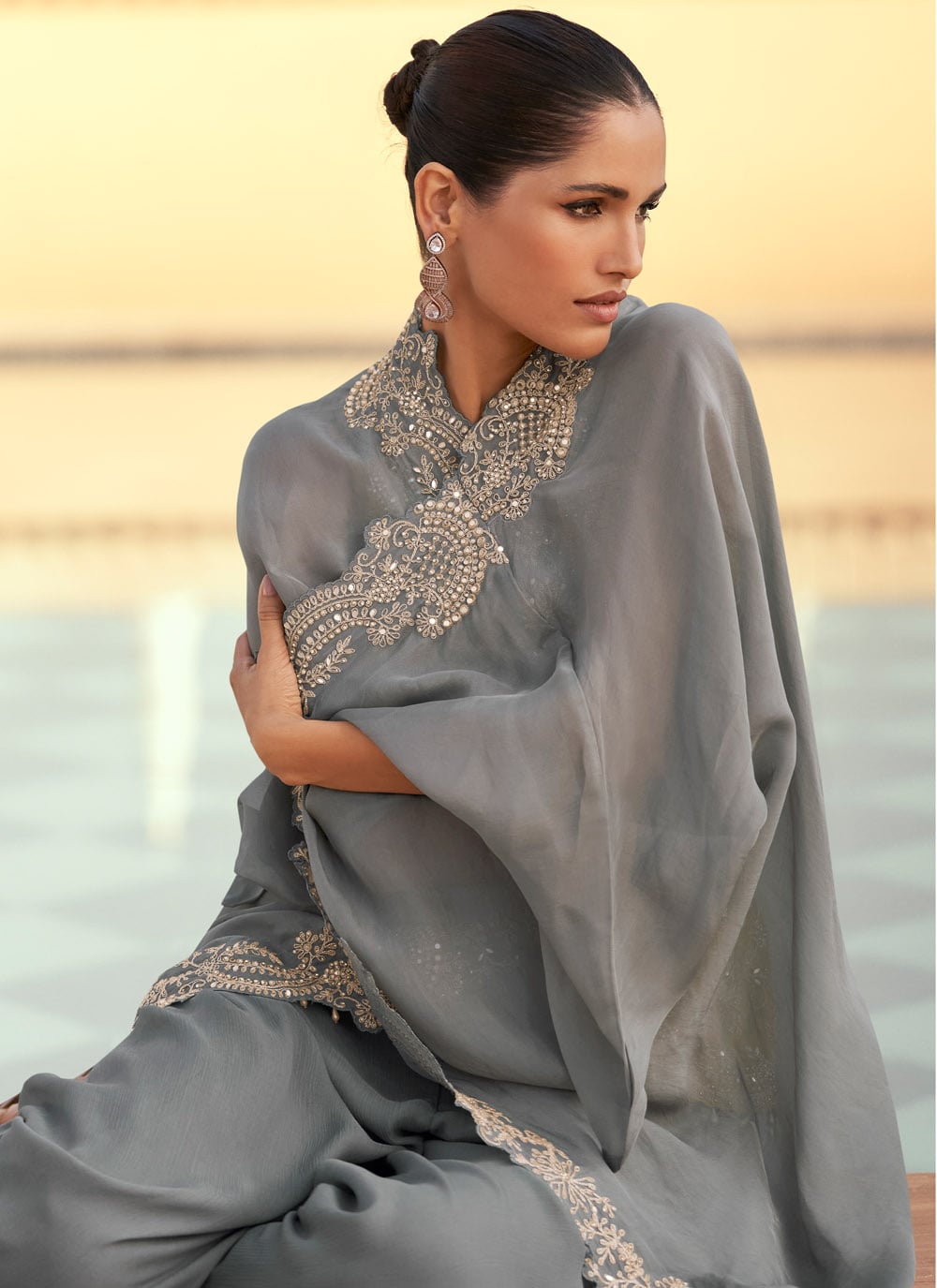 This Designer Salwar Suit in Grey Organza Silk is adorned with exquisite zari and stone work. Tailored for modern sophistication, it features graceful embroidery that adds depth and shimmer. Comes with matching bottom and dupatta.