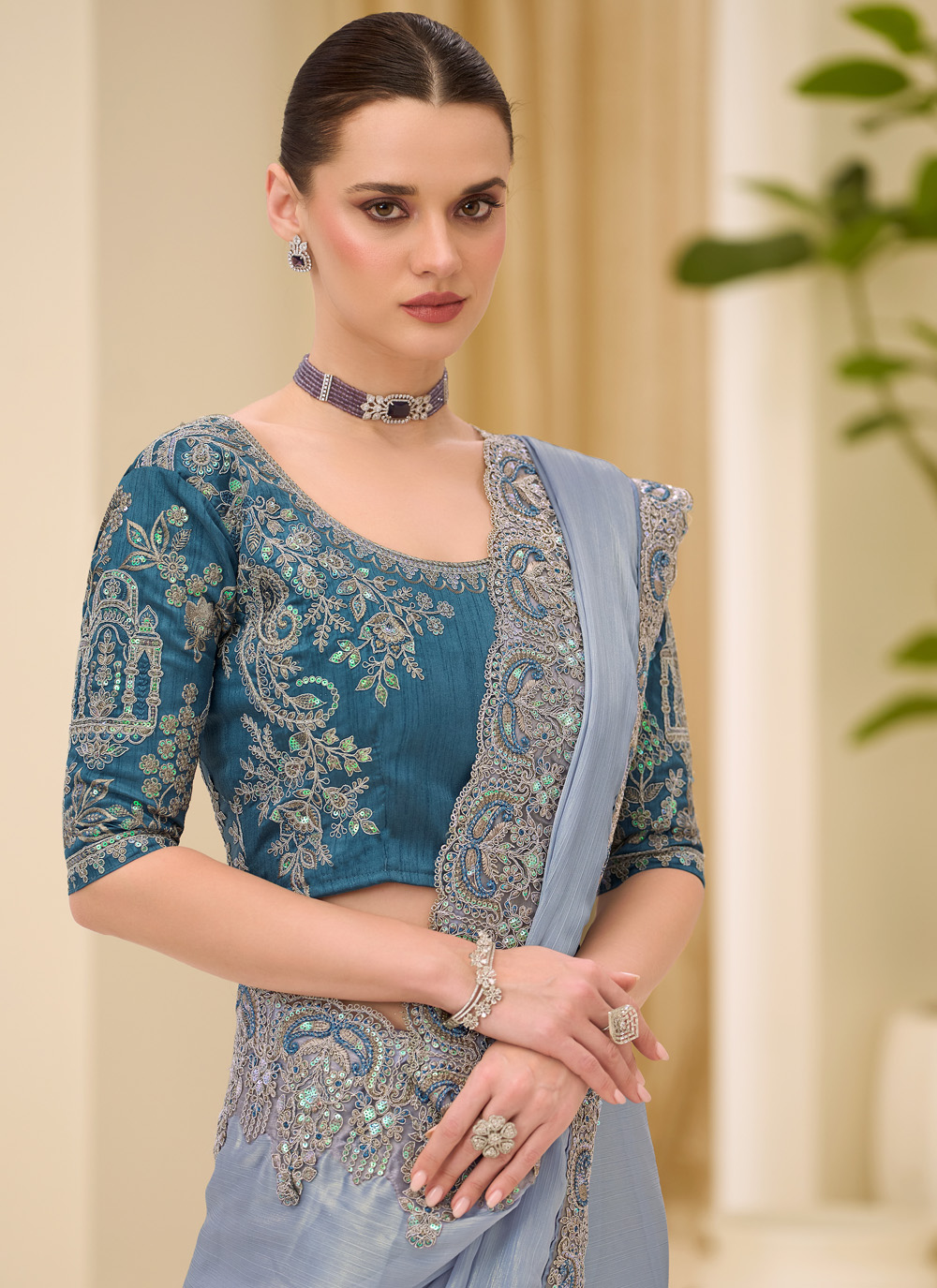 Stylish and sophisticated, this grey shimmer satin saree features intricate embroidered border work that highlights its elegant design. The soft shine and smooth drape make it a wonderful choice for festive gatherings and cultural occasions. Comes with matching blouse.