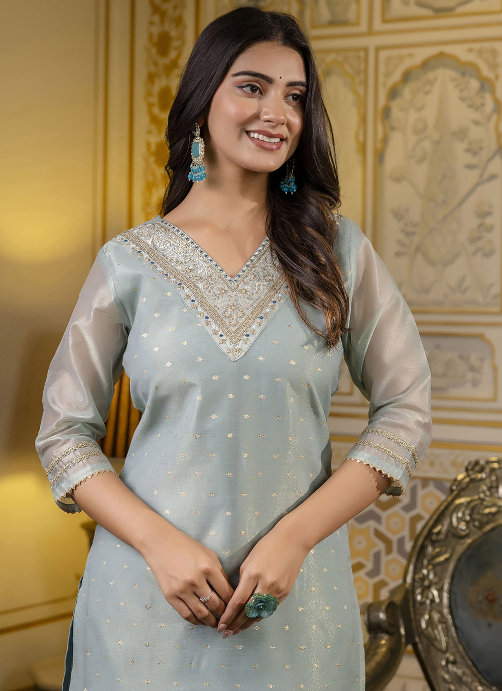 This Grey Embroidered Casual Kurti strikes the perfect balance between simplicity and sophistication. The fine zari work adds depth and texture, while the silk blend fabric ensures comfort for all day wear.