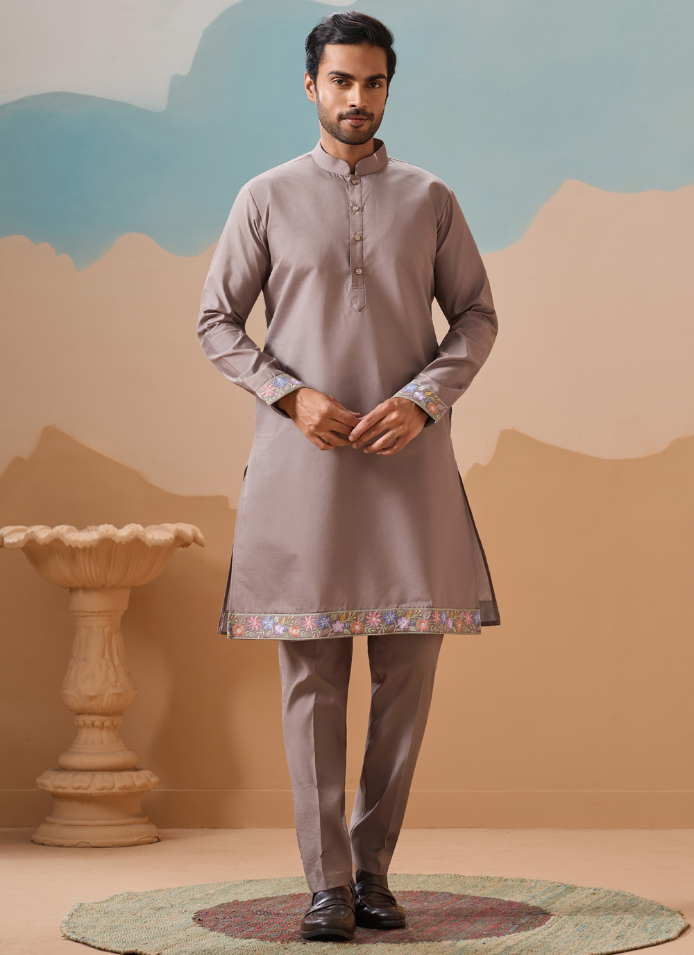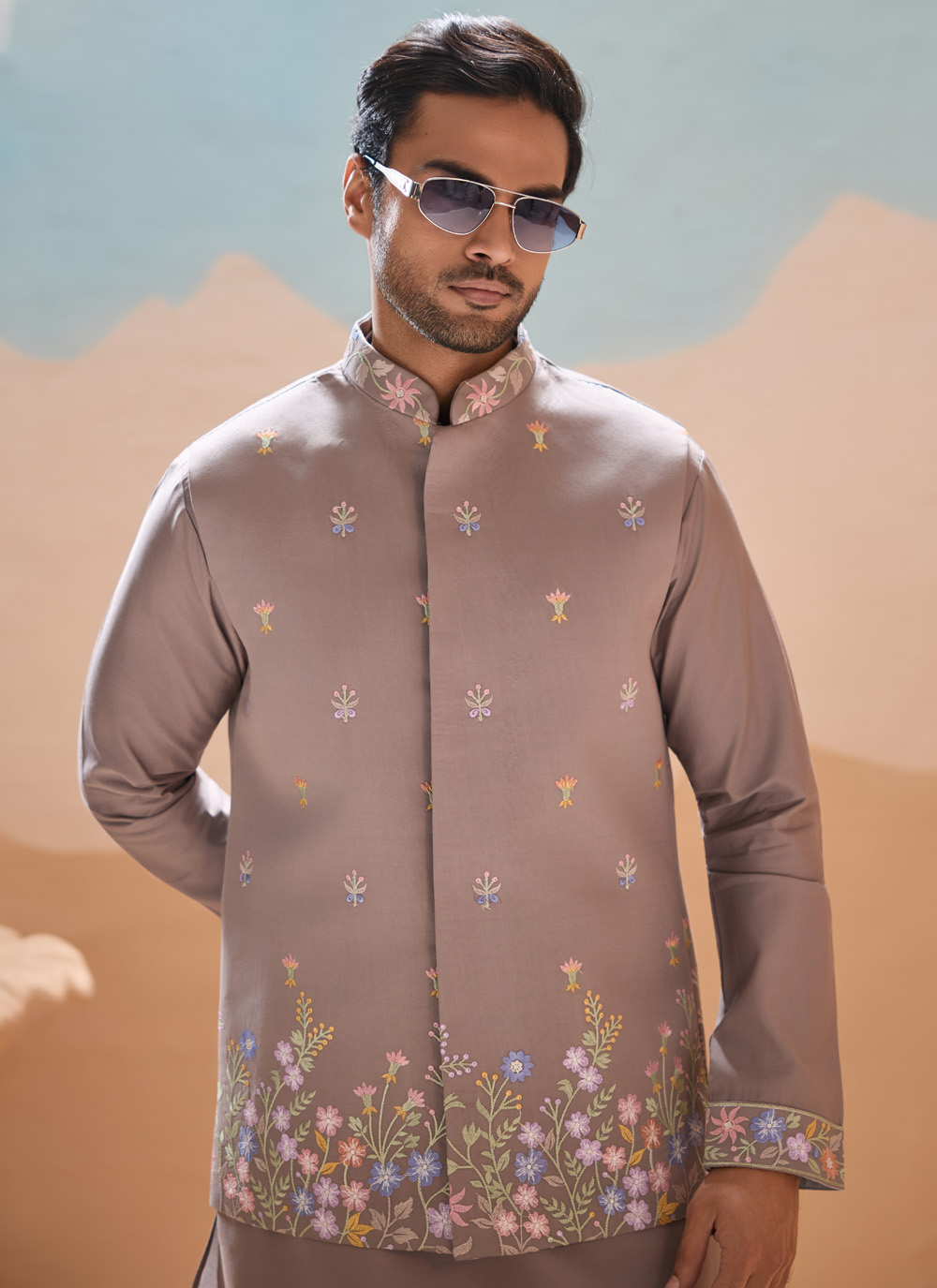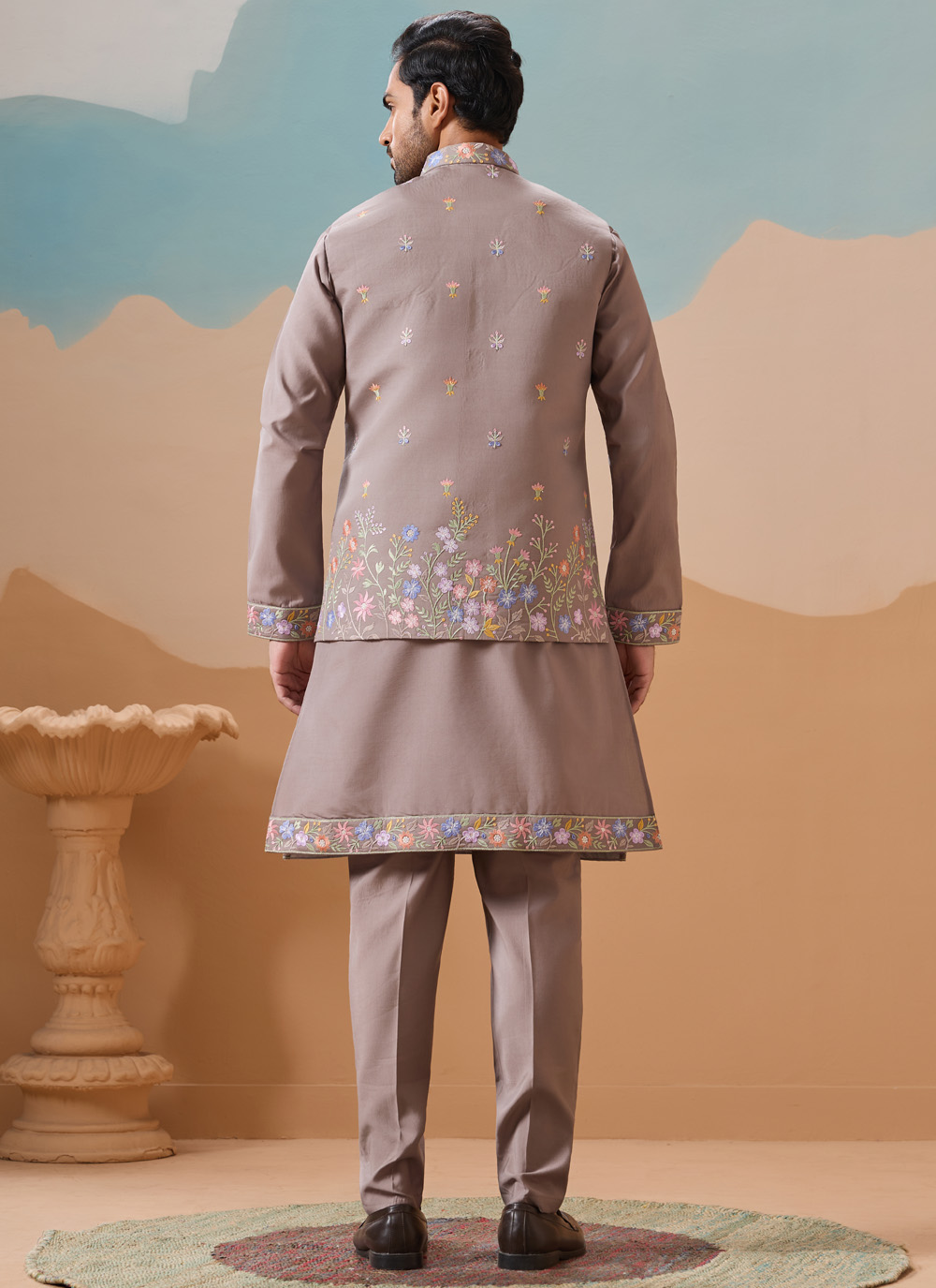 Crafted from high-quality silk, this embroidered grey kurta pyjama ensures a smooth, breathable feel while maintaining a rich drape. The jacket adds a structured layer for a complete ceremonial look.