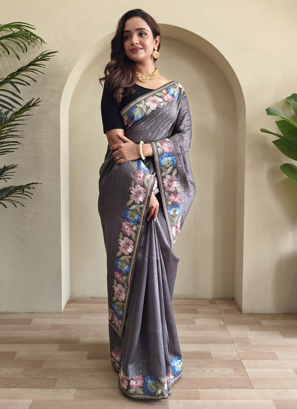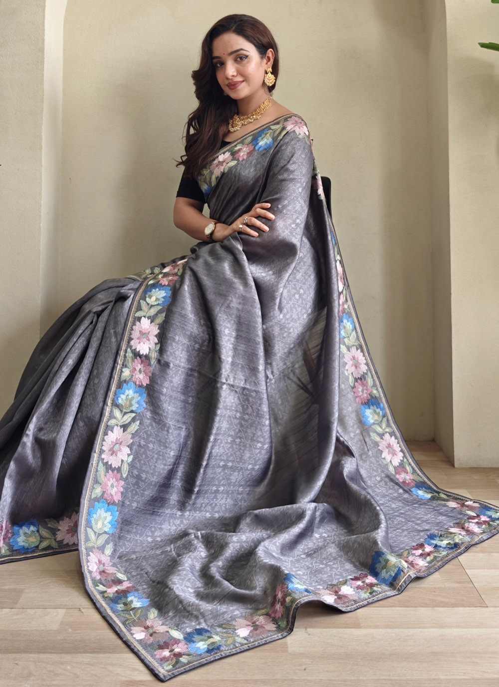 This stylish grey Tussar silk saree showcases intricate thread embroidery along the borders that beautifully contrast the muted tone. Its graceful drape and contemporary charm make it an ideal choice for receptions and cultural events. Comes with matching blouse.