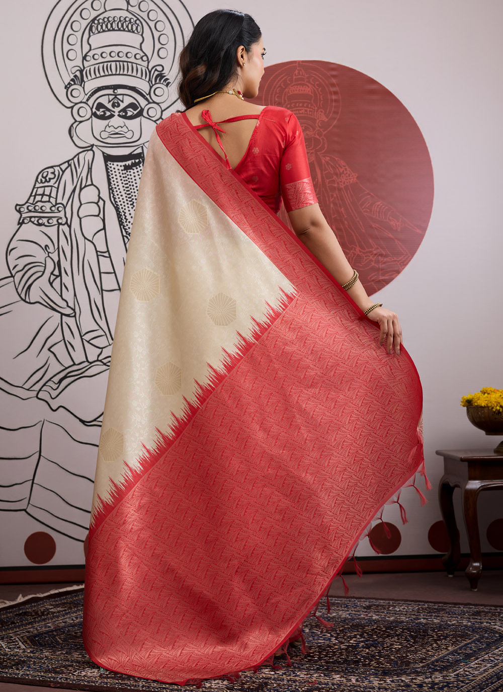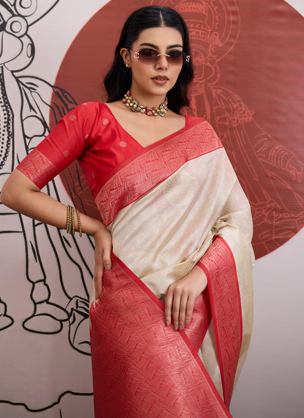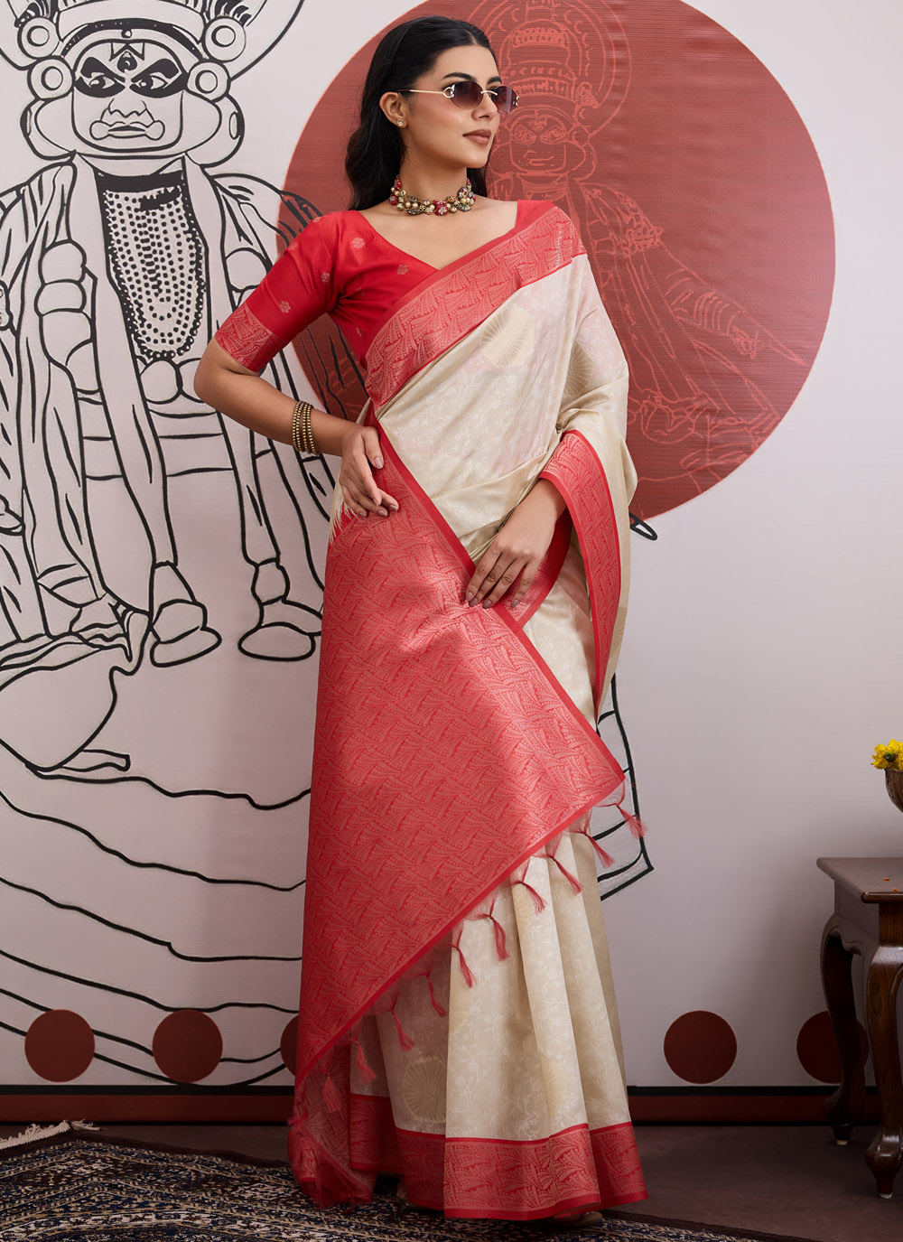 This red and cream handloom silk saree features beautiful zari weaving that highlights traditional craftsmanship with a trendy touch. The vibrant red paired with soft cream creates a striking yet graceful ethnic look. Comes with matching blouse.