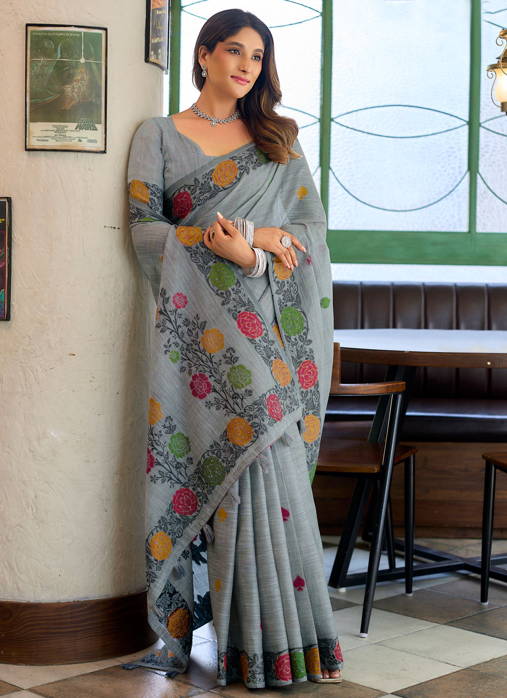 Elegant and sophisticated, this Jacquard Fancy Work Linen Classic Saree in Grey presents a refined blend of traditional weaving and contemporary style. Comes with matching blouse.