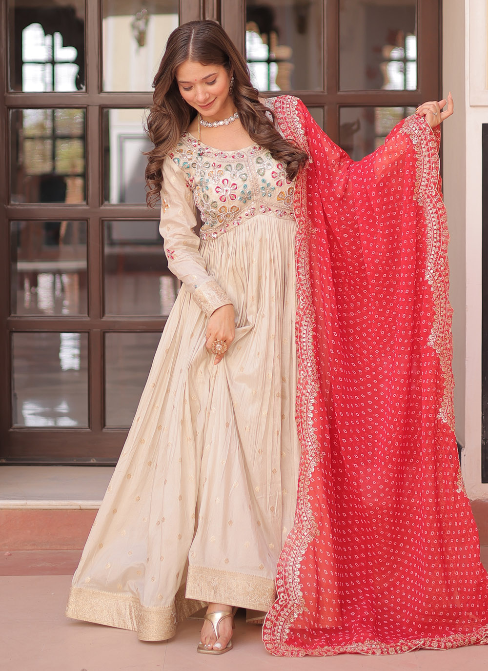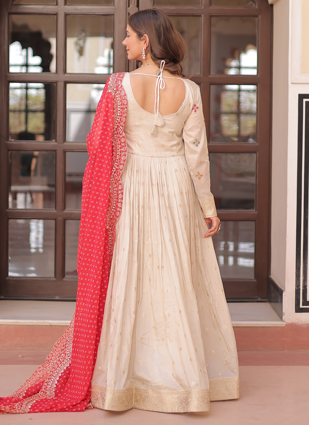 Elevate your occasion wear with this off-white jacquard gown, featuring beautiful weaving patterns and delicate embroidery. Its soft, graceful drape and understated shine make it perfect for festive events and elegant celebrations. Comes with matching dupatta.