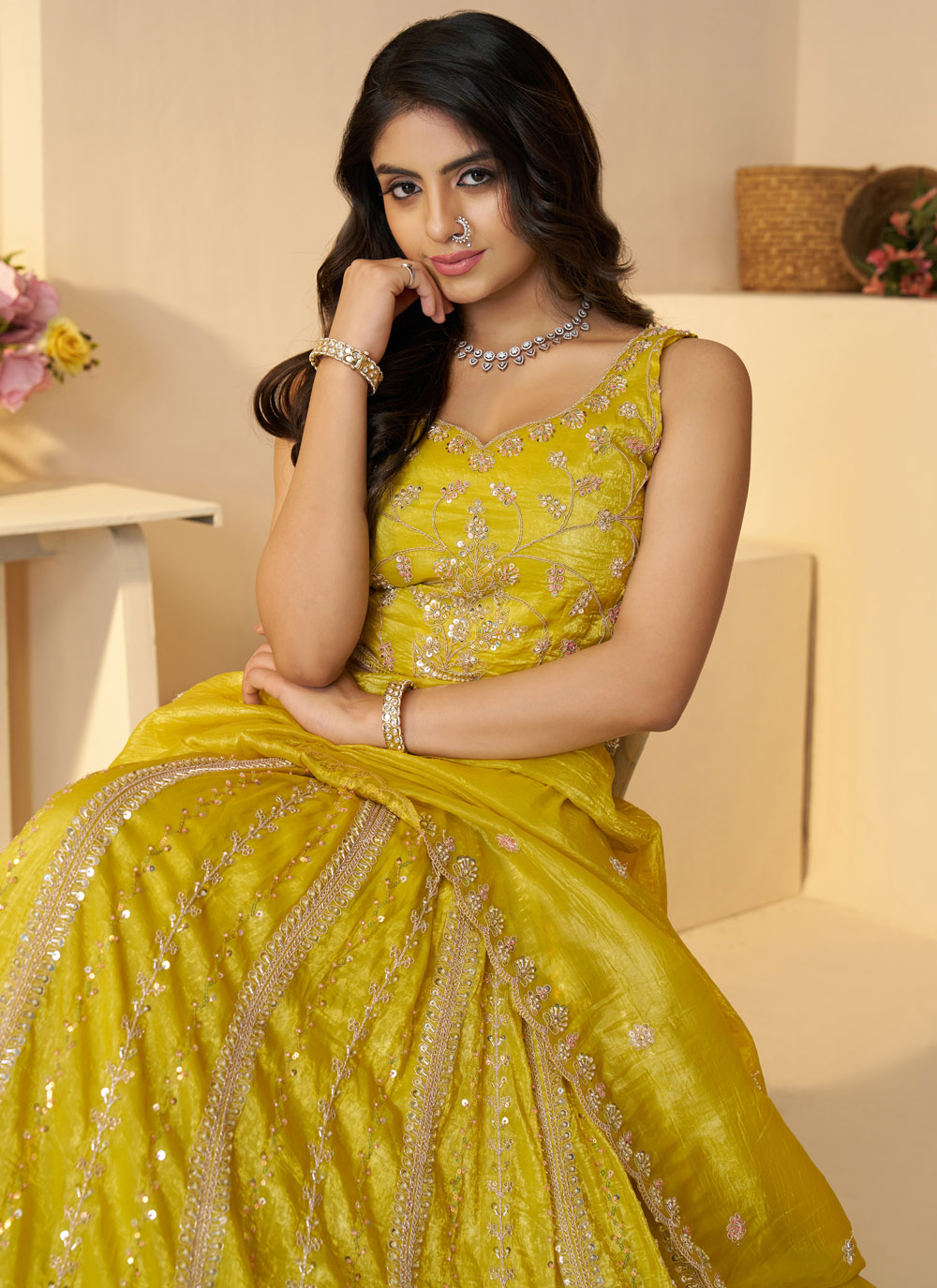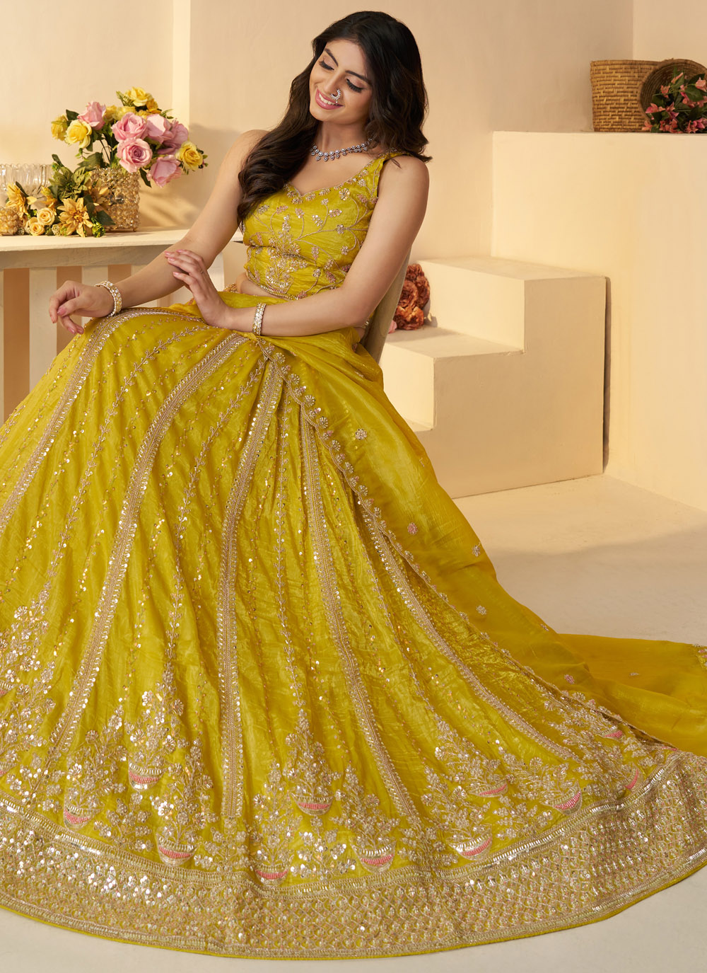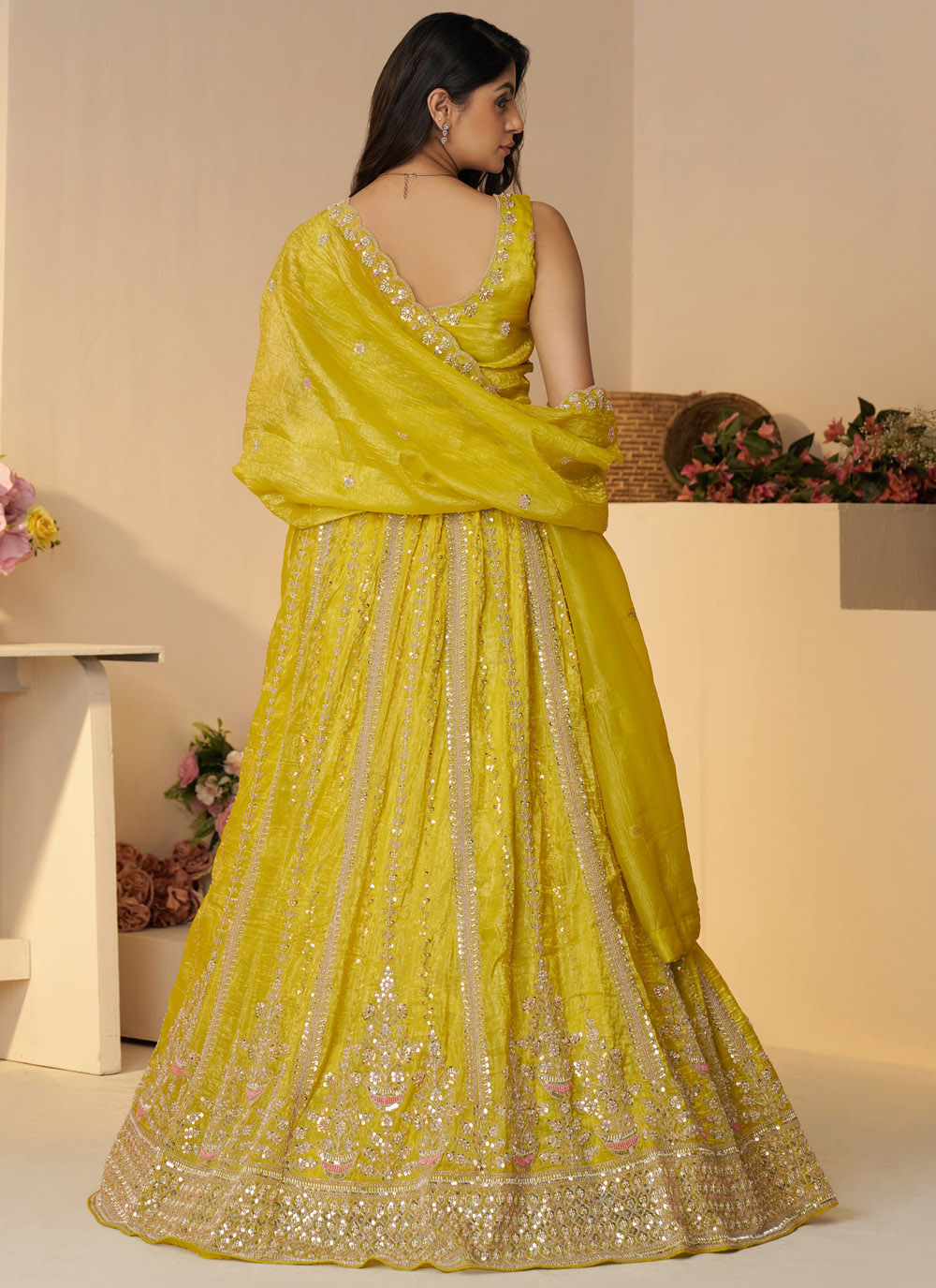 Celebrate your haldi with joy and style in this radiant yellow lehenga choli. Crafted from glossy Jimmy Chu fabric and adorned with sequins, zari, and cut dana embroidery, this ensemble is designed to shimmer in the sun and elevate your bridal glow. Comes with matching choli and dupatta.