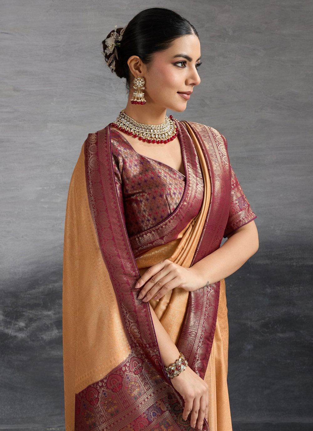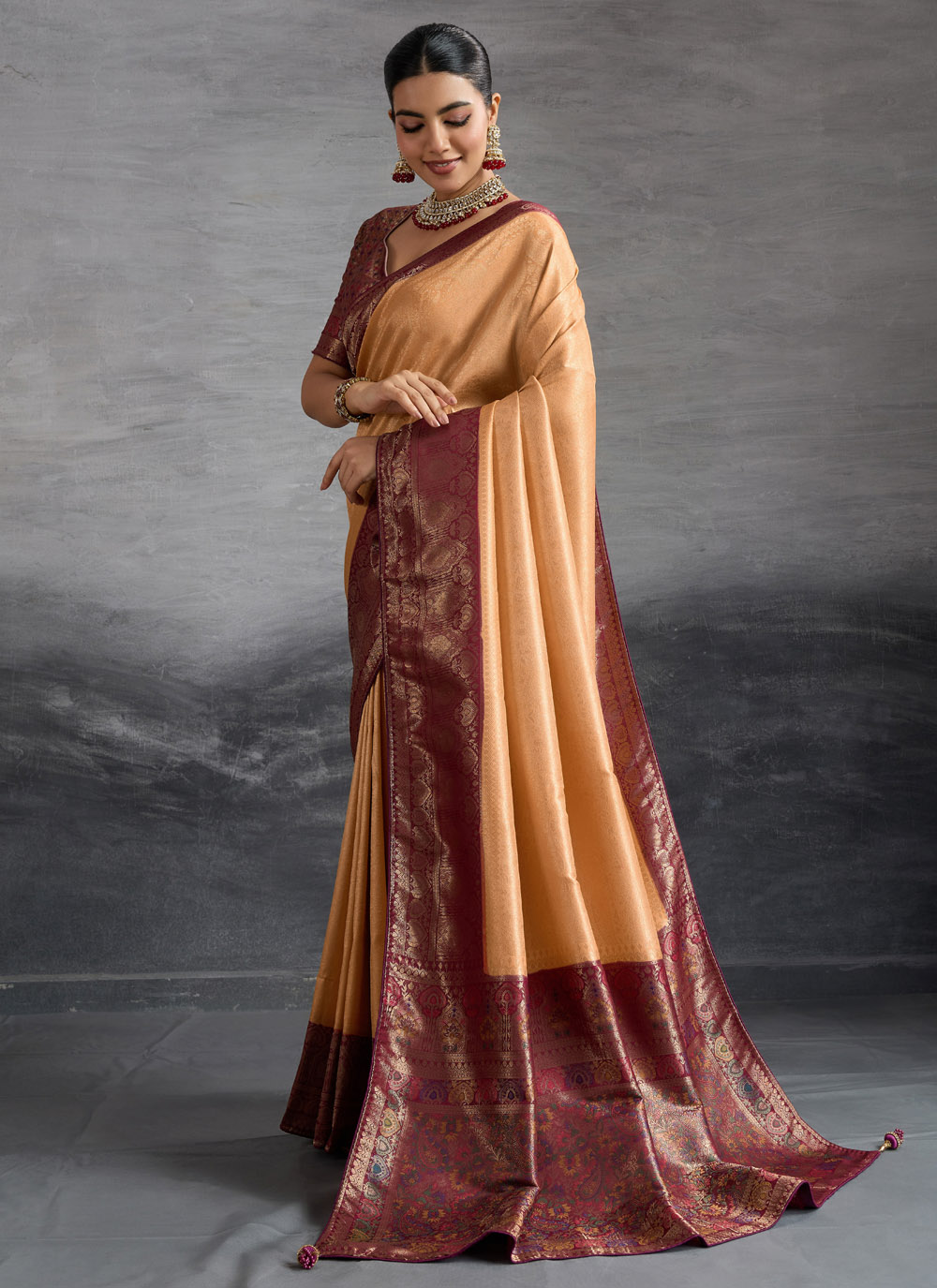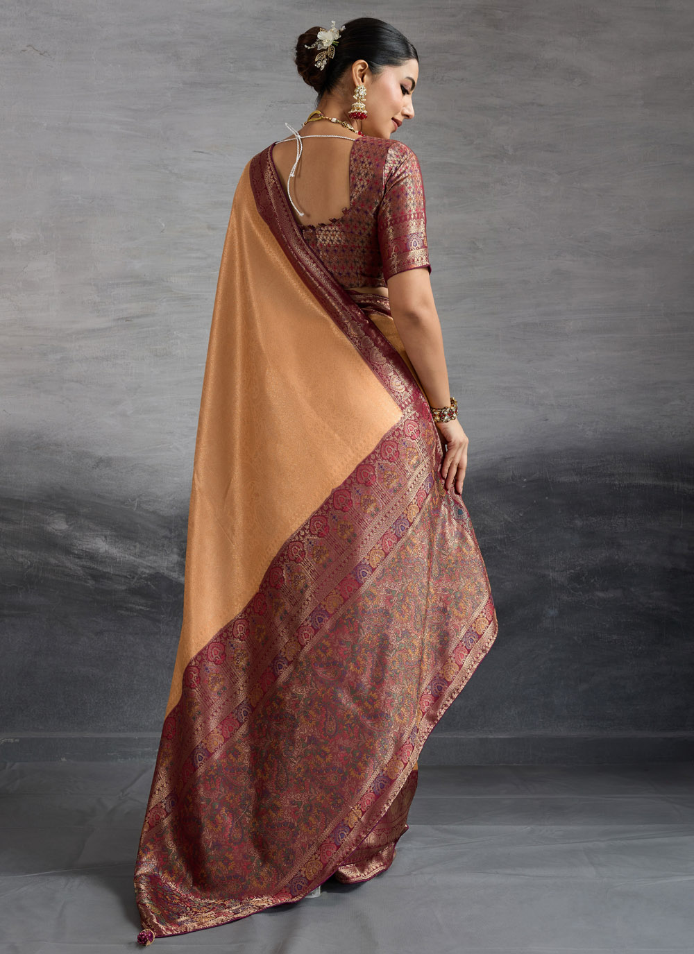 Step out in style with this trendy peach kanjivaram silk saree, woven with Meenakari and zari detailing. Perfect for cultural gatherings, parties and festive events. A must-have saree for timeless elegance. Comes with matching blouse.