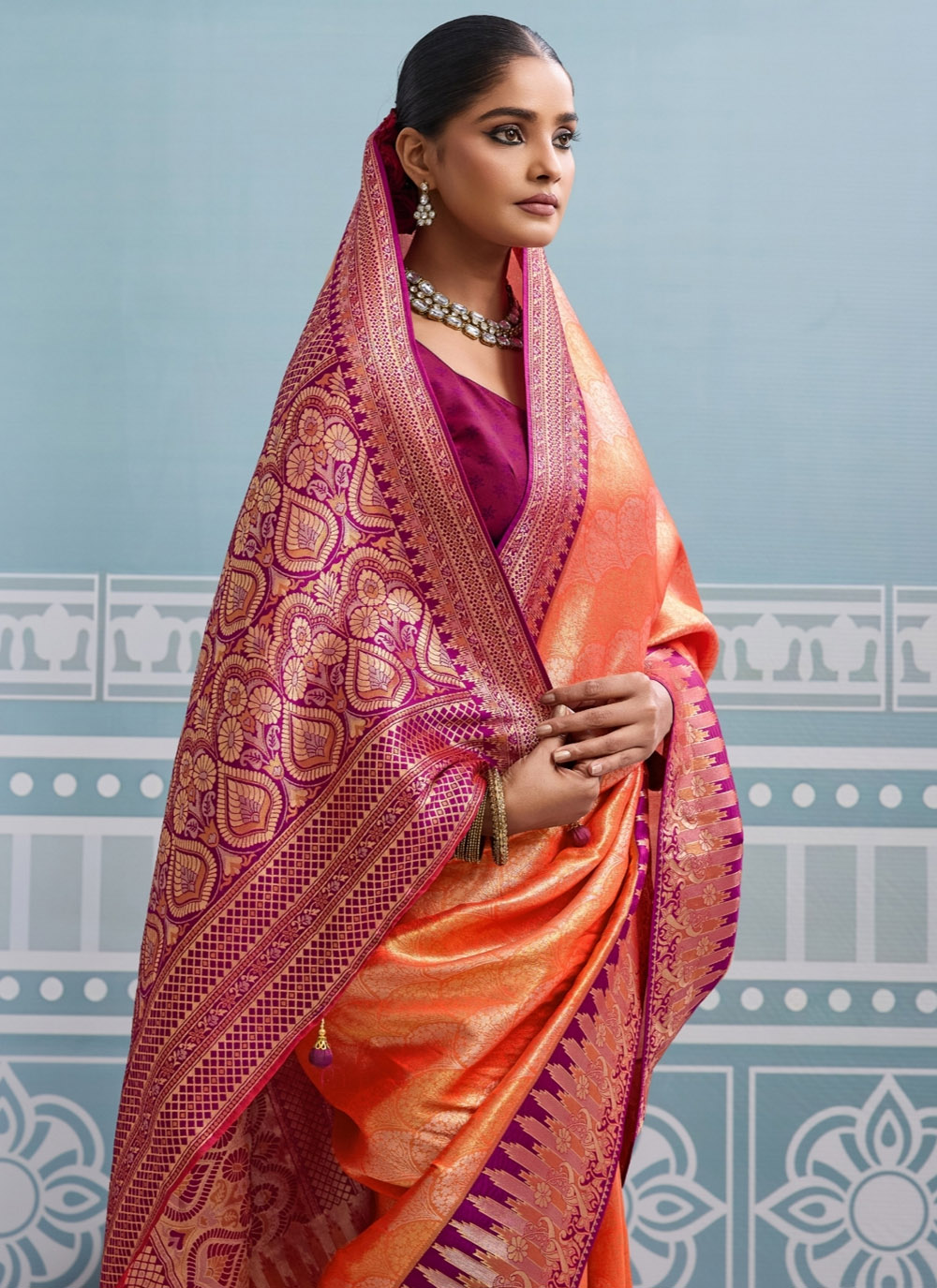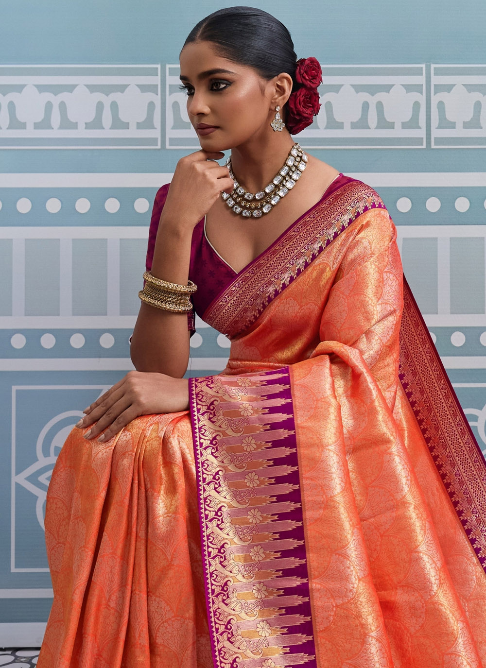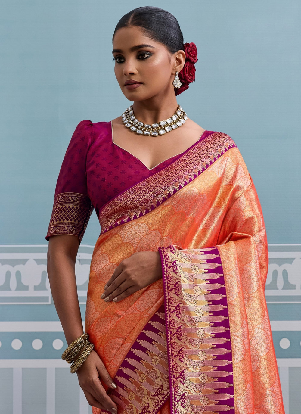 This trendy Kanjivaram silk saree in peach beautifully balances tradition with modern style. The detailed zari and meenakari weaving create a designer finish, making it a graceful outfit for family gatherings or cultural functions. Comes with matching blouse.