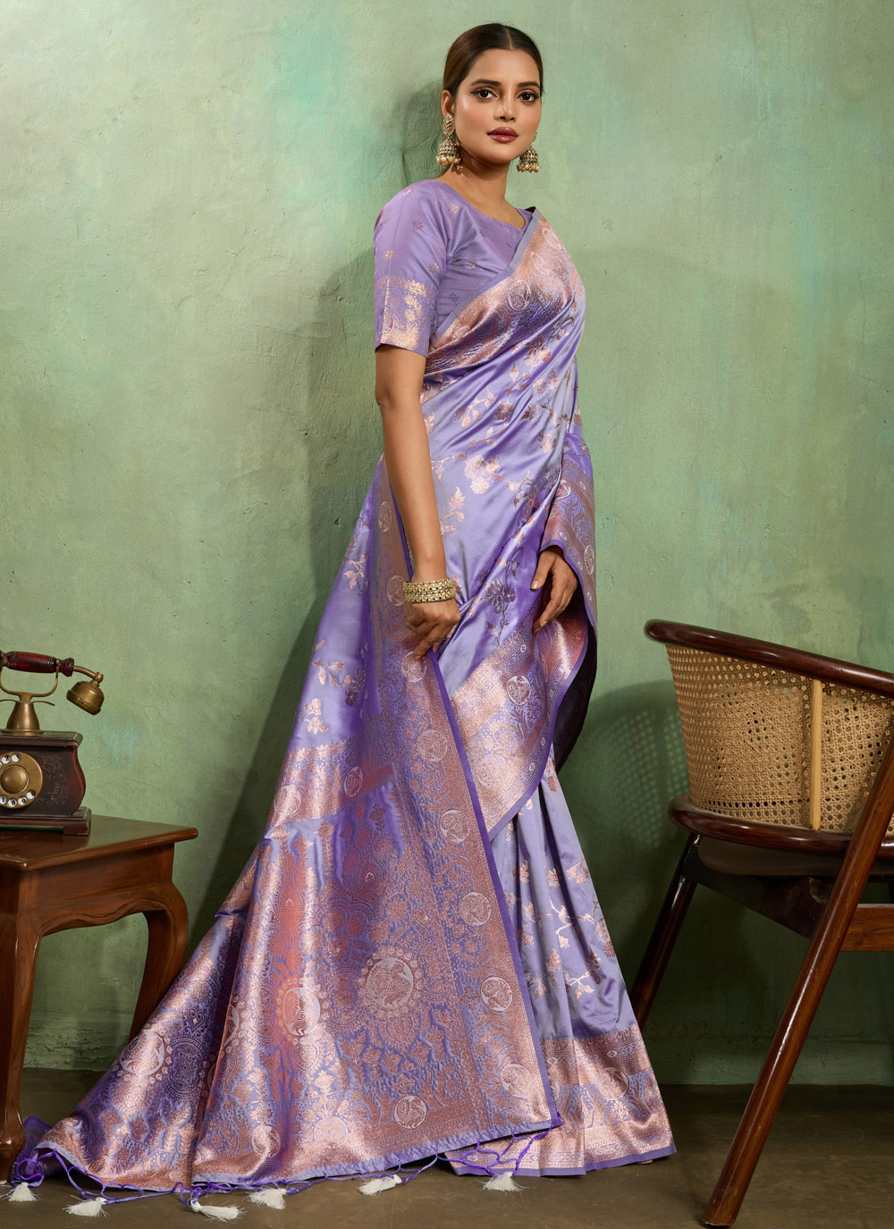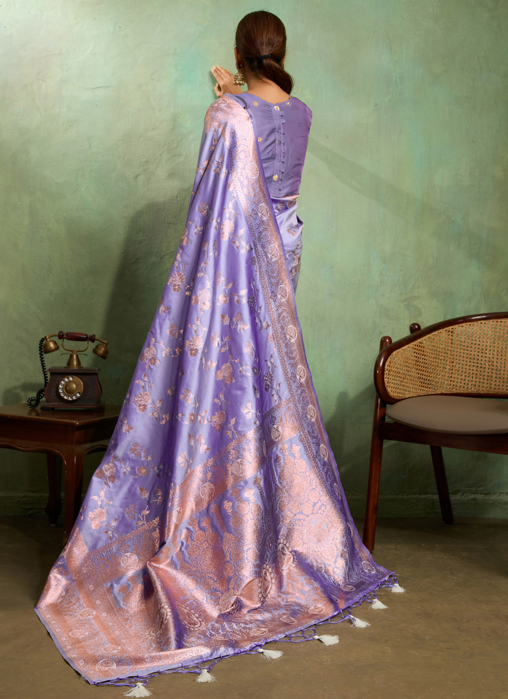 This lavender Banarasi silk saree blends traditional craftsmanship with contemporary style. Adorned with zari jaal weaving and subtle meenakari work, the silk fabric drapes elegantly, making it a standout piece for modern ethnic fashion. Comes with matching blouse.