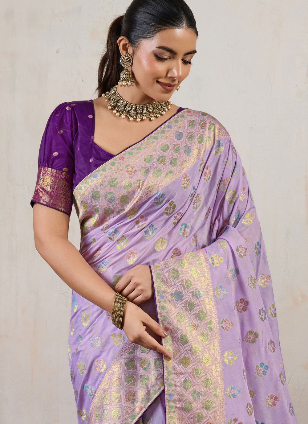 This lavender chiffon saree blends subtle beauty with traditional craftsmanship. Featuring detailed meenakari zari weaving, it adds a hint of color and shine to the fabric. Comes with matching blouse.