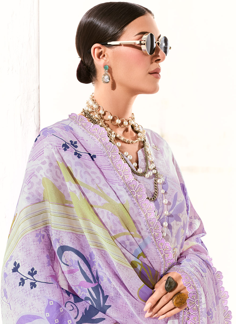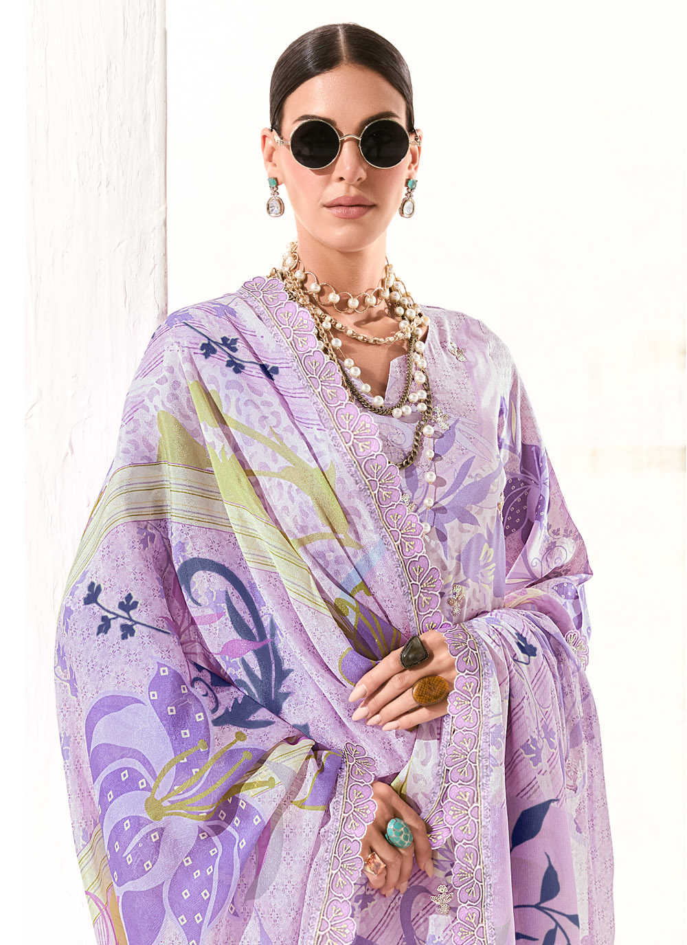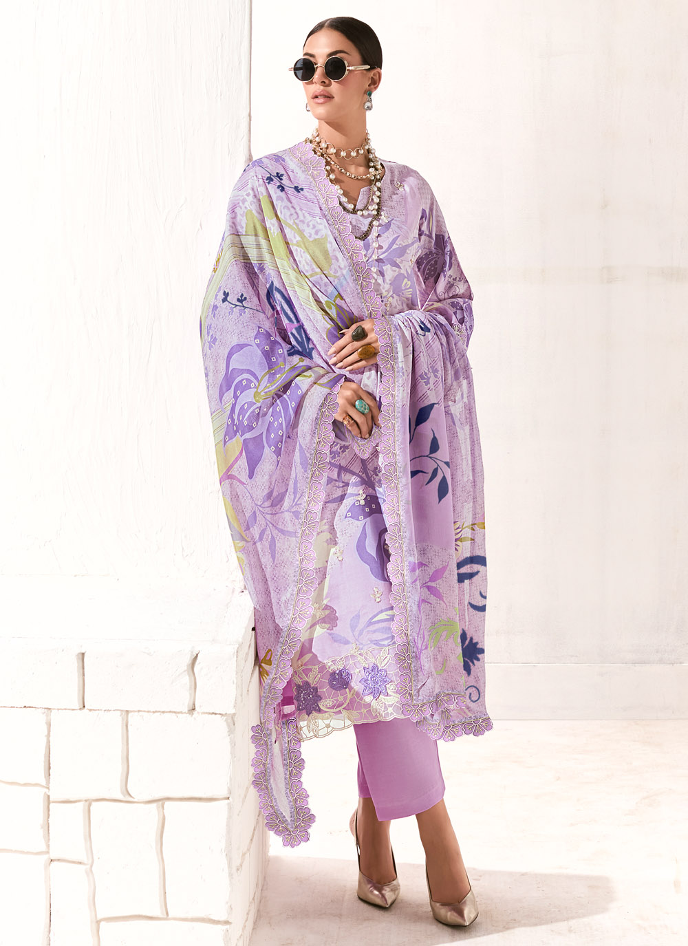 Make a refined statement with this designer salwar suit in soft lavender muslin, beautifully highlighted with digital prints and thread embroidery. Tailored to perfection, it blends modern charm with traditional accents. Comes with matching bottom and dupatta.