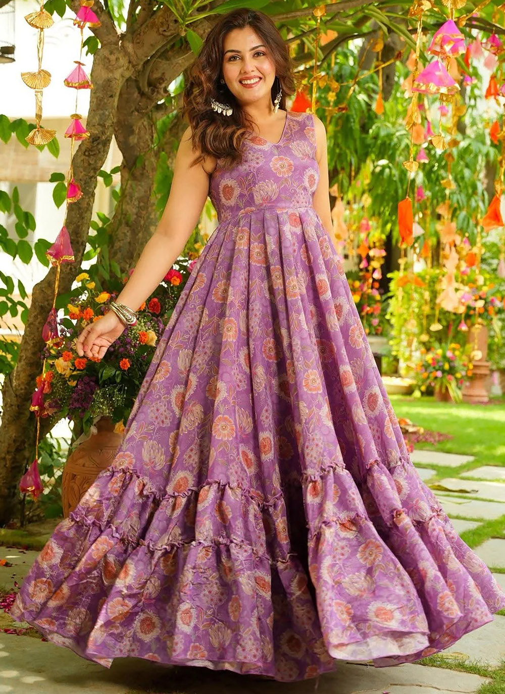 Celebrate special occasions with the Lavender Digital Printed Chinon Festival Gown. The rich rayon fabric gives a soft and lightweight feel, while the stylish digital prints enhance the charm of the lavender tone.