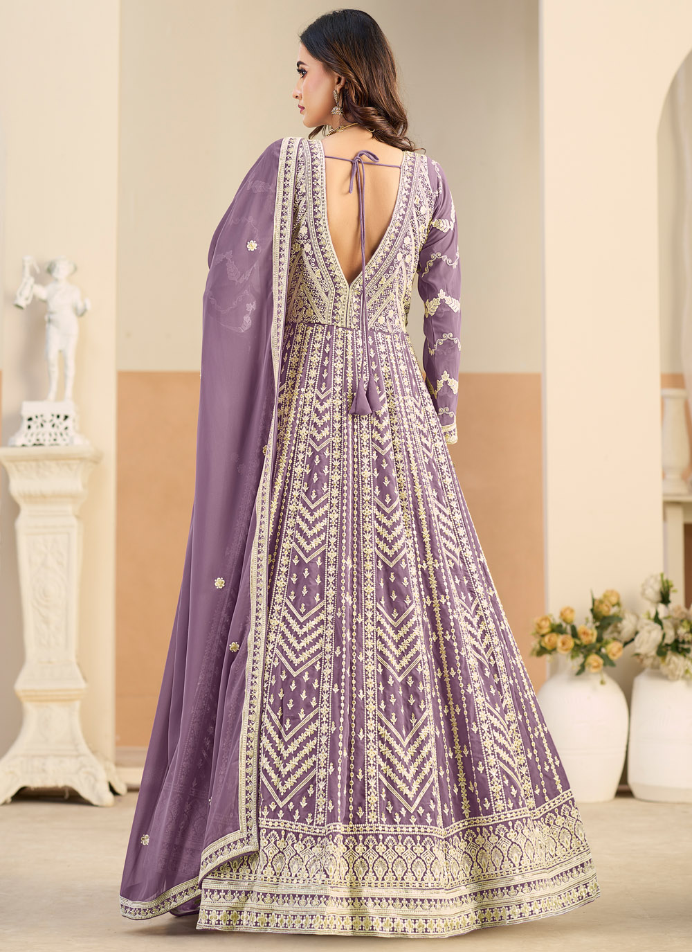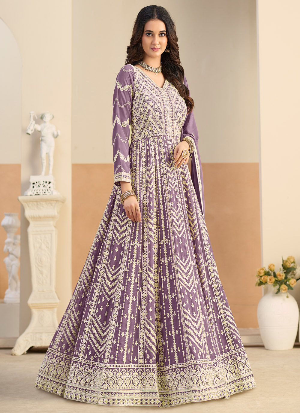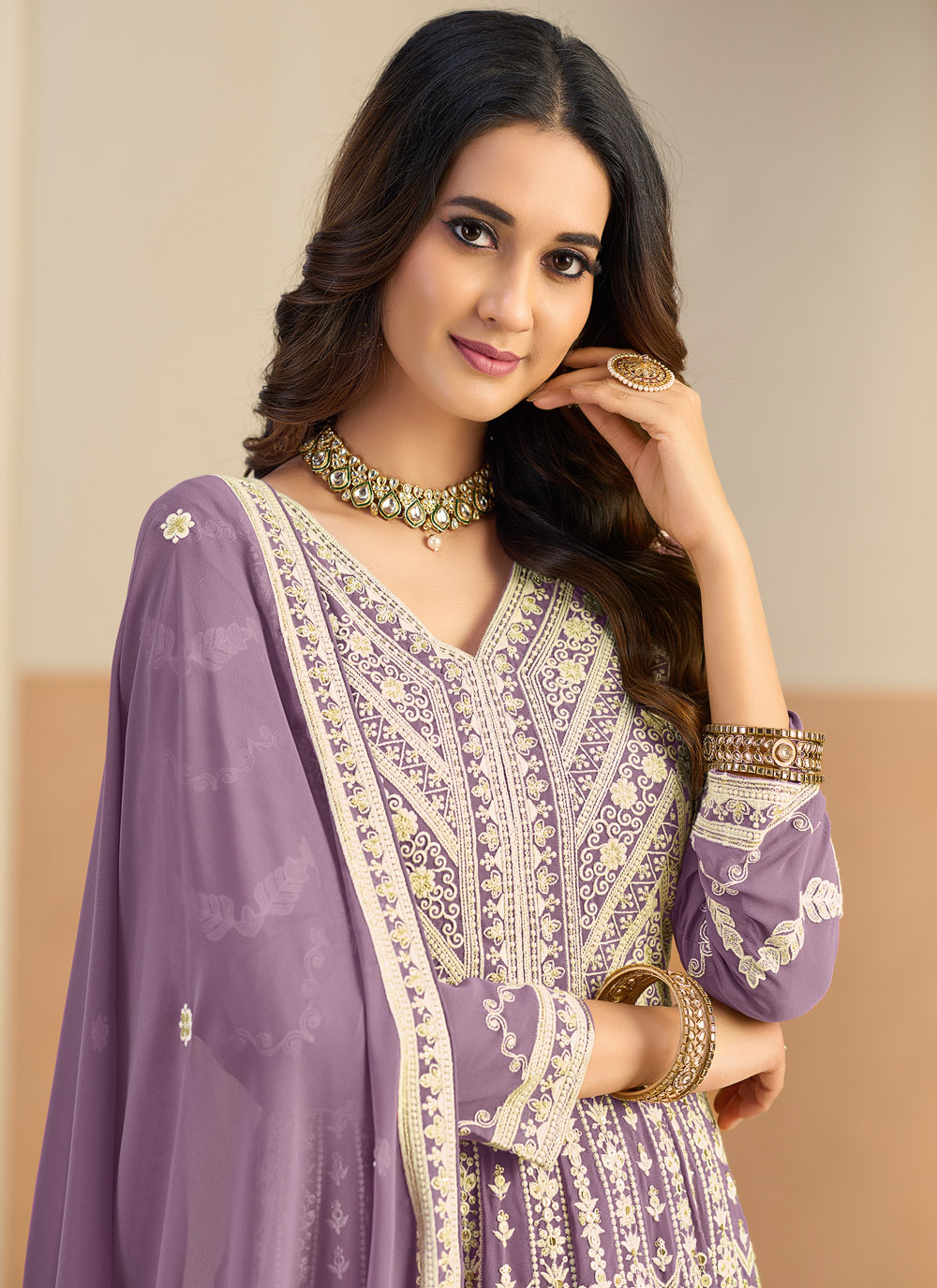 Grace your special occasions in this beautifully embroidered lavender faux georgette salwar suit. The finely detailed threadwork elevates the soft pastel tone, giving it a graceful yet eye-catching finish. Comes with matching choli and dupatta.