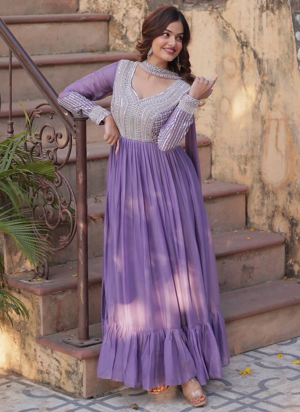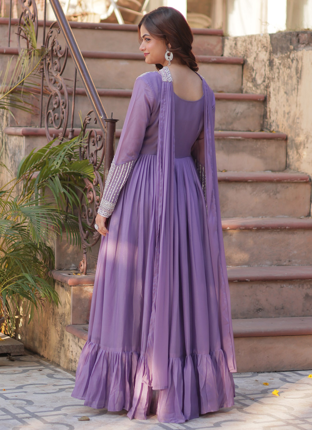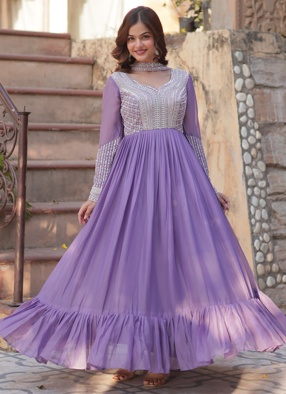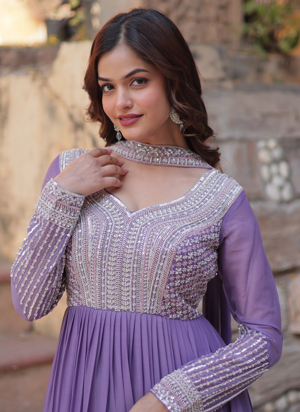 A dreamy lavender shade meets luxe detailing in this faux georgette gown. Featuring beautifully placed sequins and bead embroidery that catch the light just right, this gown brings together trend and tradition in a seamless blend. Perfect for modern bridesmaids, engagement looks, or high-end festive wear. Comes with matching dupatta.