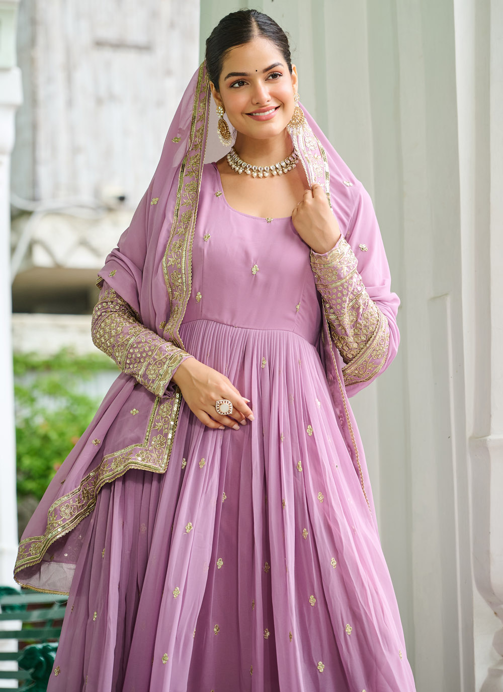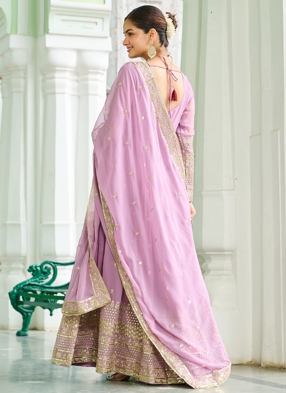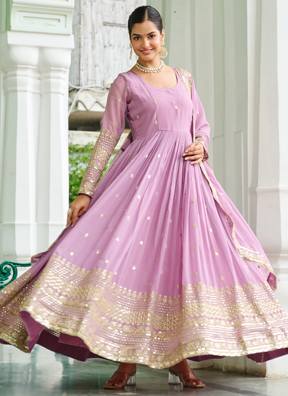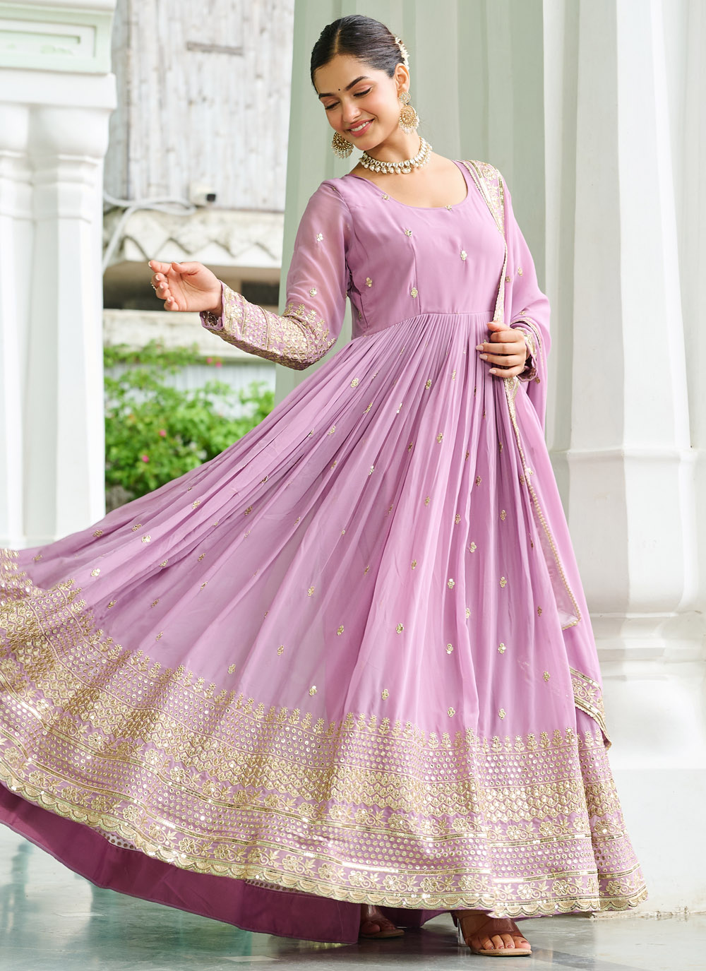 Add a royal touch to your wardrobe with this enchanting Lavender Georgette Embroidered Gown. Designed with intricate zari and sequin embellishments.this gown exudes a glamorous yet graceful vibe. Comes with matching dupatta.