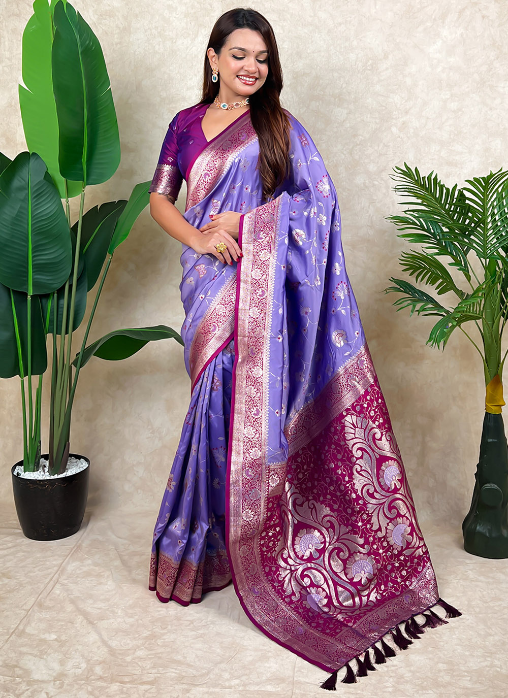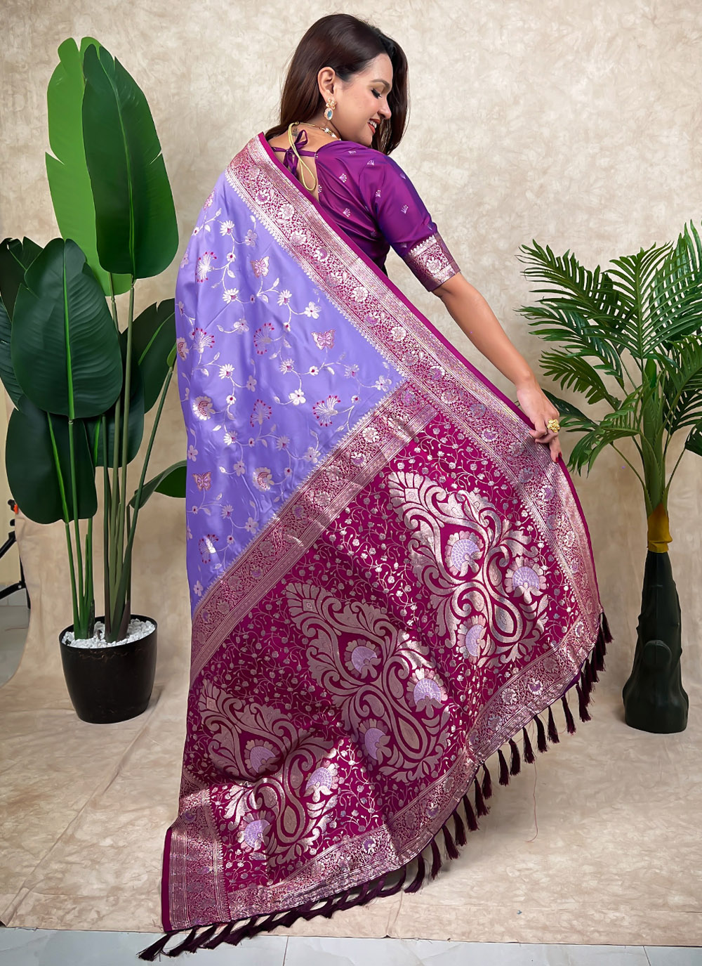 Enhance your festive wardrobe with this lavender Banarasi silk saree showcasing delicate meenakari designs. The harmonious blend of pastel shade and traditional weaving offers a classic yet sophisticated appearance. Comes with matching blouse.