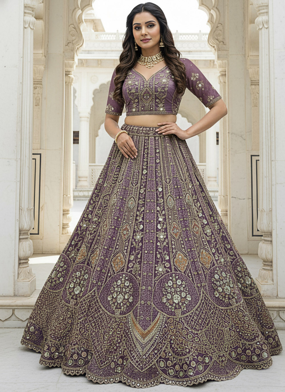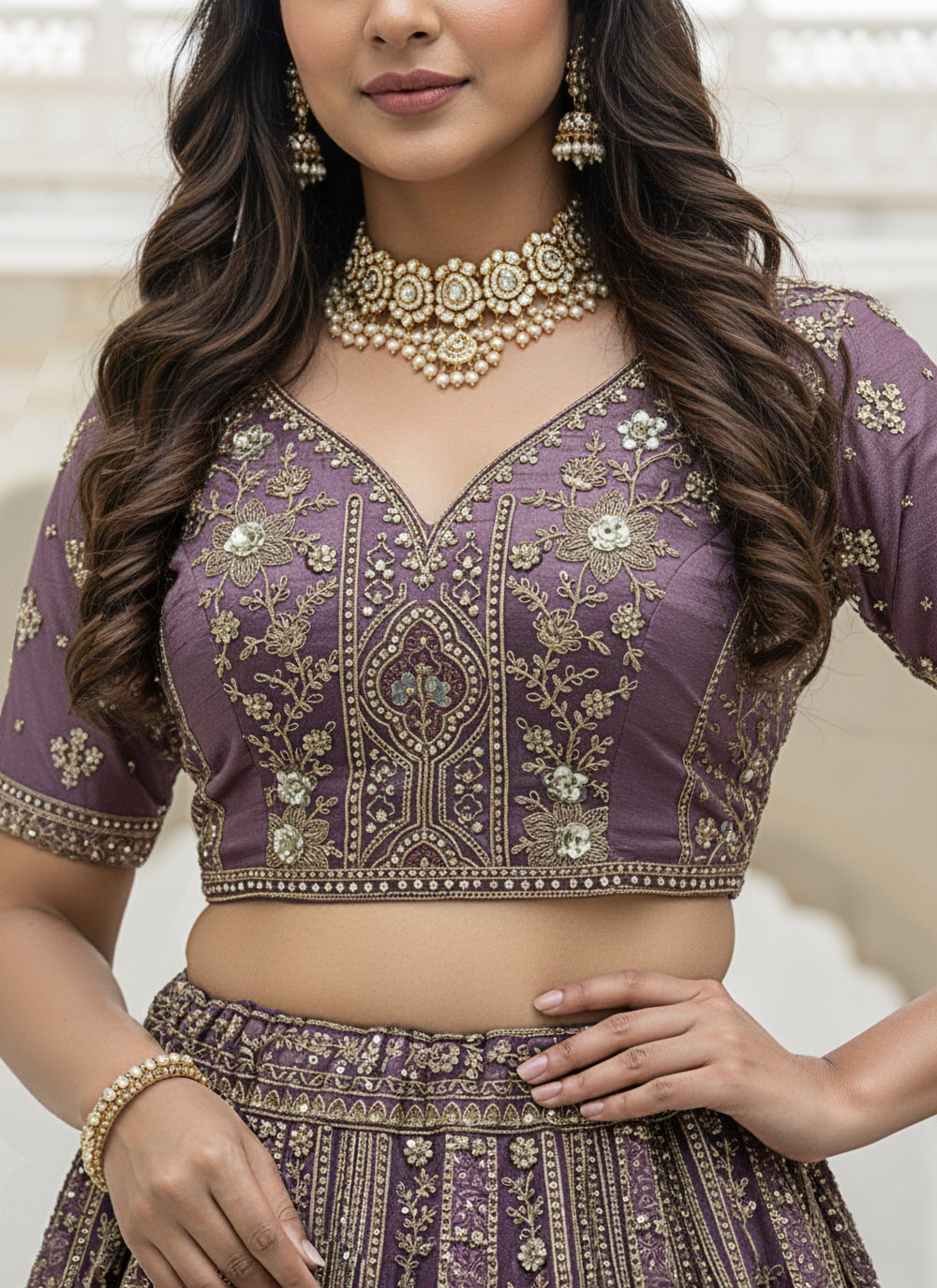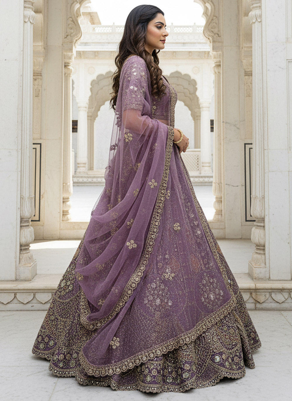 Designed to capture attention, this lavender organza lehenga showcases expert craftsmanship through its sequins, zari embroidery, multicolour thread detailing, and elegant dori work. The diamond-style embellishments elevate the outfit with subtle glamour. Comes with matching choli and dupatta.