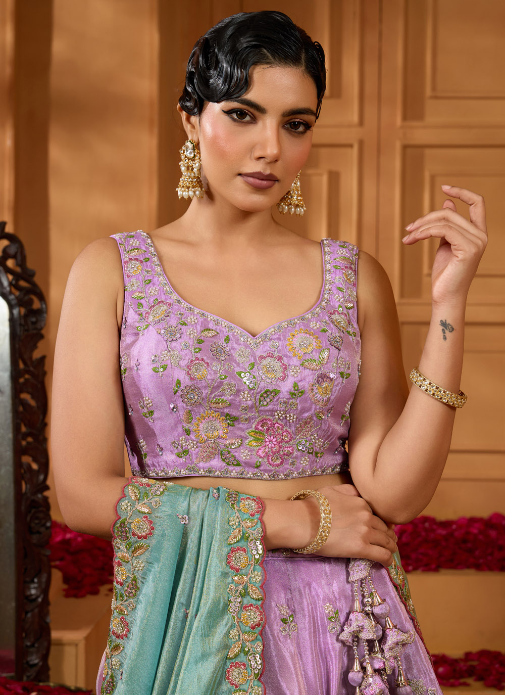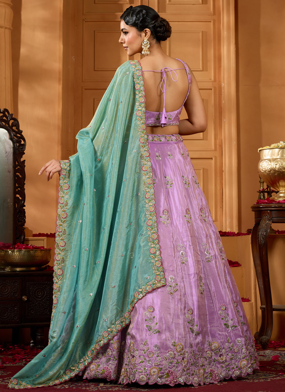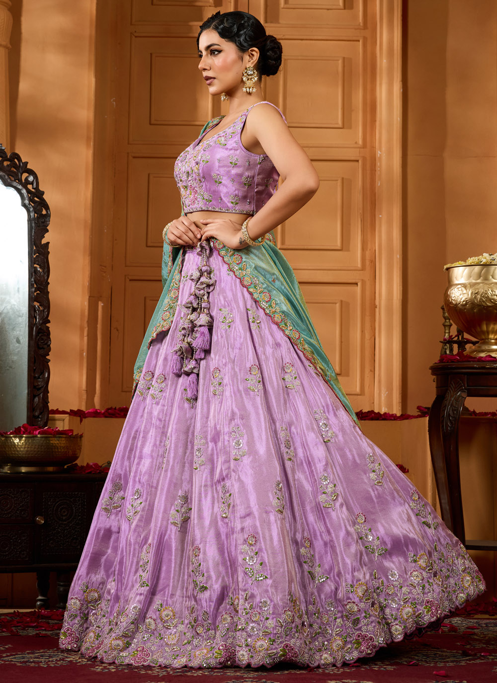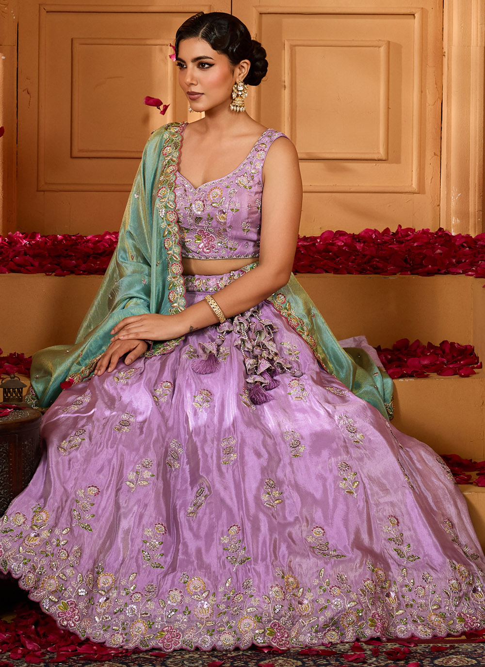 This lavender satin silk lehenga choli exudes charm and elegance. The intricate bead, stone, and cut work detailing creates a stylish finish, making it a standout outfit for weddings, receptions and special occasions where glamour is a must. Comes with matching choli and dupatta