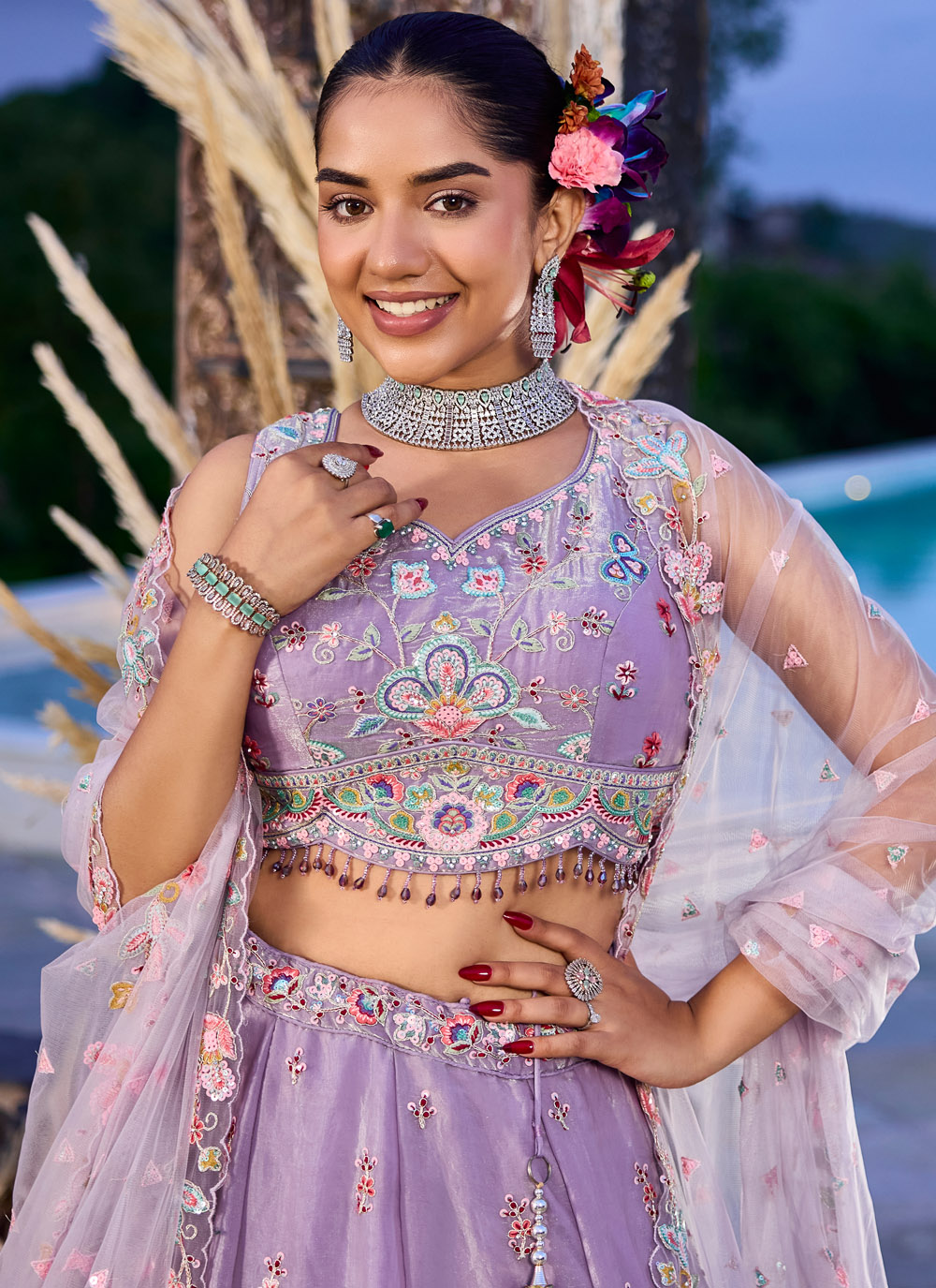 This Lavender Satin Silk Readymade Lehenga Choli is adorned with sequins and thread embroidery, creating a refined ethnic look. The smooth satin silk fabric ensures a graceful drape, making it perfect for weddings and festive functions. Comes with matching choli and dupatta.