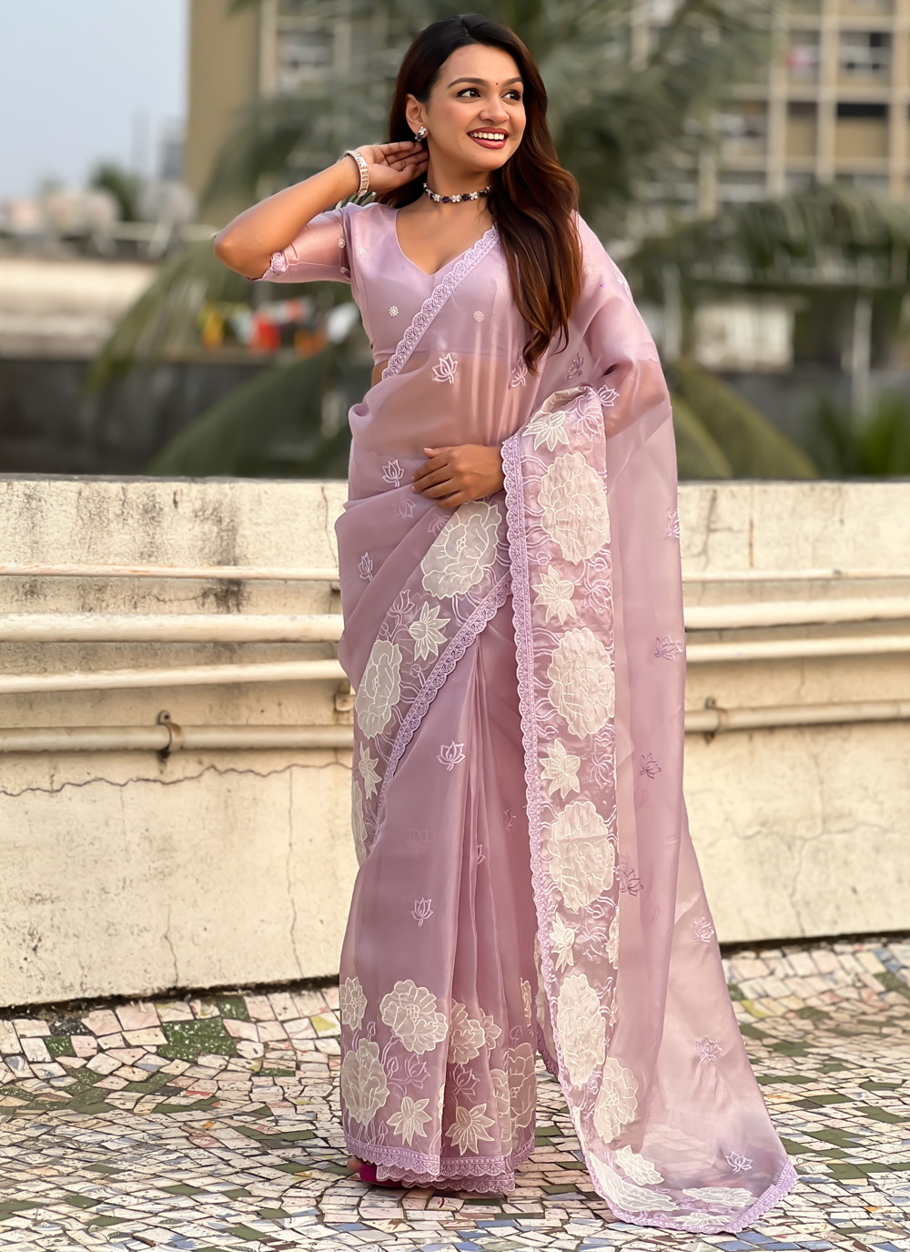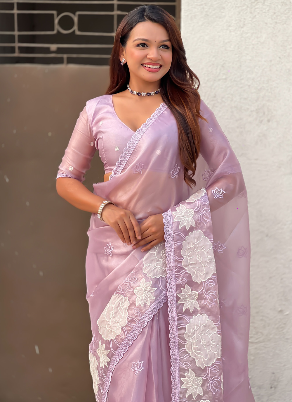 A graceful Lavender Silk Trendy Saree designed to express refined elegance. The saree features delicate embroidery combined with artistic cut work detailing, creating a sophisticated texture across the silk fabric. Comes with matching blouse.