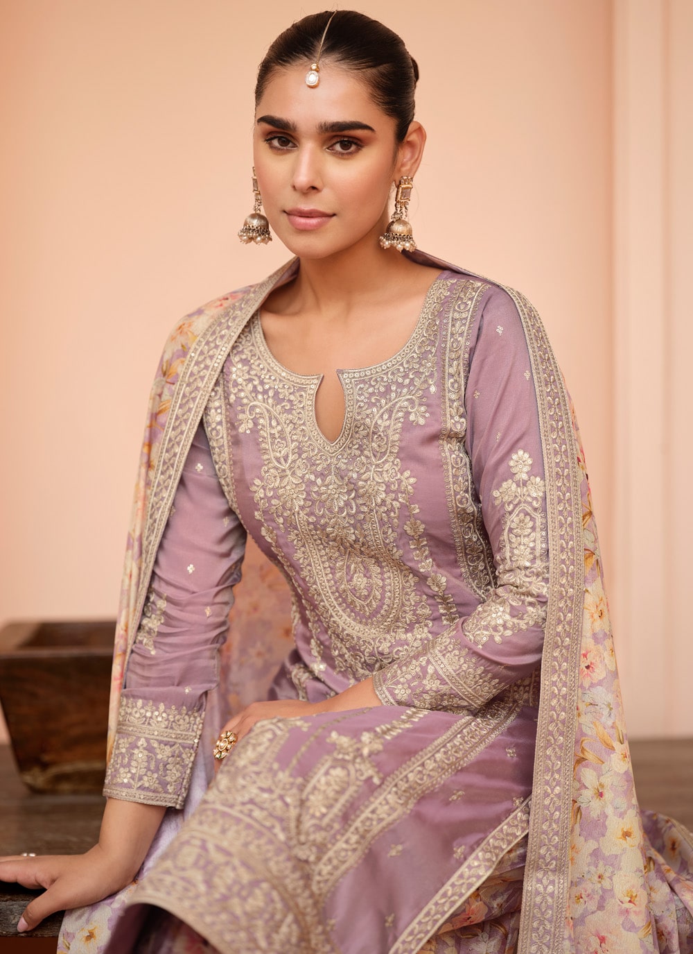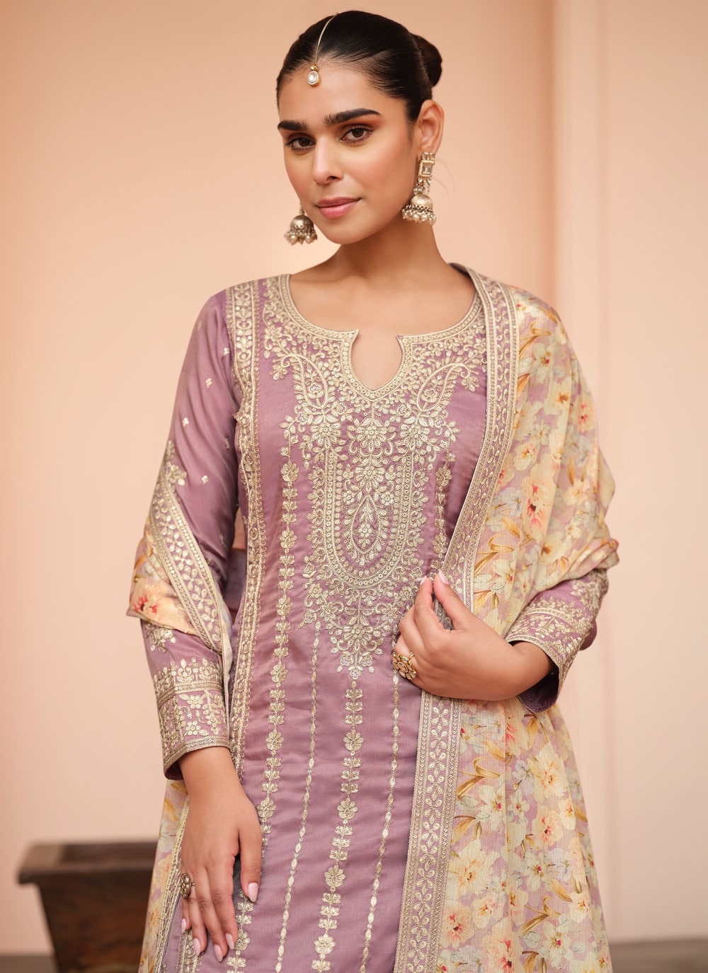 Capturing the spirit of refined fashion, this embroidered silk salwar kameez in lavender showcases detailed craftsmanship on a soothing palette. Its readymade design ensures a perfect fit, bringing elegance and ease to every special occasion. Comes with matching bottom and dupatta.