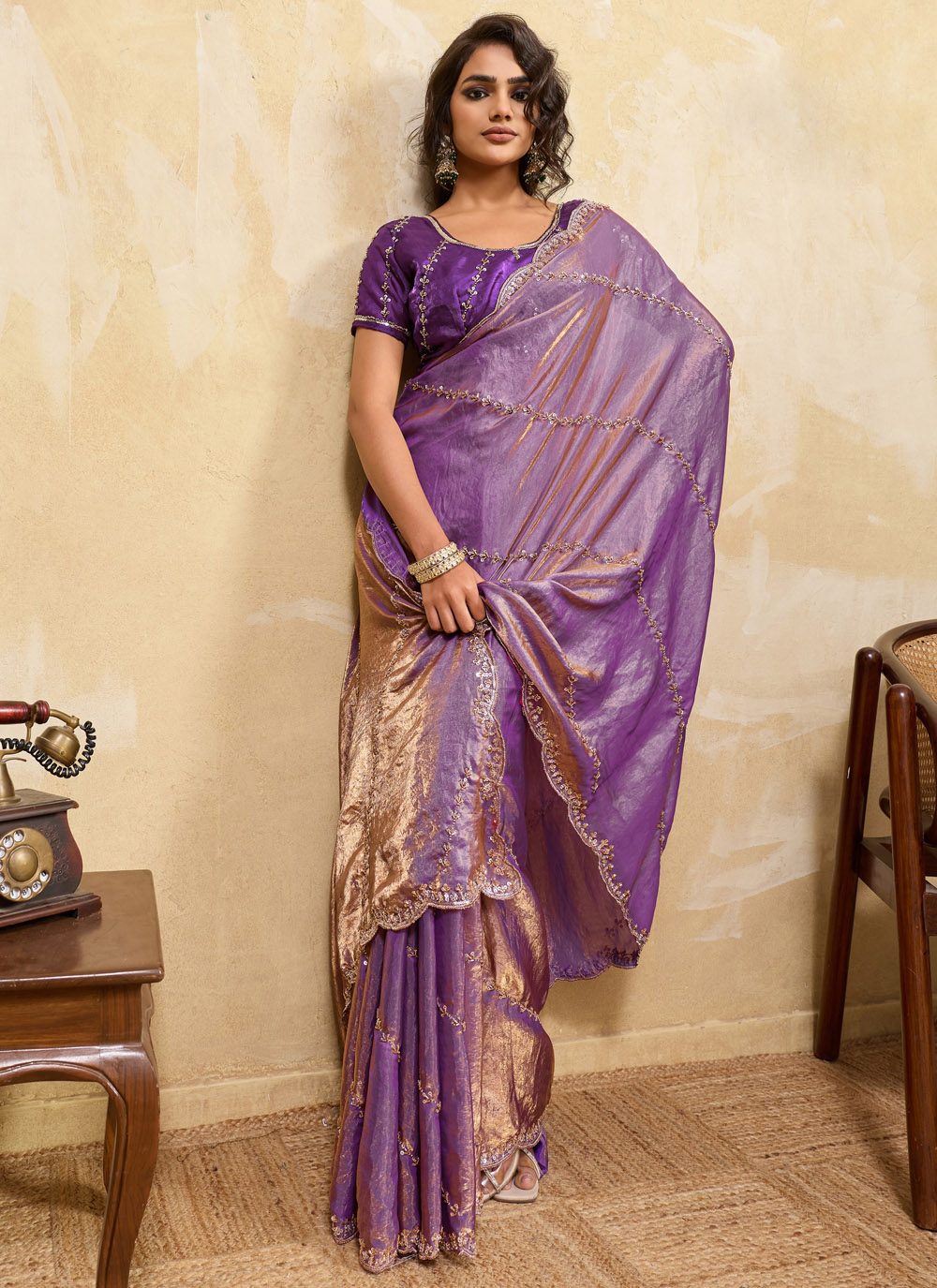 This Lavender Embroidered Classic Saree features premium velvet satin fabric adorned with intricate cutdana and zari detailing. The rich texture adds depth and dimension, while the elegant embroidery elevates its festive appeal. Comes with matching blouse.