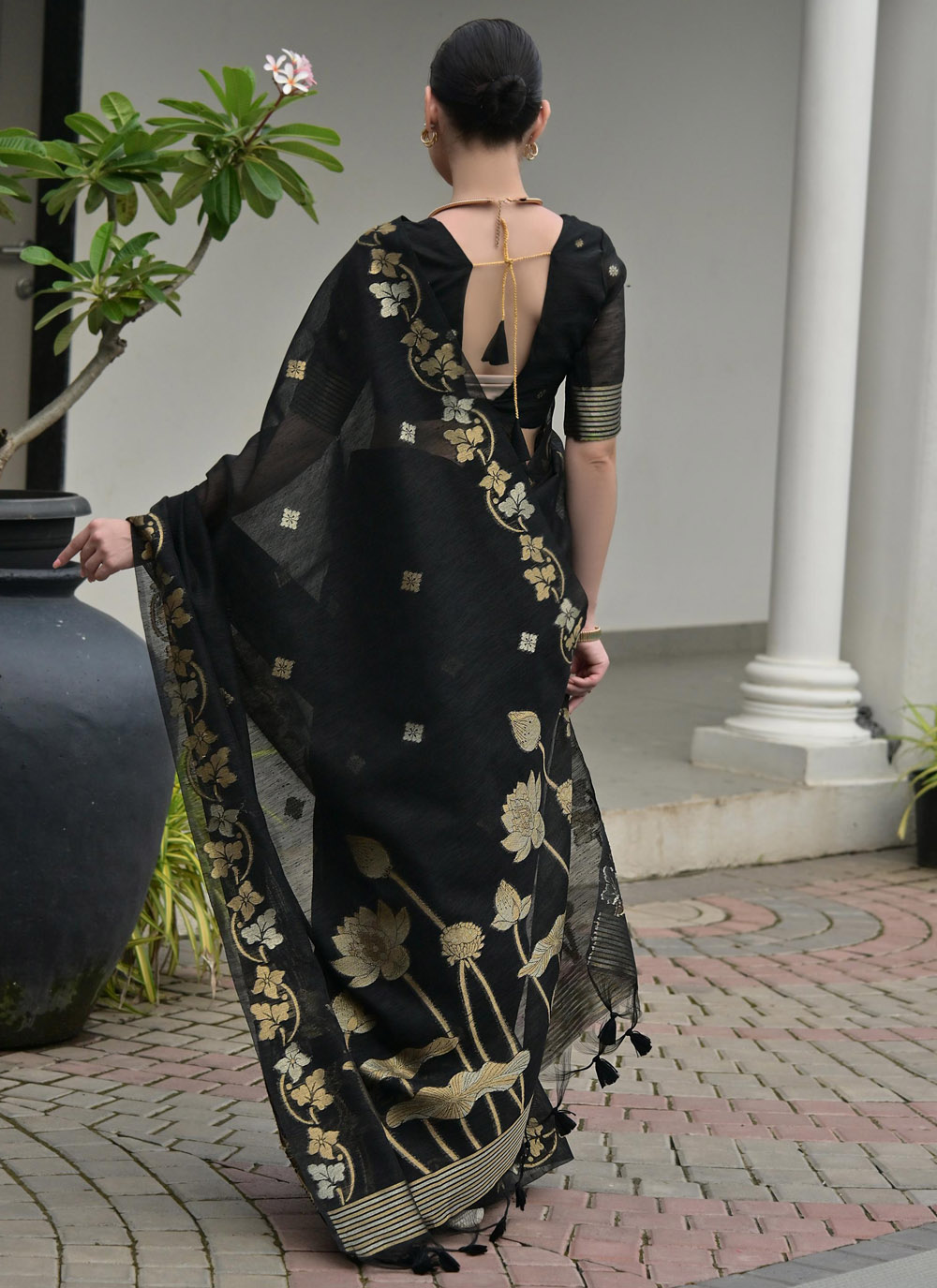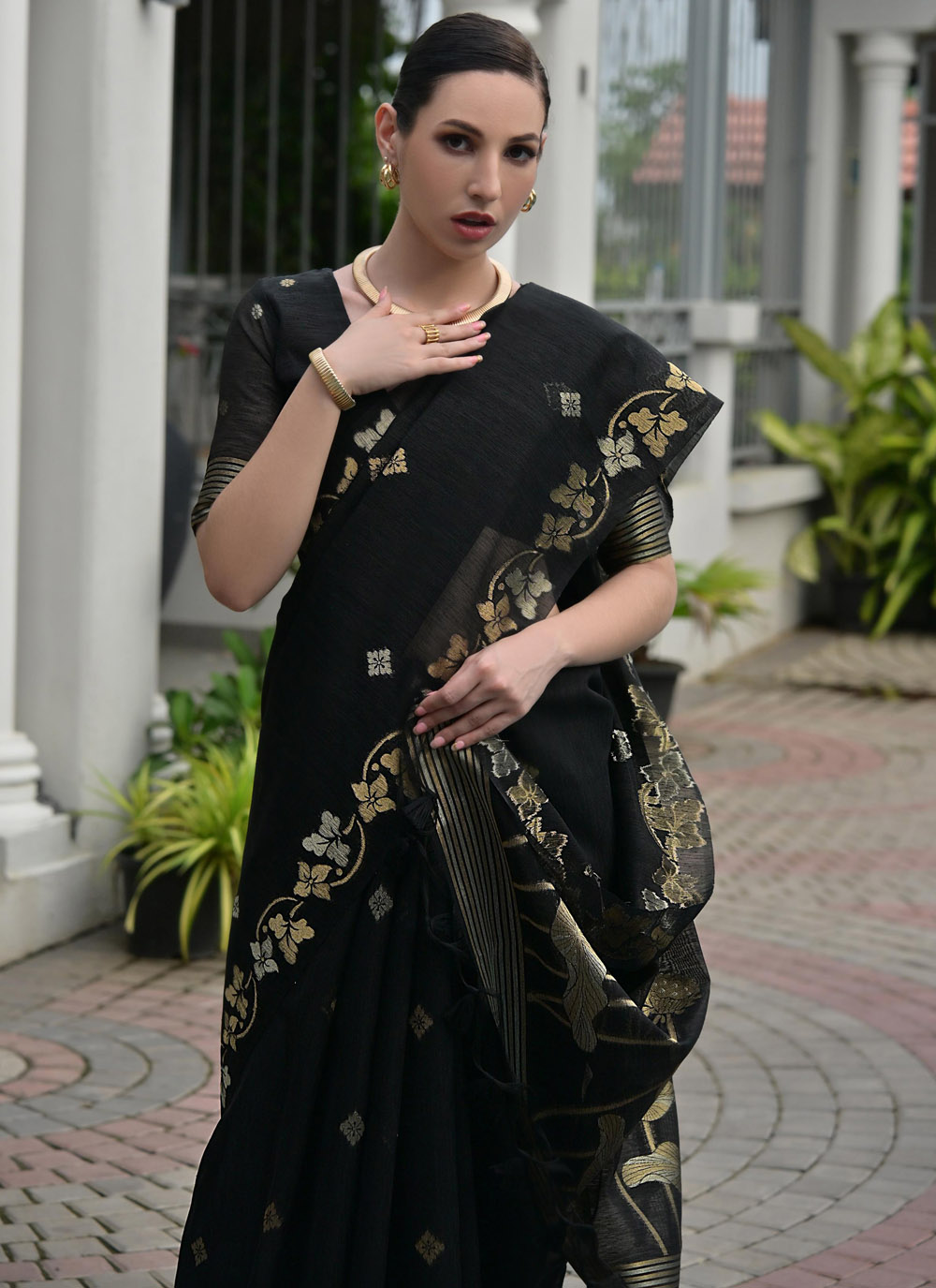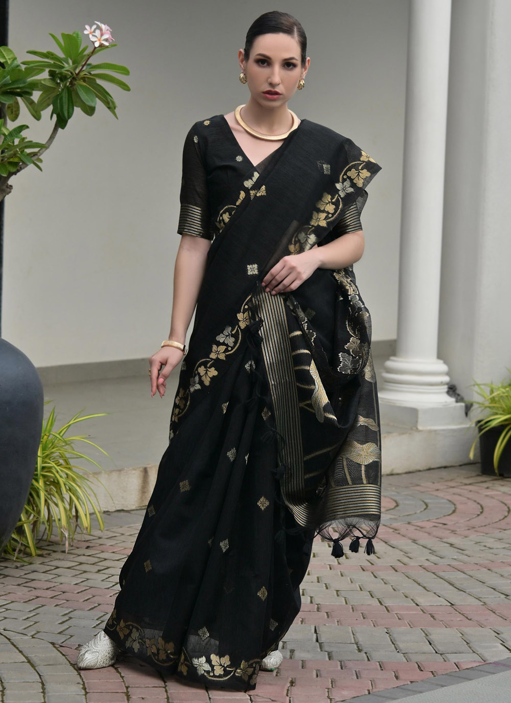 Discover timeless elegance with this Linen Silk Black Zari Weaving Work Designer Saree. Crafted from a premium linen silk blend, this saree features intricate zari weaving that adds a refined golden shimmer. Comes with matching blouse.