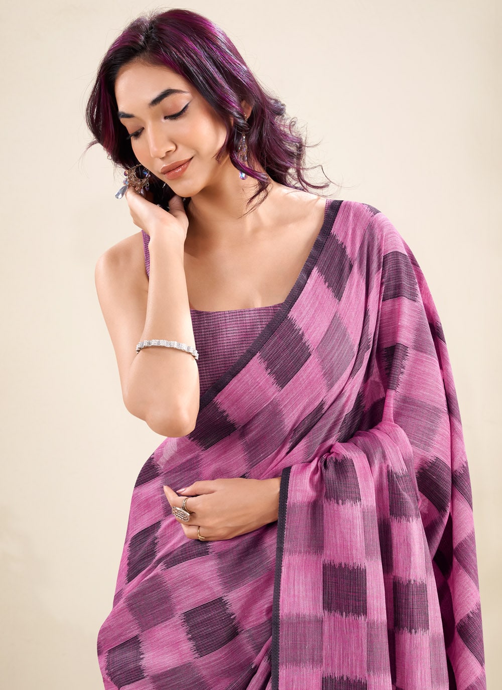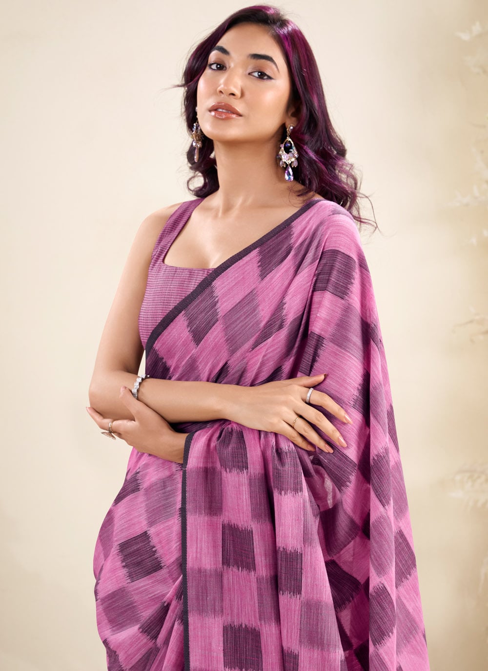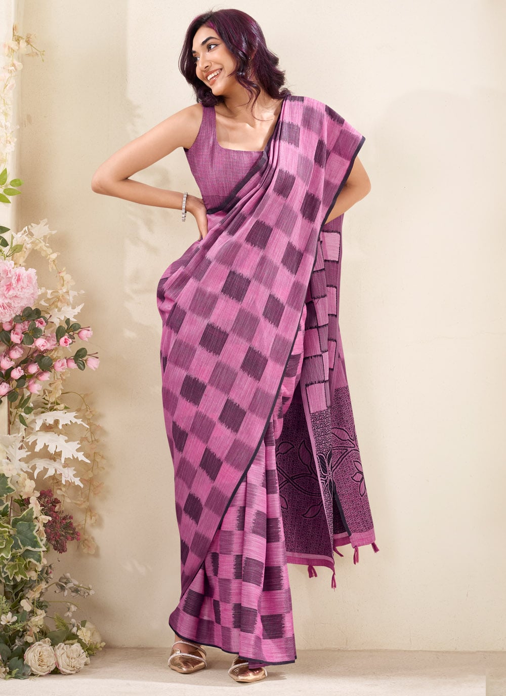 Stand out in elegance with this Fuchsia Linen Silk Saree, crafted with intricate woven checks work. Its vibrant hue and soft silk blend make it a perfect pick for festive occasions, cultural events and family gatherings. Comes with matching blouse.