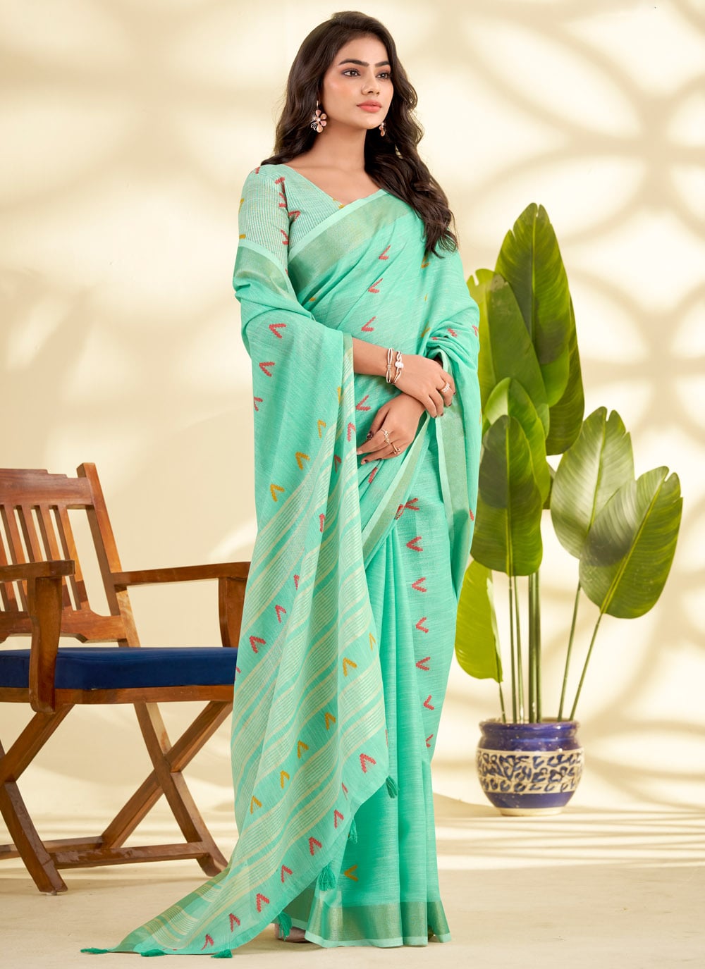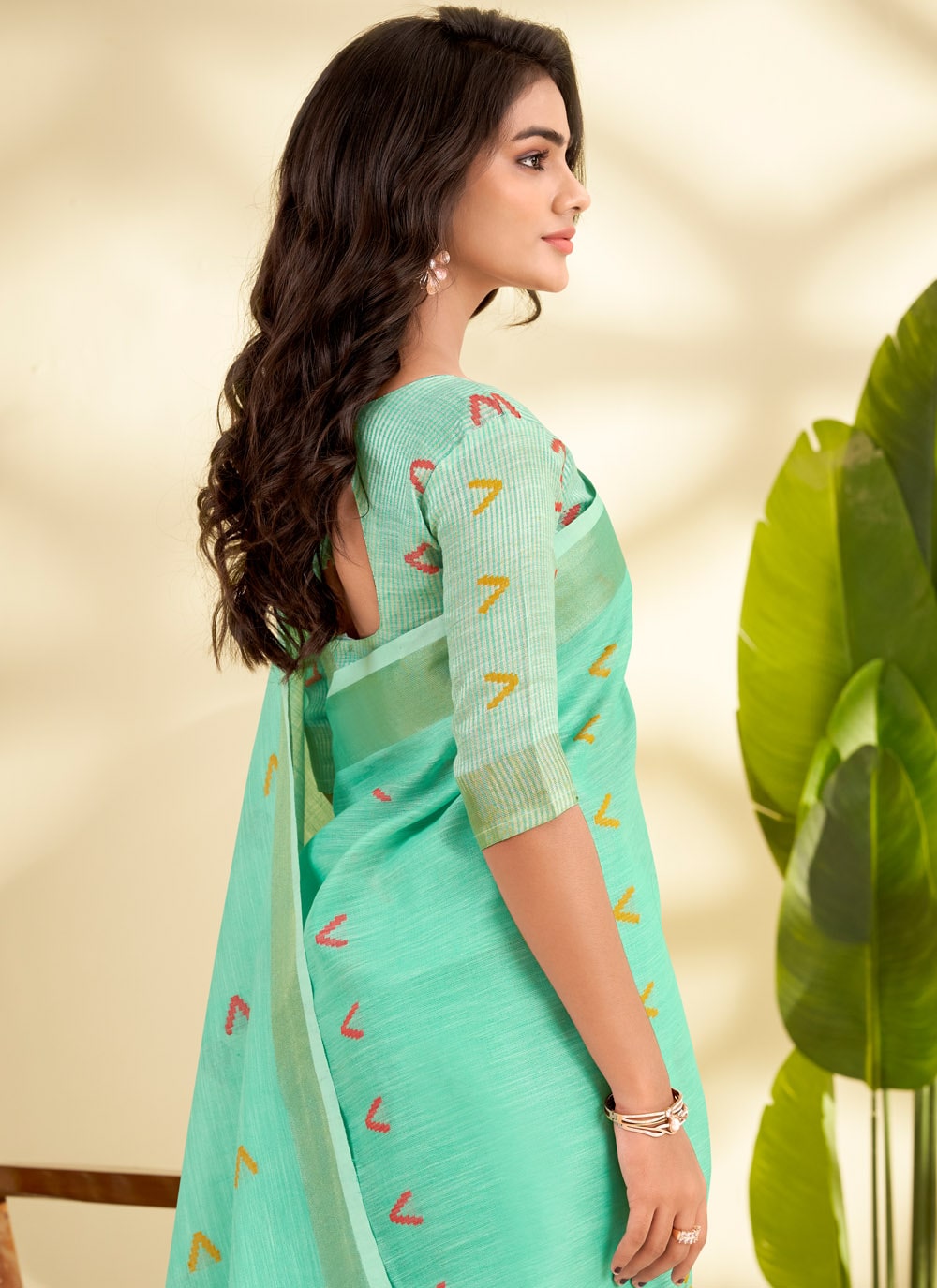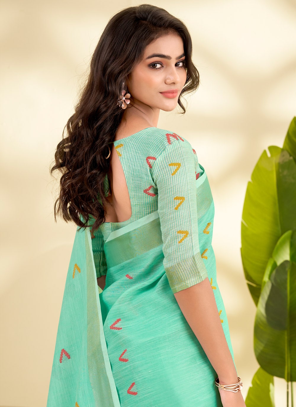 Add a refreshing touch to your ethnic collection with this Linen Turquoise Saree, adorned with exquisite zari work. The soft yet durable linen fabric offers breathable comfort. Comes with matching blouse.