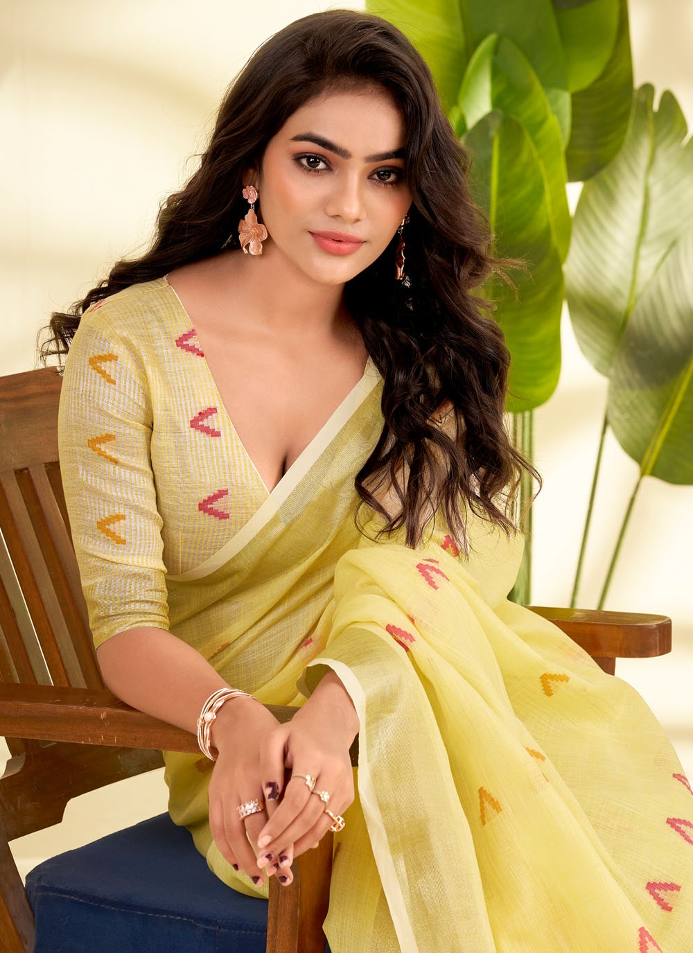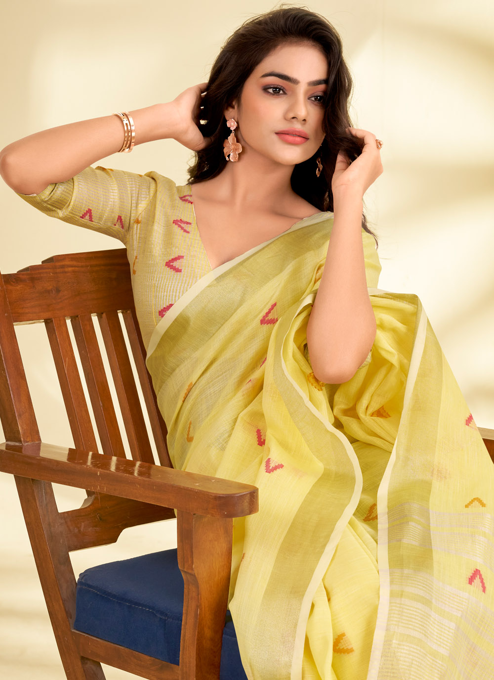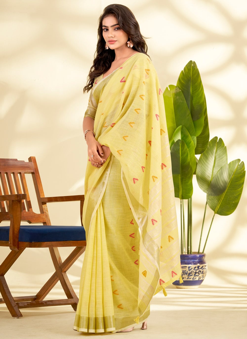 This Yellow Designer Saree in premium linen showcases exquisite zari weaving that blends tradition with modern sophistication. Comes with matching blouse.