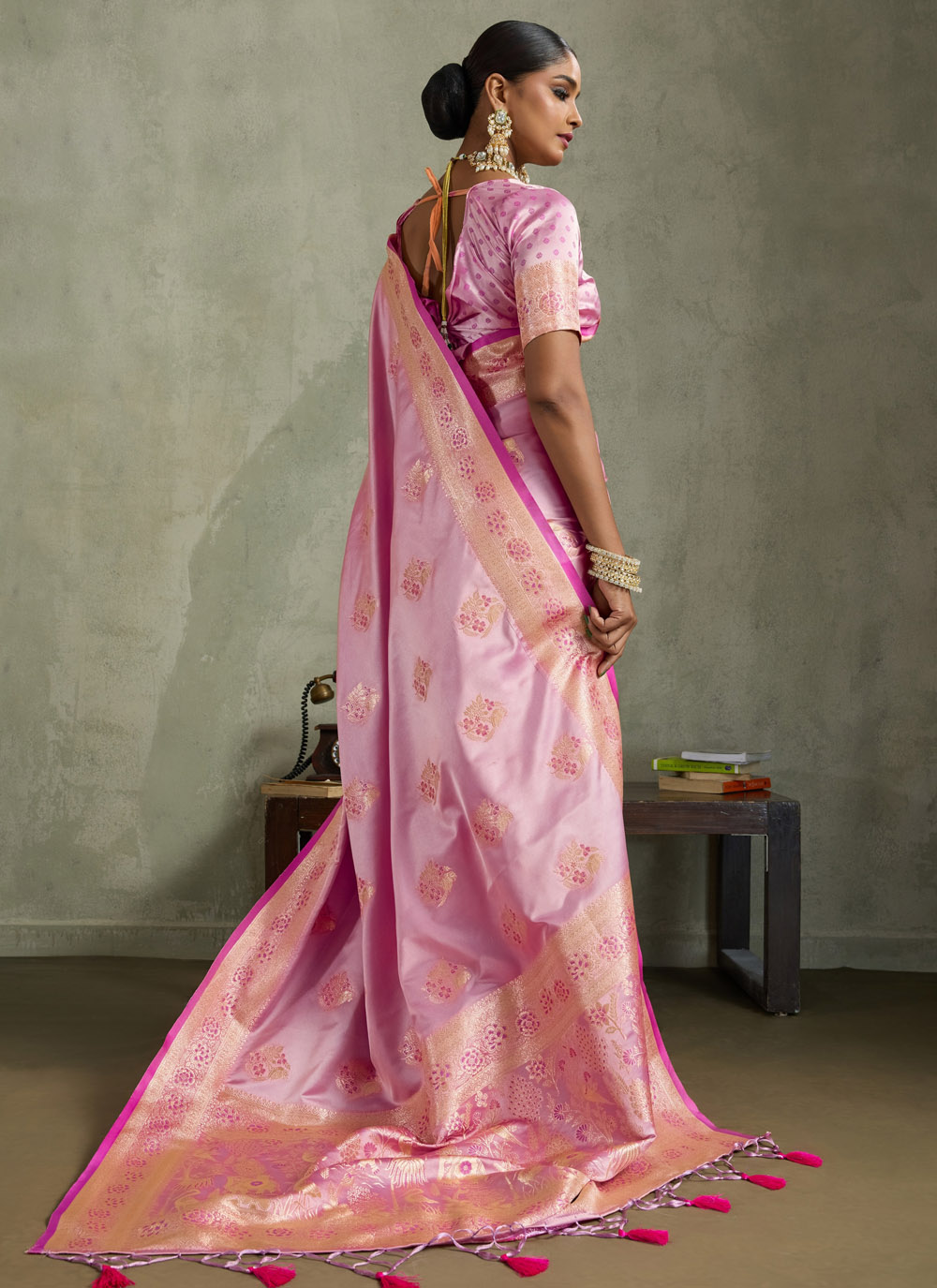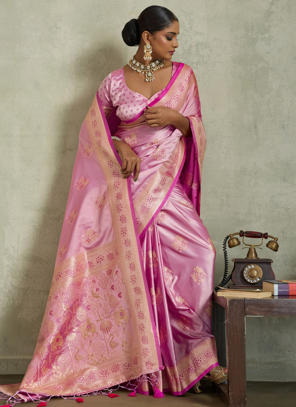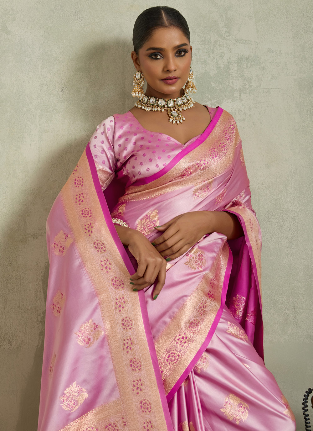 Embrace refined style with this magenta satin silk Banarasi saree, adorned with zari and Meenakari woven artistry. Its delicate craftsmanship along the borders and pallu blends tradition with sophistication. Comes with matching blouse.