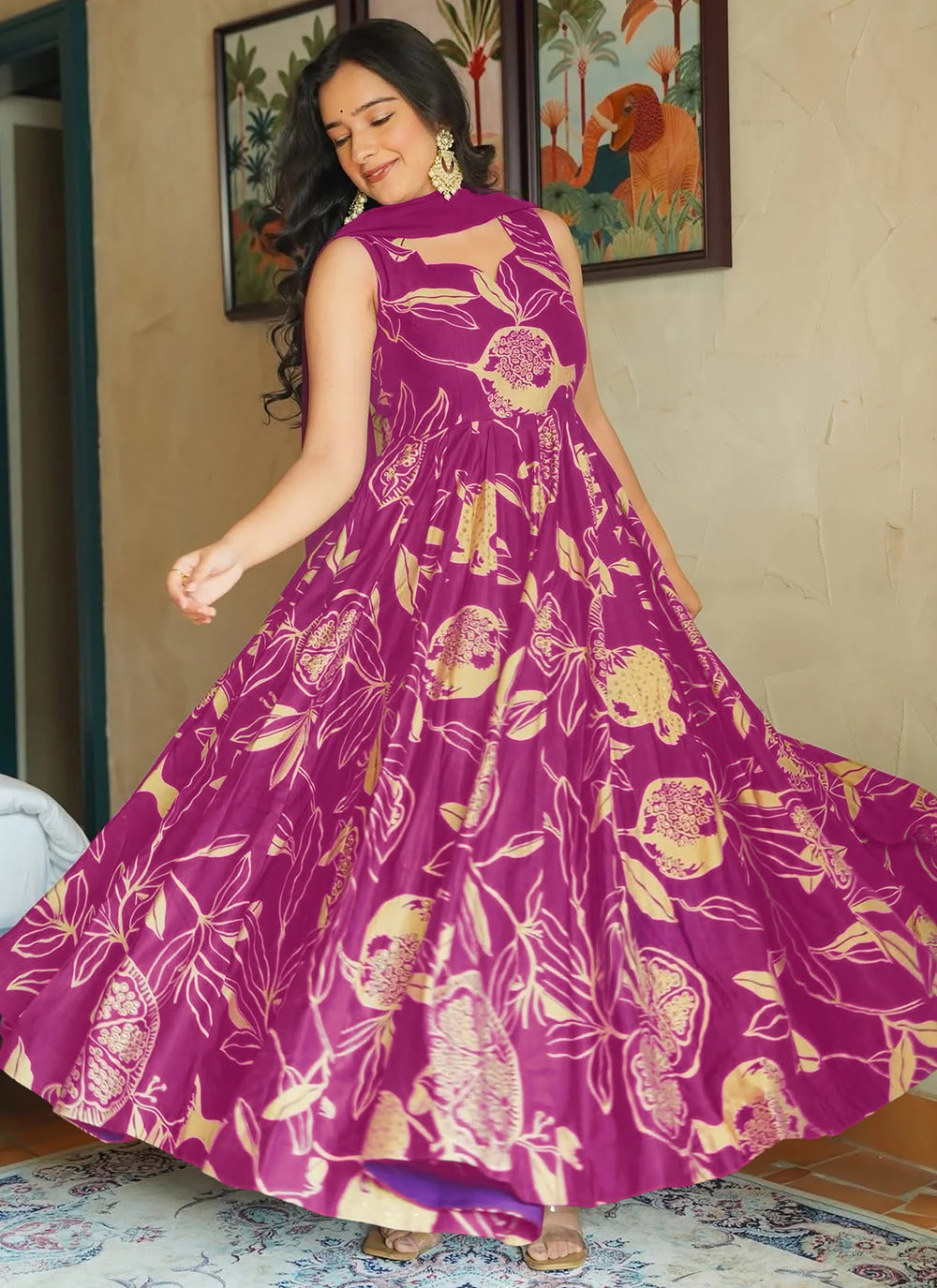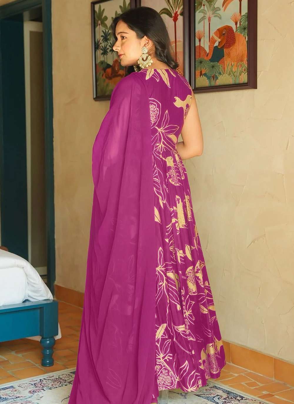 This magenta rayon gown stands out with its vibrant digital print and smooth texture. The ready-to-wear design gives a flattering flow, making it a stylish choice. Comes with matching dupatta.