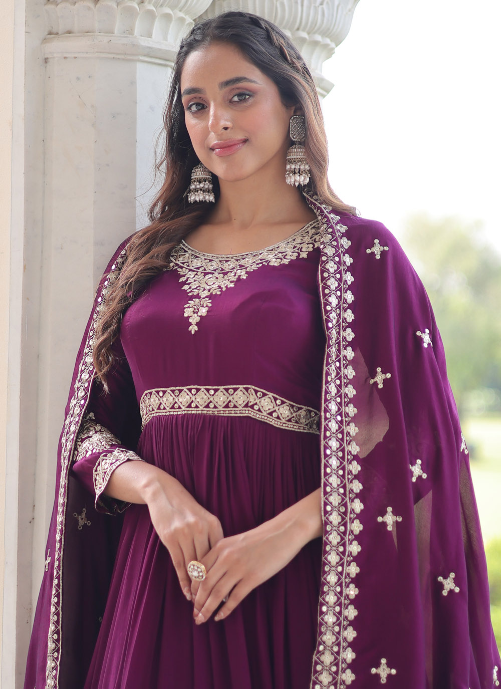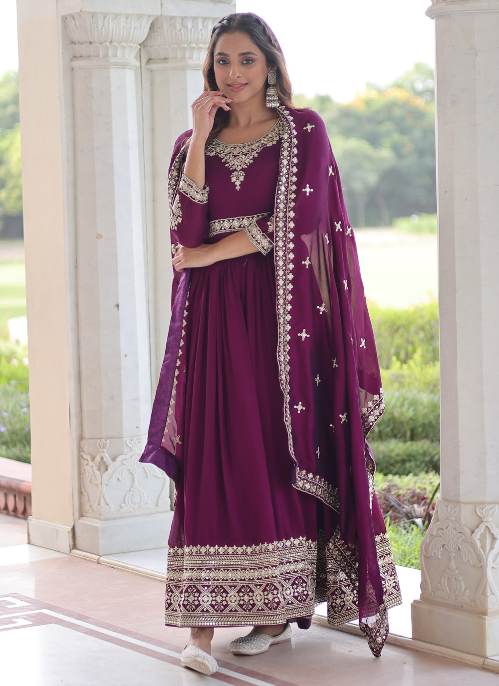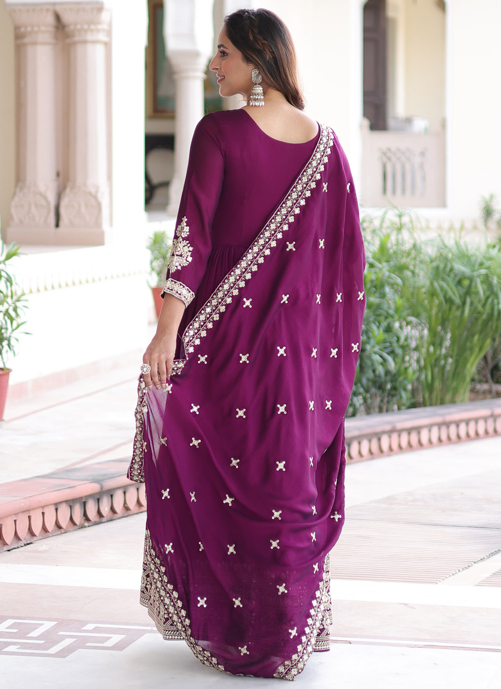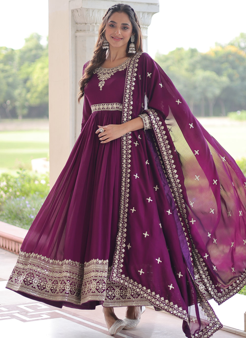 Make a statement at any event with this Magenta Vichitra Silk Gown. Its sequins embroidery, flowing silhouette, and vibrant color offer a perfect blend of tradition and modern elegance. Comes with matching dupatta.