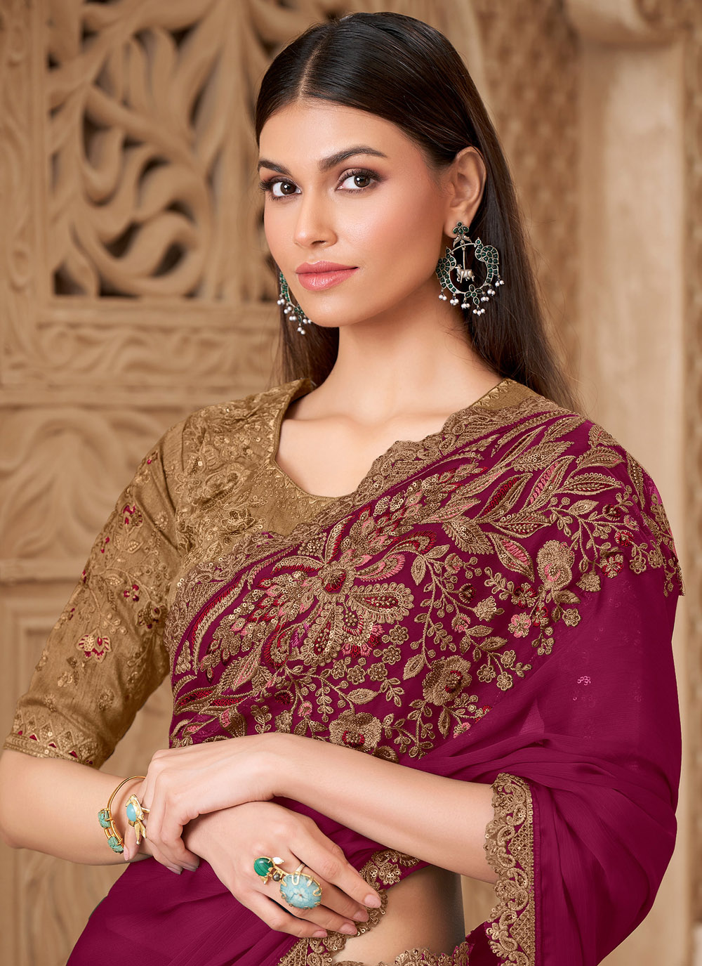 Bring effortless elegance to your look with this maroon embroidered border satin silk saree. The silky smooth texture combined with intricate border detailing creates a balanced blend of tradition and modern style. Comes with matching blouse.