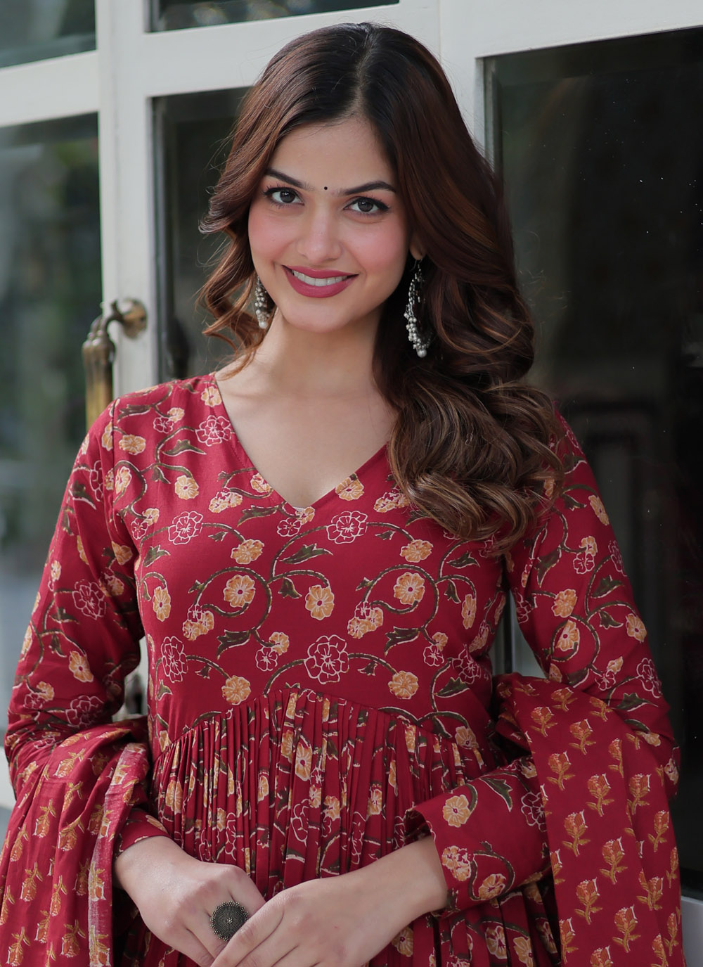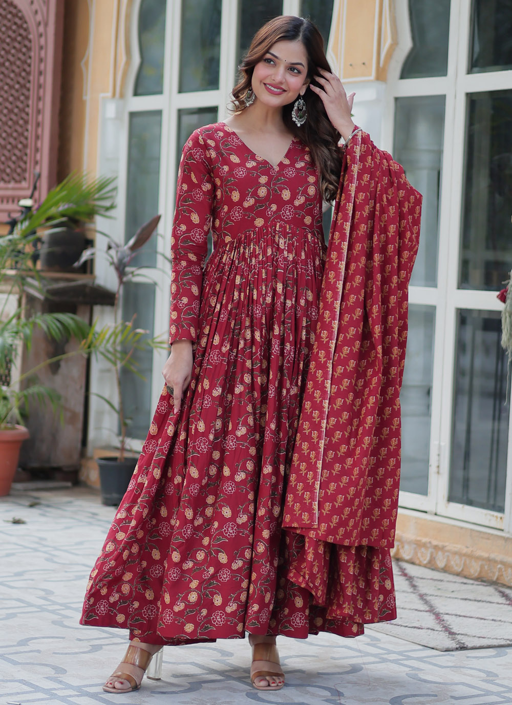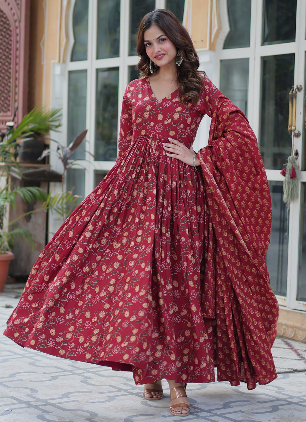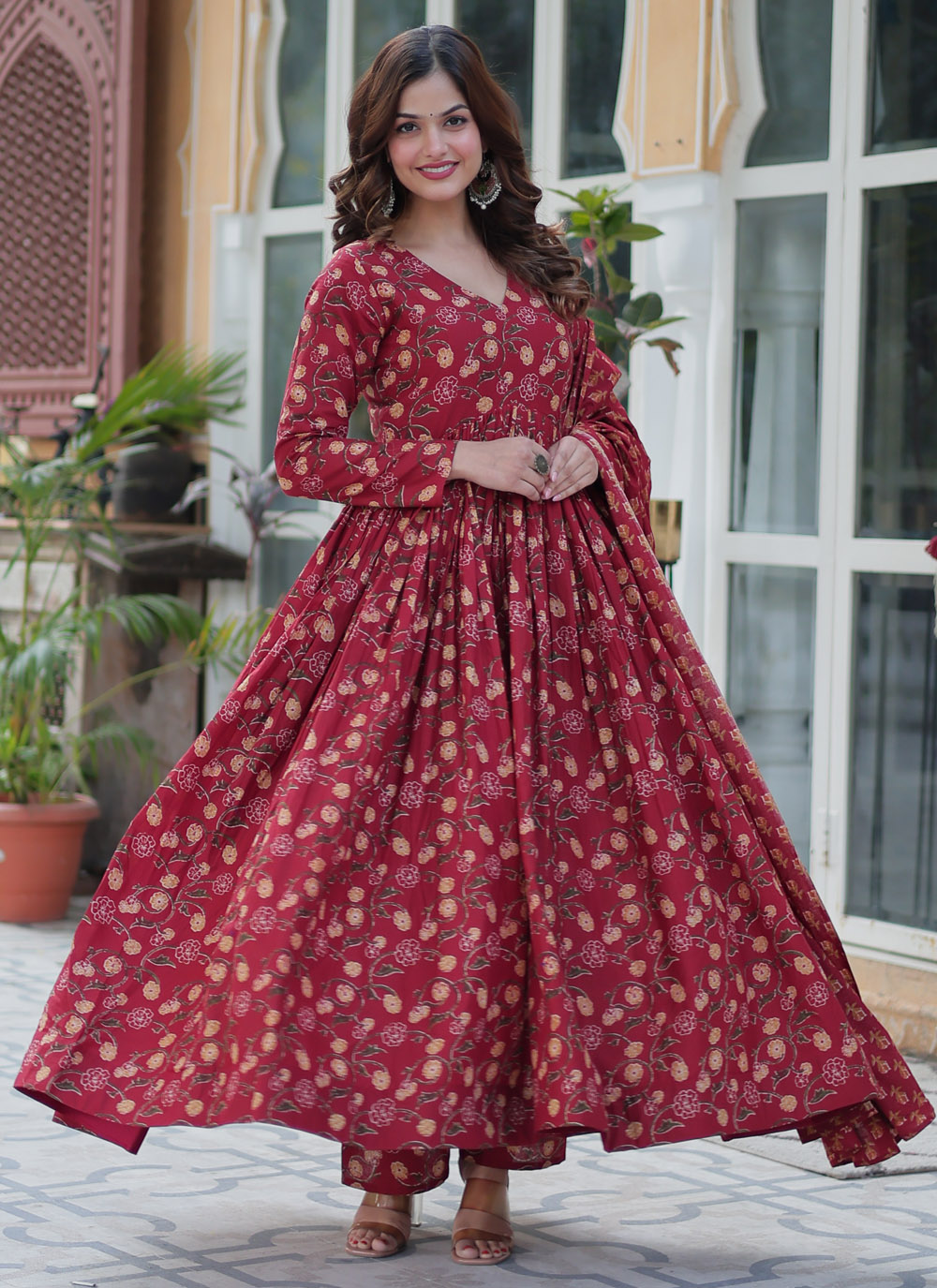 Stay effortlessly stylish with this Maroon Cotton Printed Readymade Salwar Kameez. Crafted from breathable cotton and adorned with elegant prints, it offers all-day comfort without compromising on charm. Ideal for casual outings, office wear, or festive gatherings. Comes with matching bottom and dupatta.