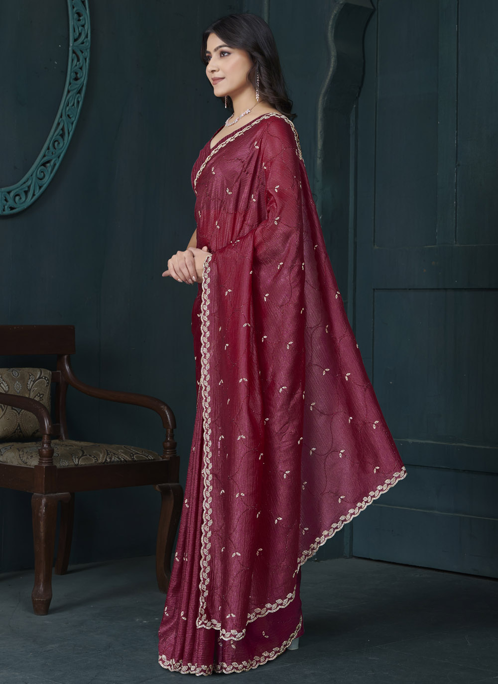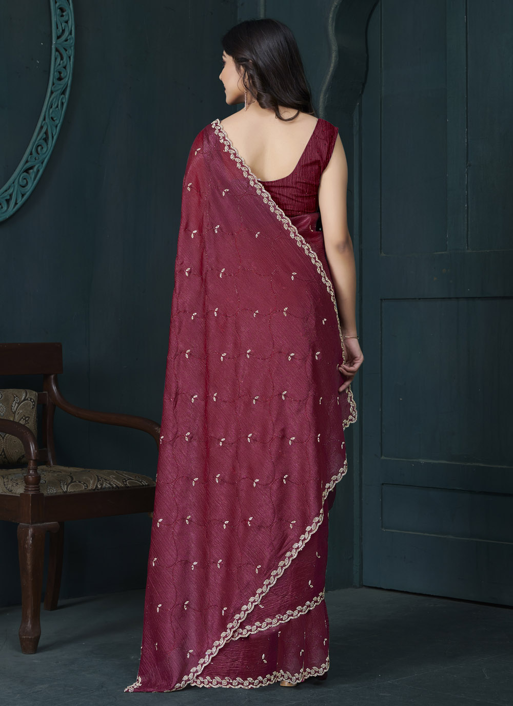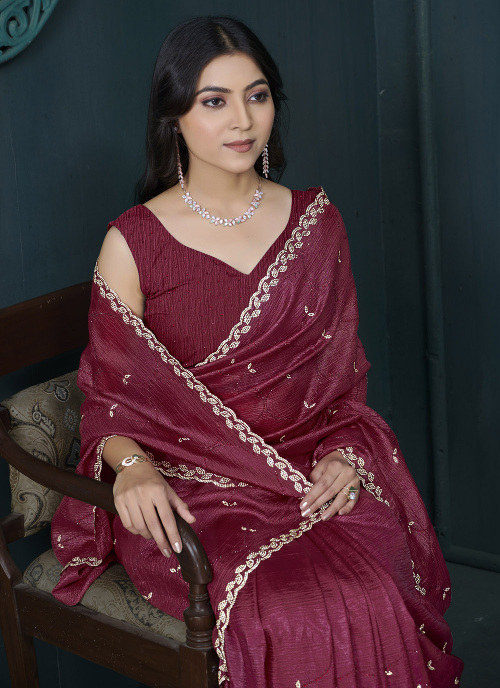Drape yourself in timeless elegance with this Maroon Crepe Silk Designer Saree adorned with delicate diamond work. Crafted to perfection, this saree blends traditional charm with modern finesse, making it ideal for weddings, festive gatherings, or evening. Comes with matching blouse.