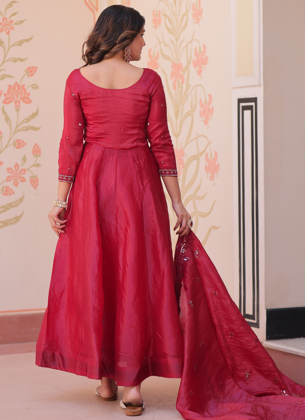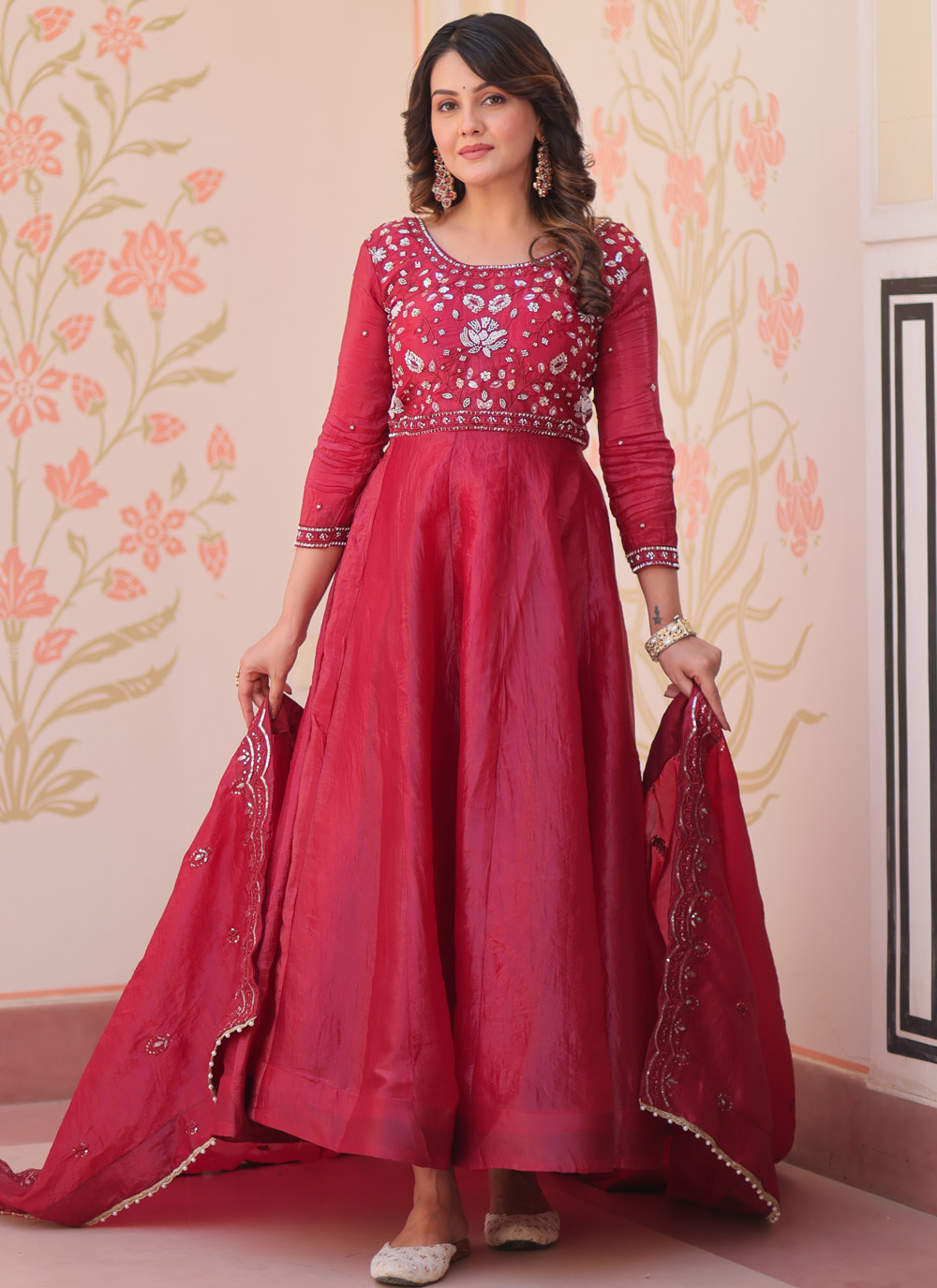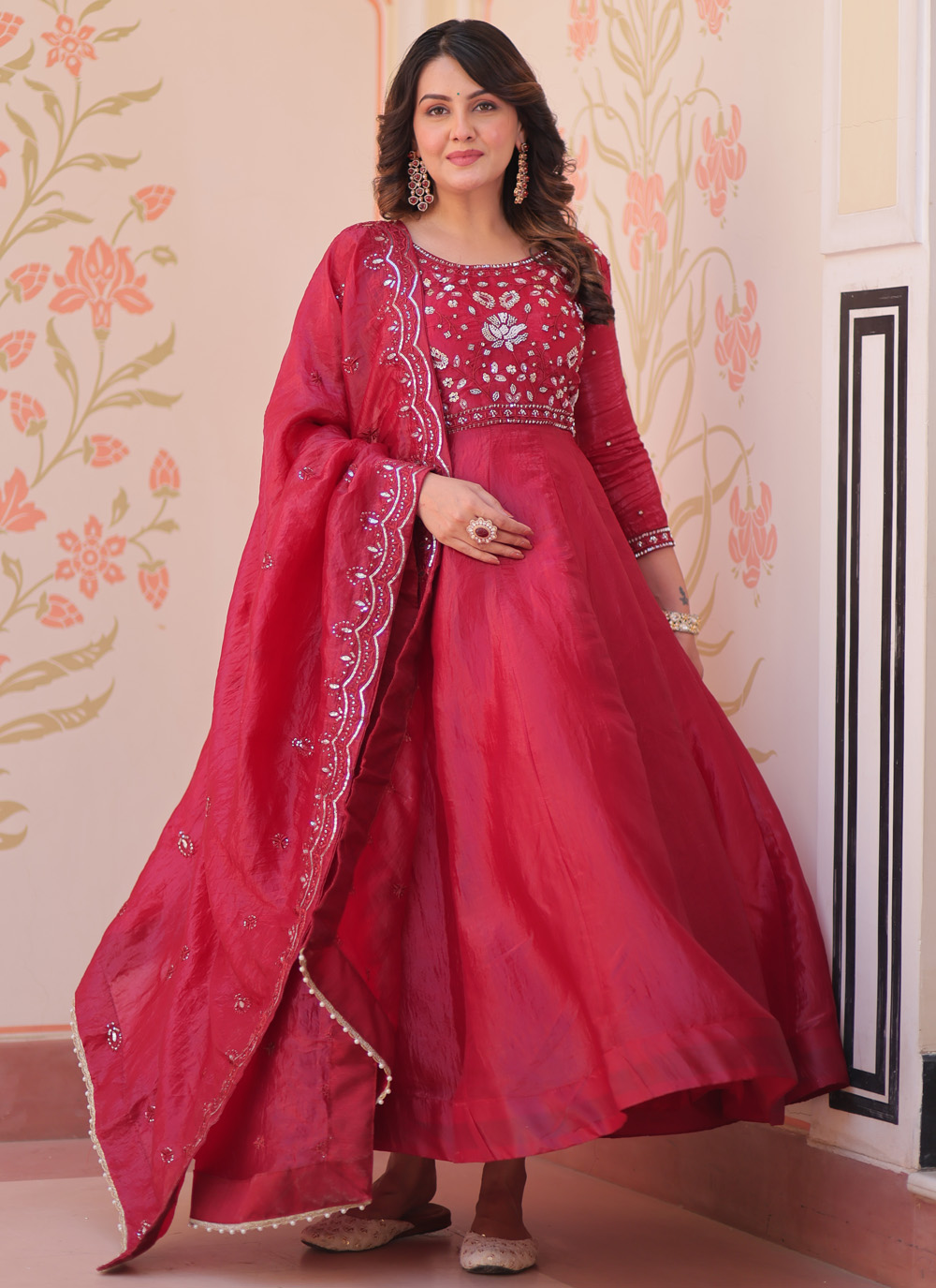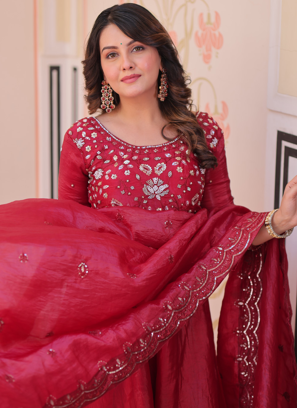 This maroon embroidered readymade gown showcases intricate beadwork combined with elegant sequin detailing. The soft crush fabric adds depth and charm, creating a refined festive outfit. Comes with matching dupatta.