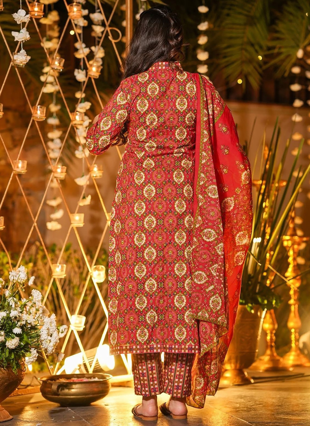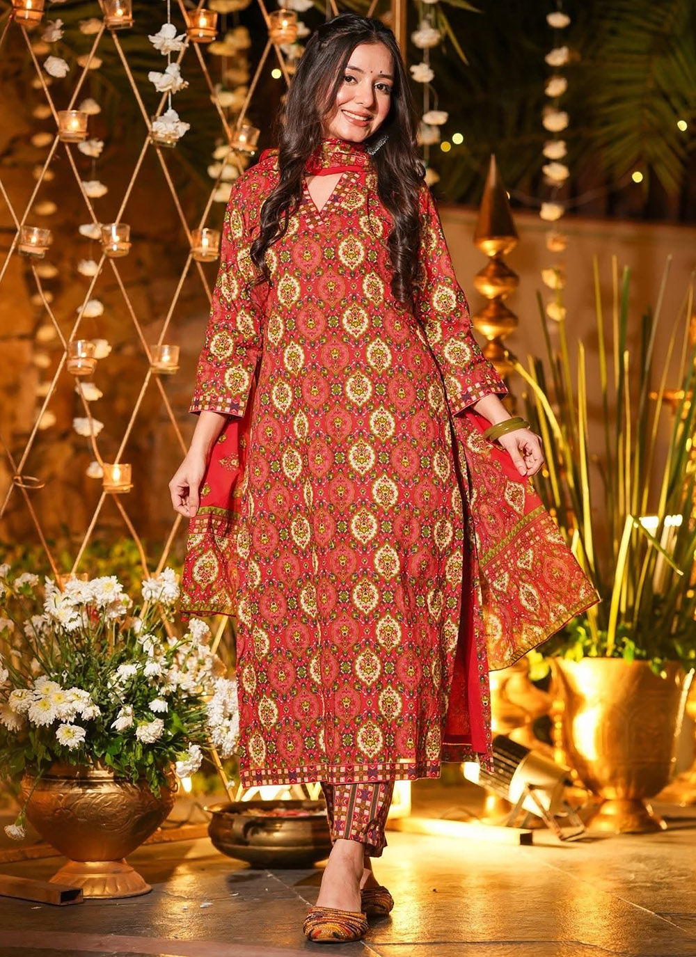 This maroon muslin pant style salwar suit offers a modern ethnic look with its stylish digital print design. The soft and breathable fabric ensures comfort, making it perfect for daily wear and casual occasions. Comes with matching bottom and dupatta.