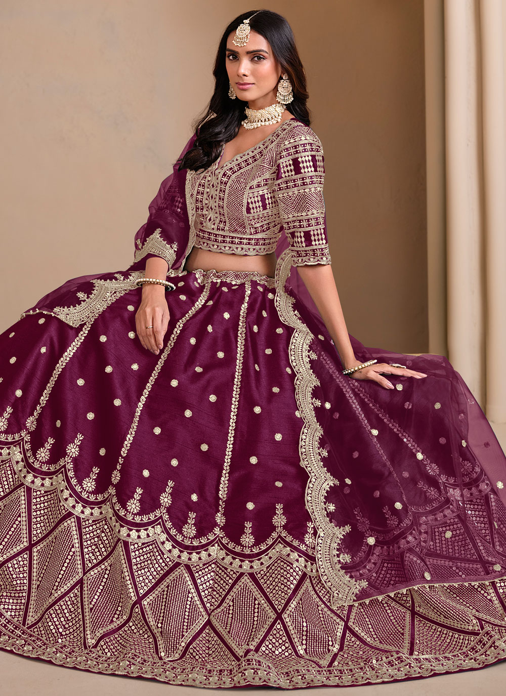 The Maroon Embroidered Mirror Work Art Silk Lehenga Choli features exquisite mirror work embroidery on rich art silk fabric, offering a luxurious and elegant look. Paired with a matching choli and dupatta, this lehenga choli is perfect for festive occasions, blending tradition with modern flair for a stunning appearance.