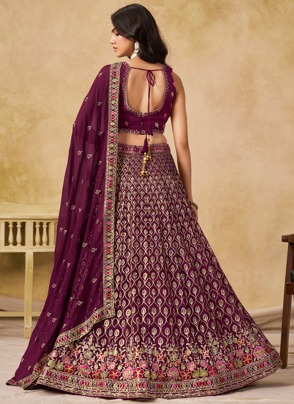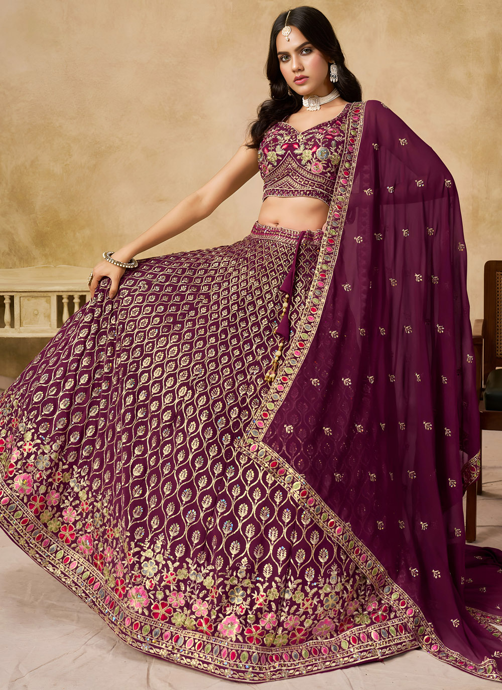 A perfect blend of traditional craftsmanship and modern charm, this maroon sequins and thread embroidered Lehenga Choli makes a striking festive statement. The rich color and ornate detailing make it ideal for ceremonies where you want to stand out gracefully. The ensemble is completed with a stylish choli and designer dupatta. Comes with matching choli and dupatta.