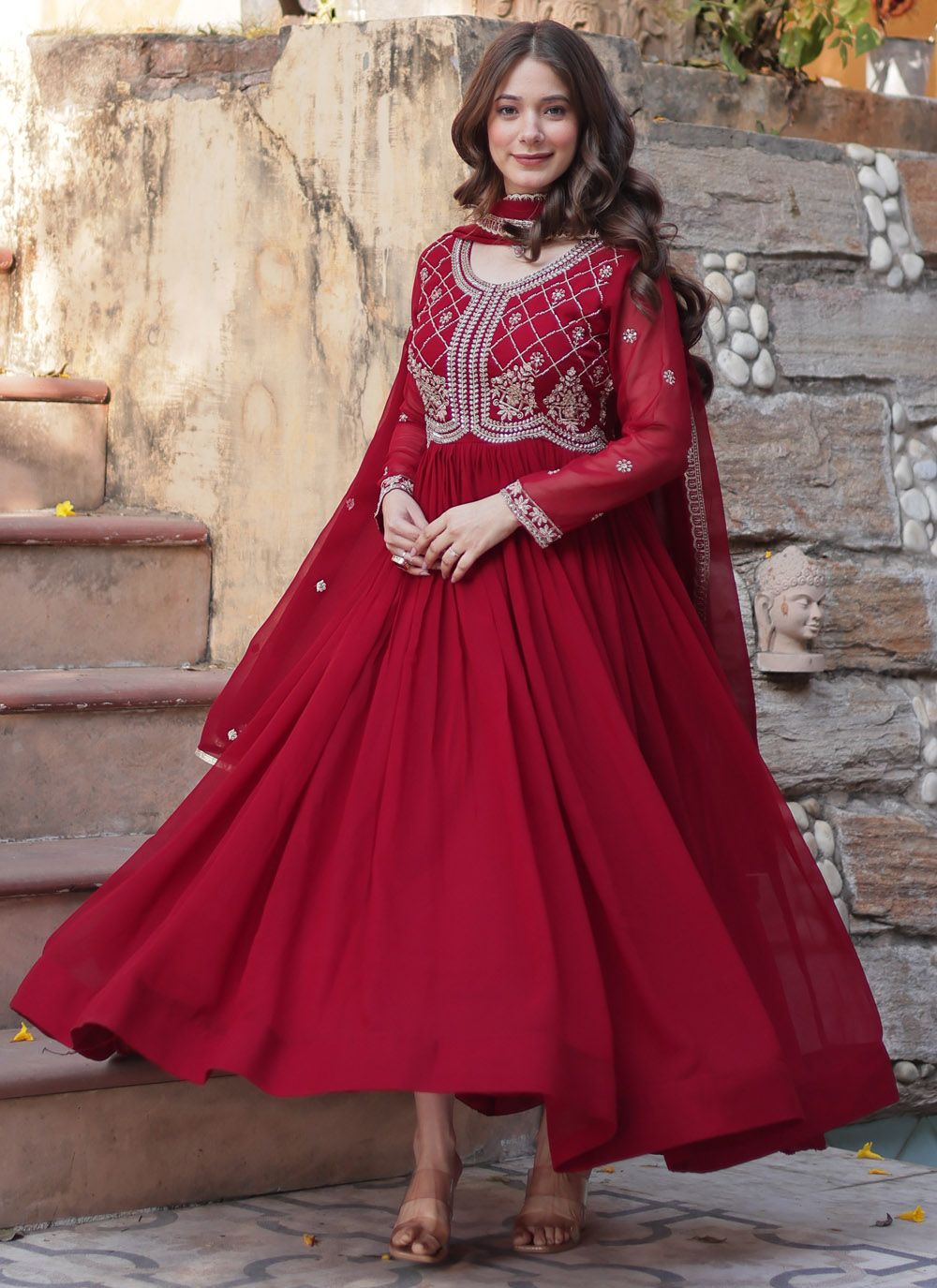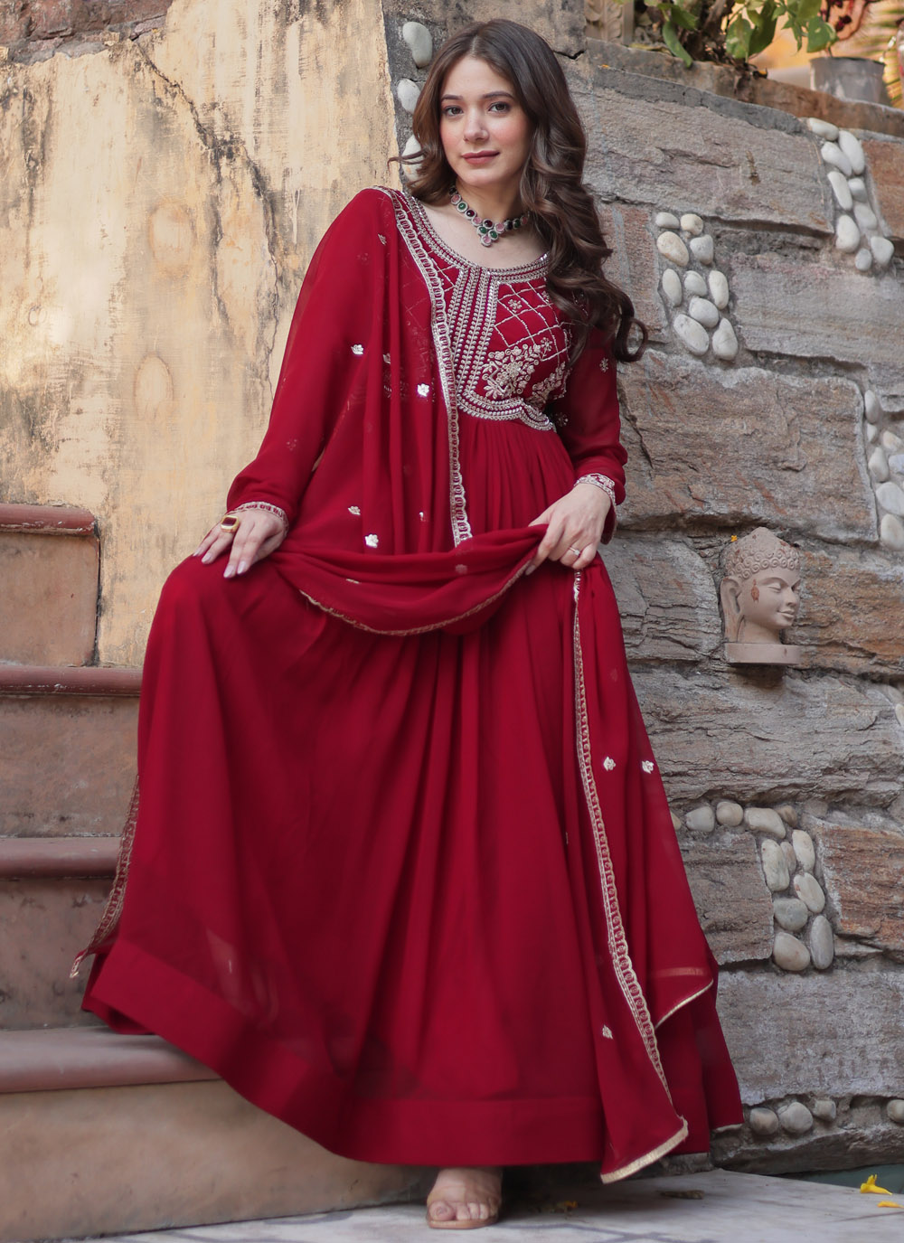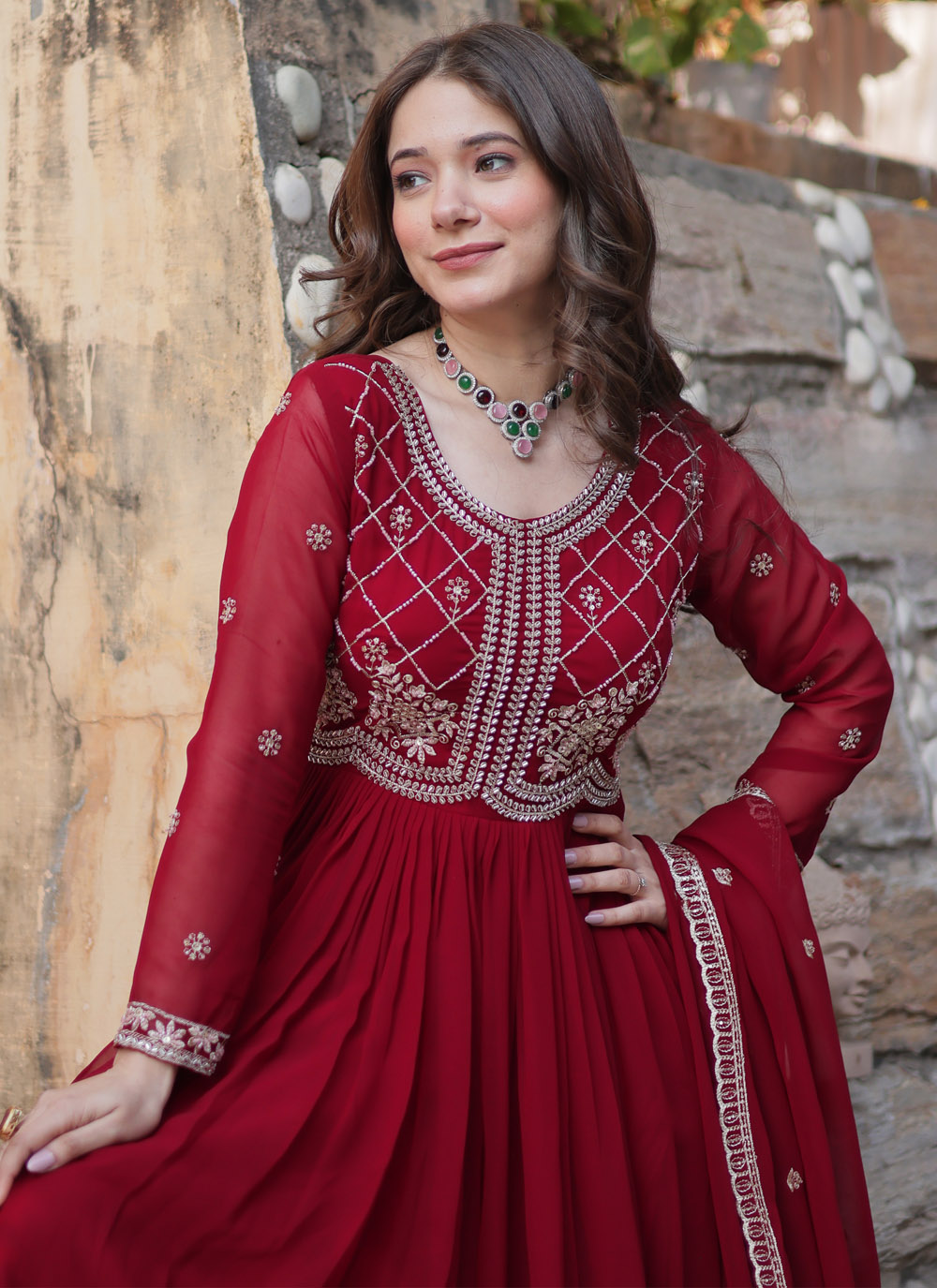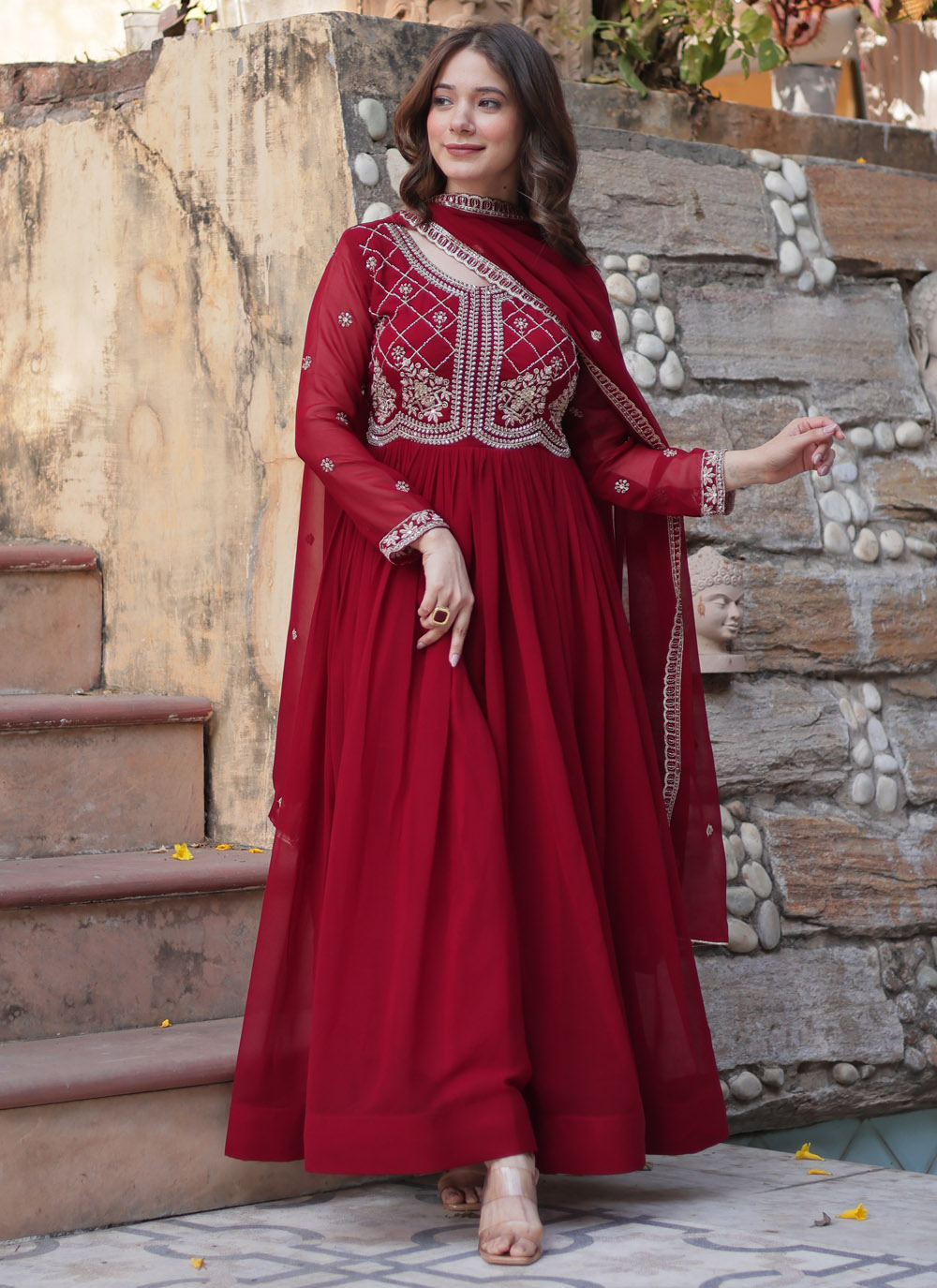 Let your style speak volumes with this exquisitely embroidered maroon gown. The soft georgette drapes beautifully, while the intricate bead and sequin embellishments add a modern yet royal touch to your festive wardrobe. Comes with matching dupatta.