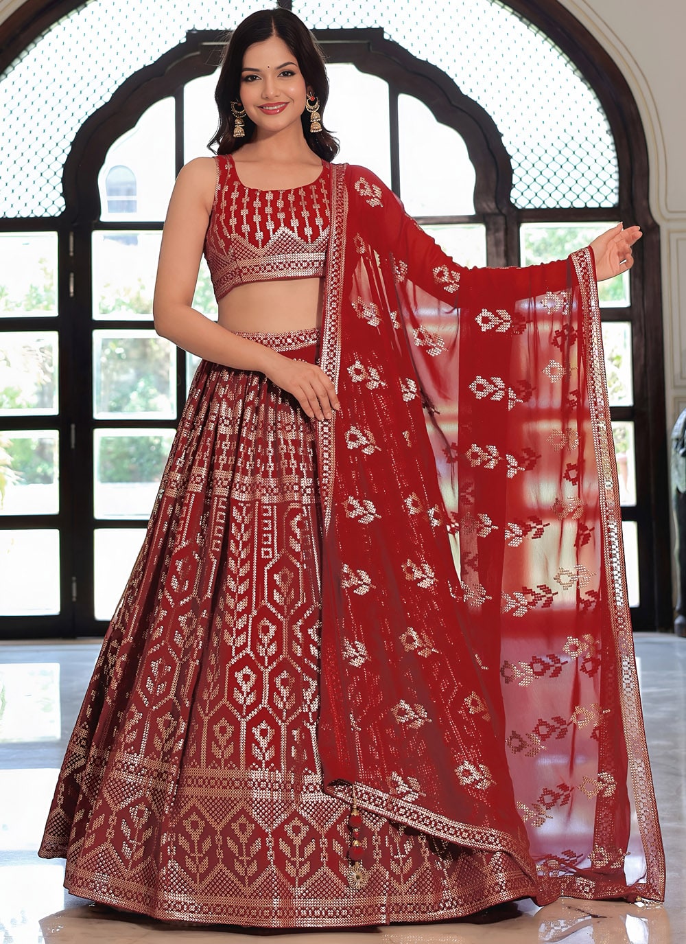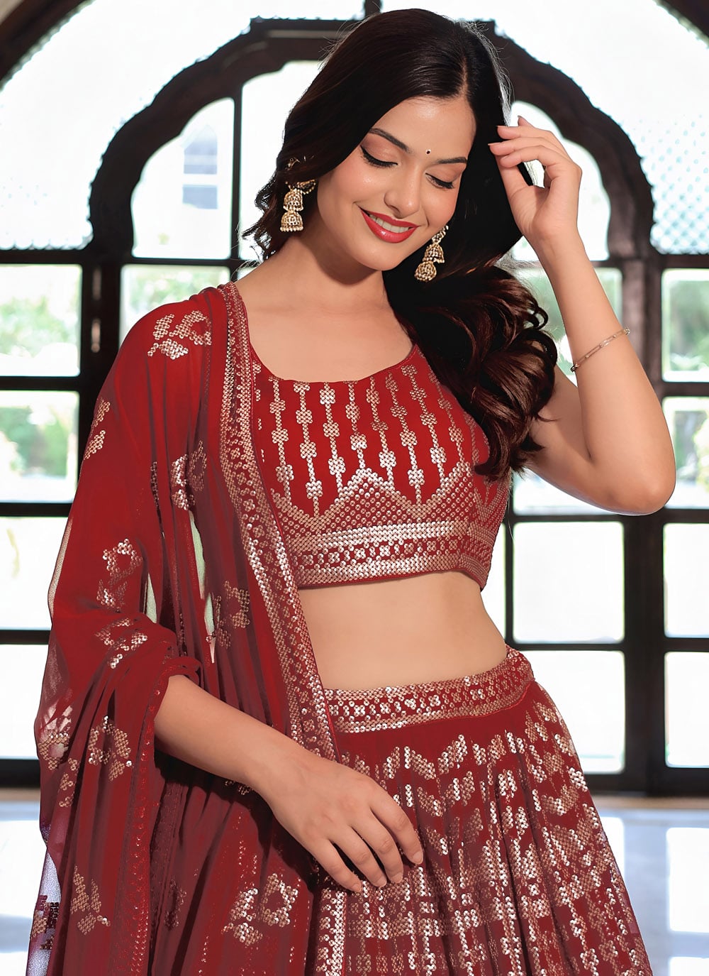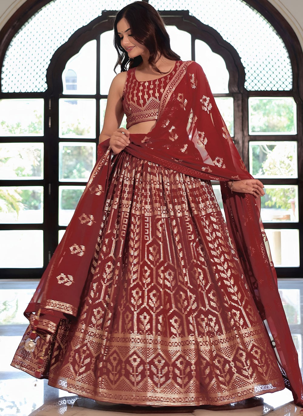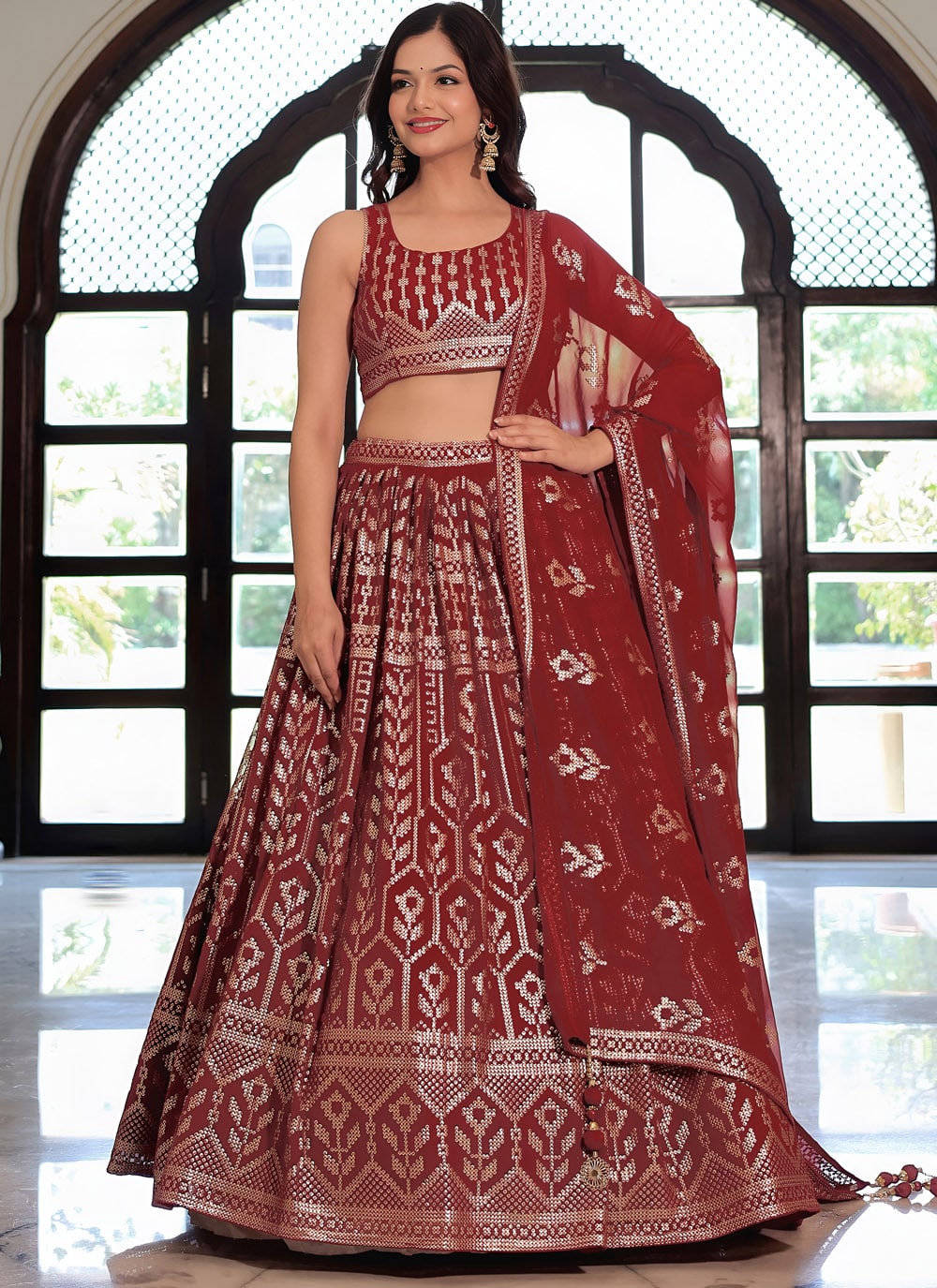Step into celebration-ready elegance with this Maroon Trendy Lehenga Choli, crafted from premium georgette and highlighted with sequins and thread embroidery. A perfect choice for weddings, receptions and festive gatherings. Comes with matching choli and dupatta.