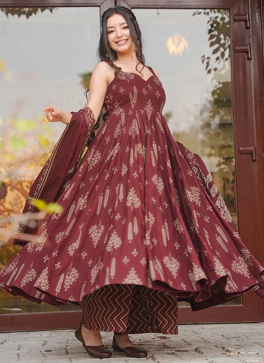 This maroon muslin digital printed readymade salwar suit combines traditional charm with contemporary design. The premium muslin fabric ensures comfort and durability, while the detailed digital prints enhance its stylish appeal. Comes with matching bottom and dupatta.