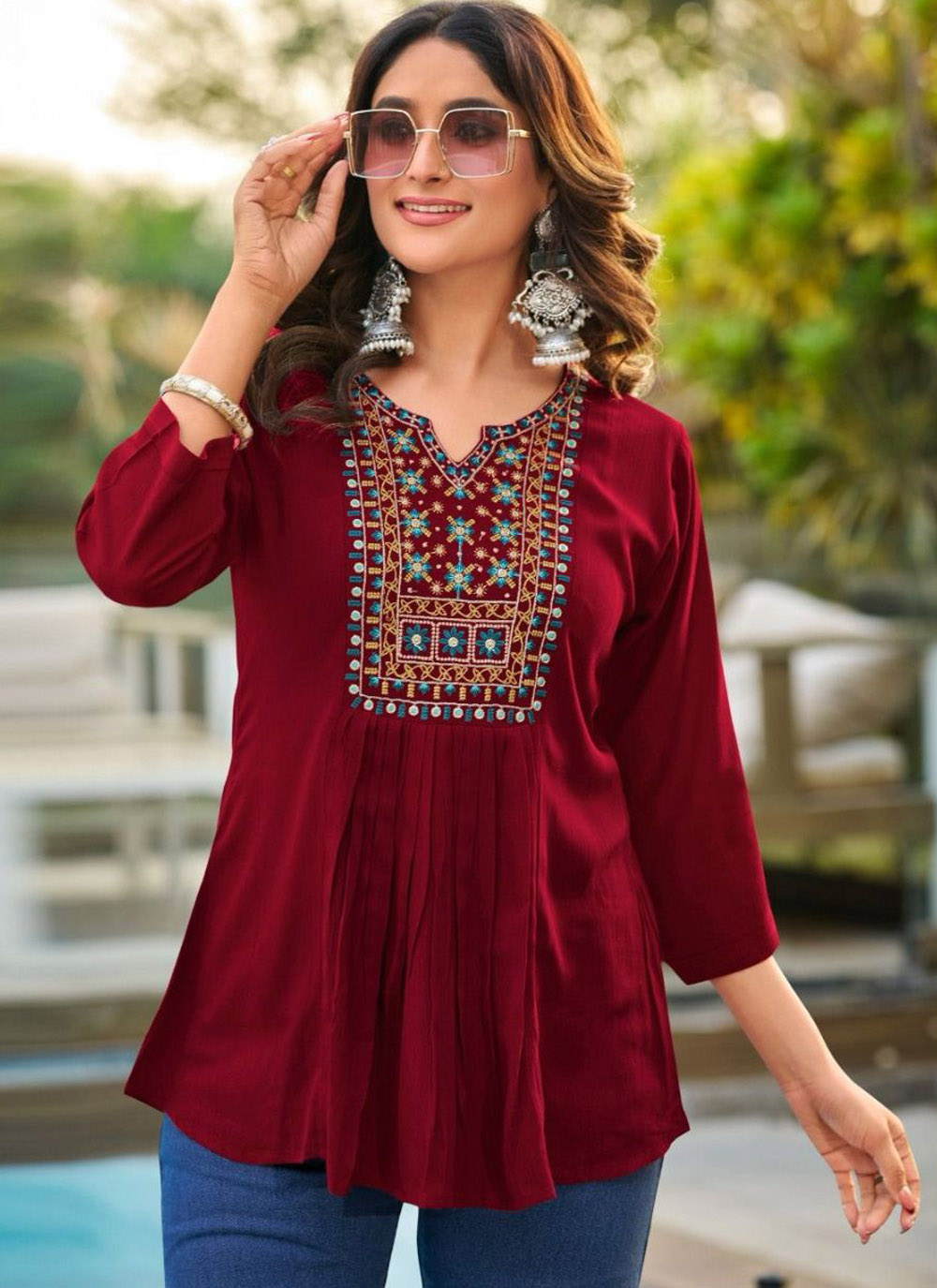 Step into style with this Embroidered Maroon Rayon Kurti, a must-have for fashion-forward women. Designed for both casual and semi-formal occasions, this kurti pairs beautifully with leggings, palazzos, or jeans.