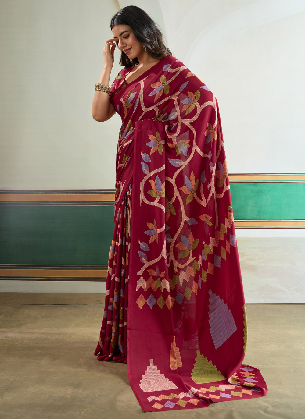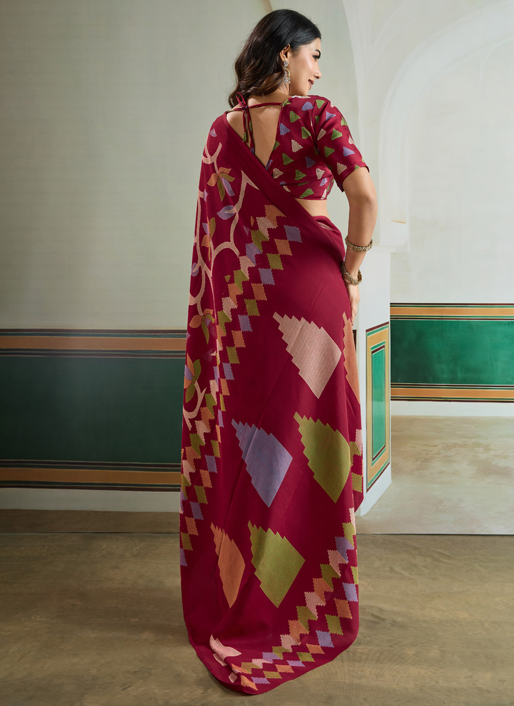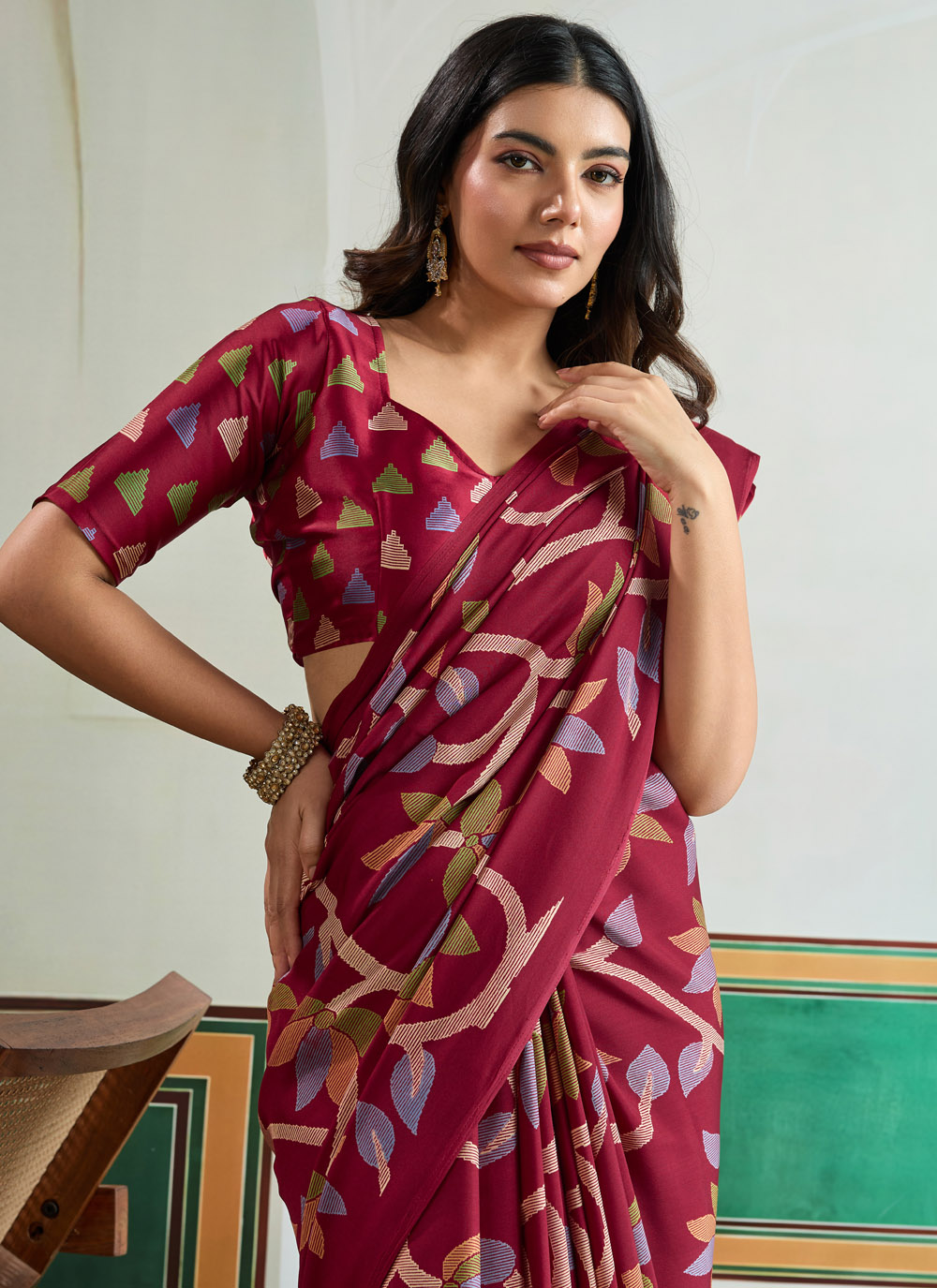 This maroon satin saree features elegant printed designs that add a modern trendy touch. The smooth satin fabric offers a graceful drape, making it perfect for parties and festive occasions. Comes with matching blouse.