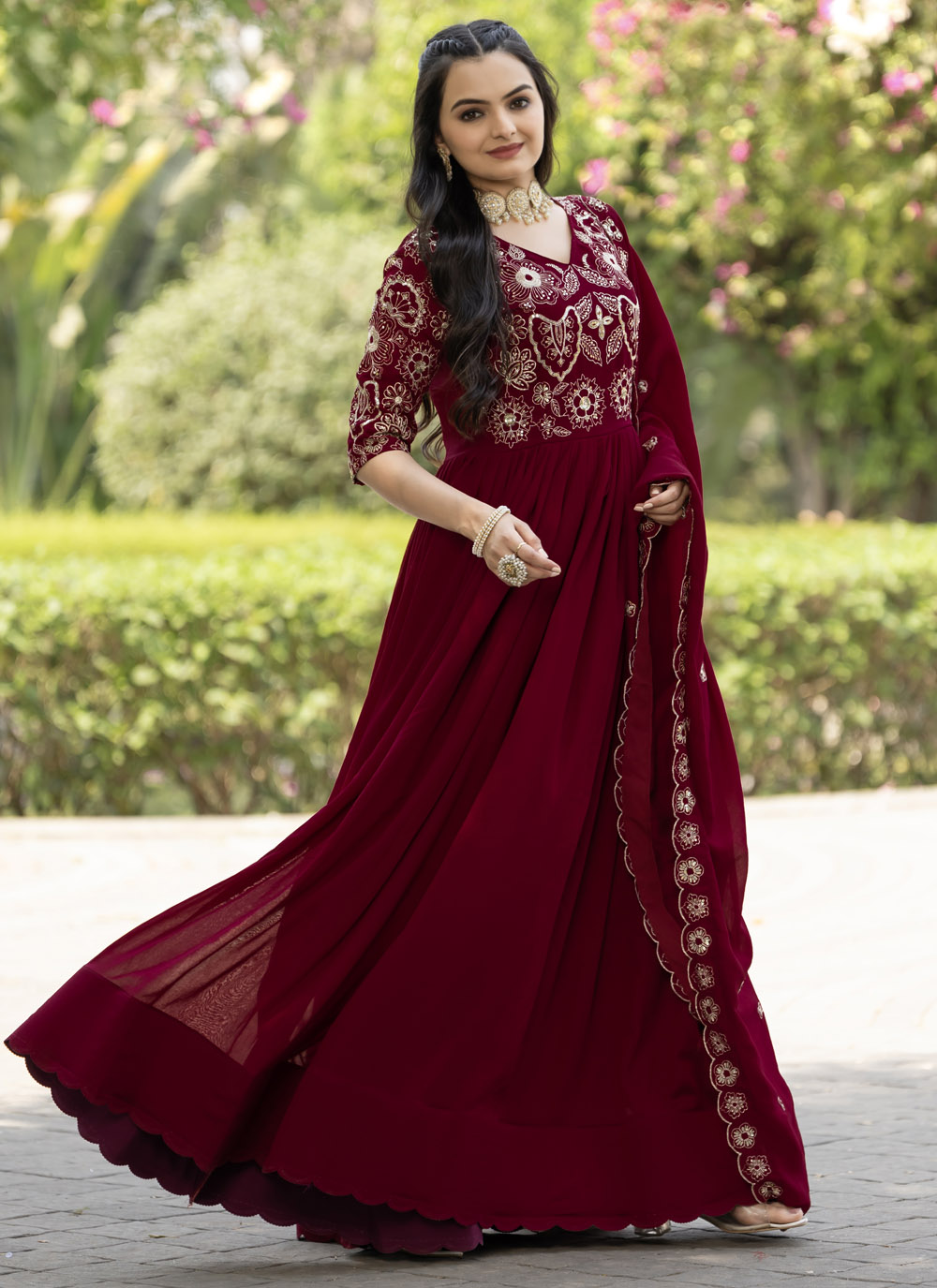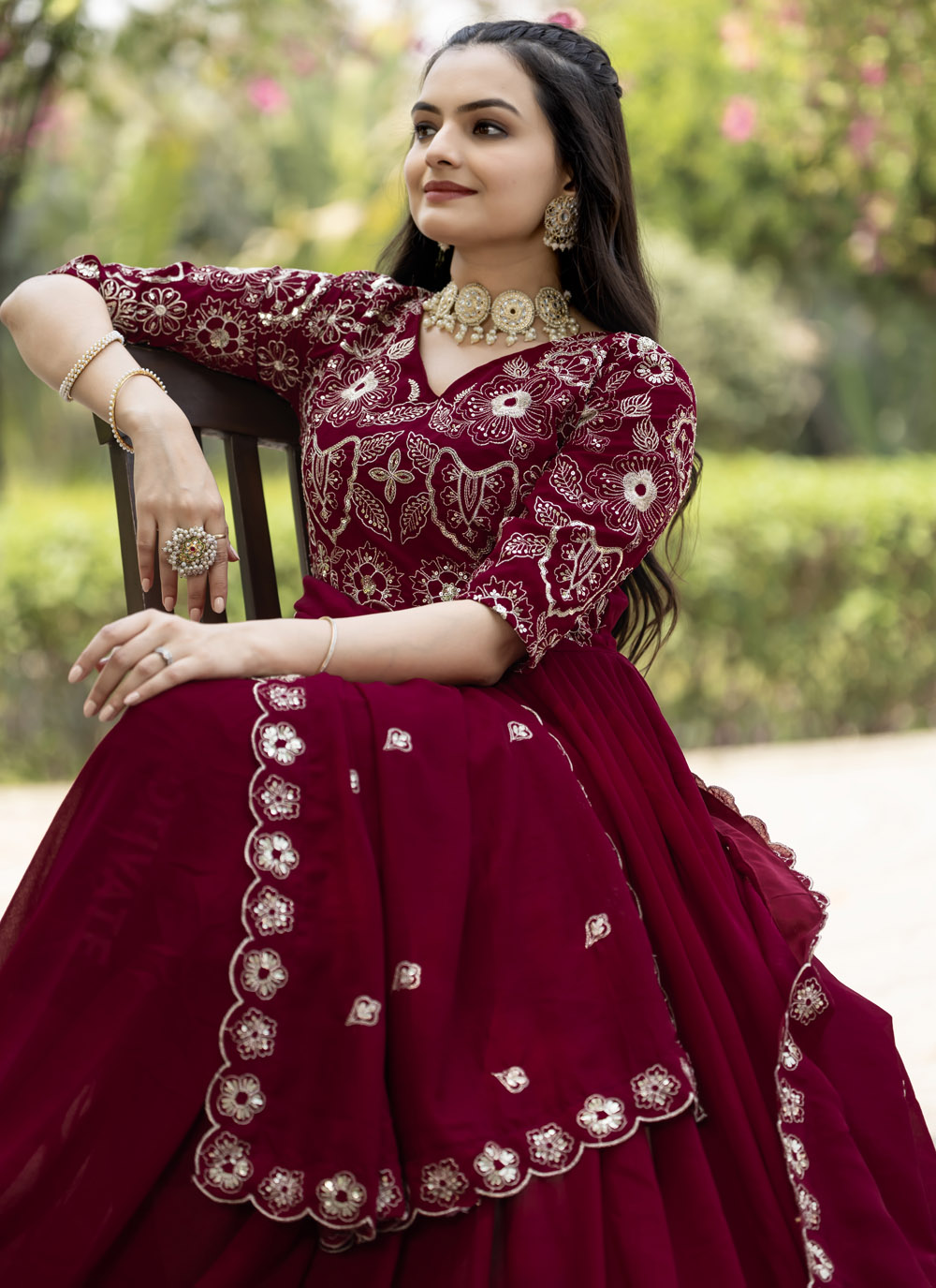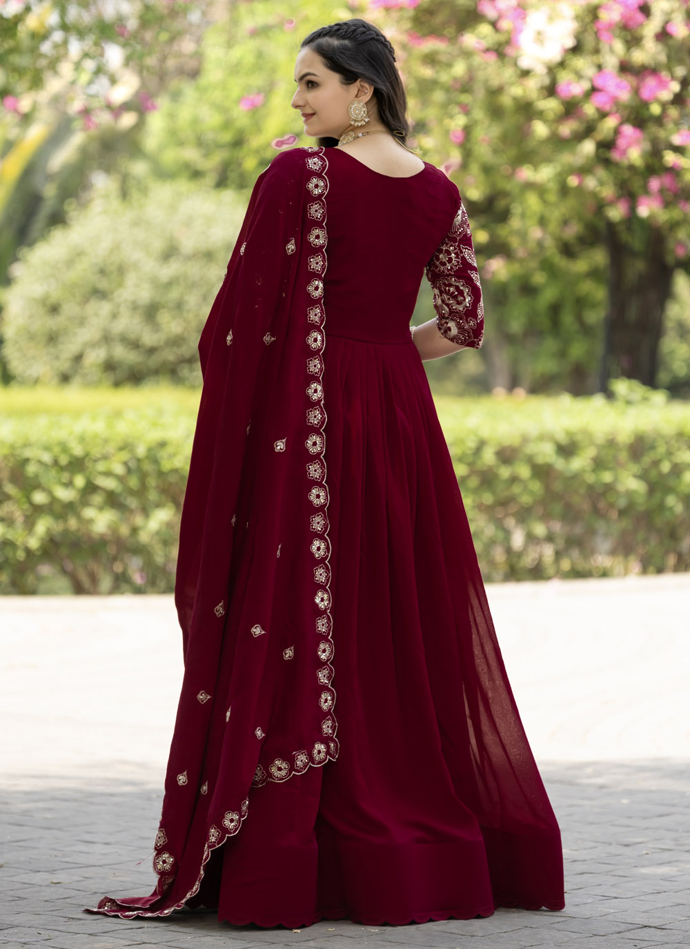 Celebrate every moment in style with this luxurious Maroon Silk Festival Gown, featuring intricate sequins embroidered patterns. The perfect choice for festive soirées, weddings, and special occasions where elegance meets glamour. Comes with matching dupatta.